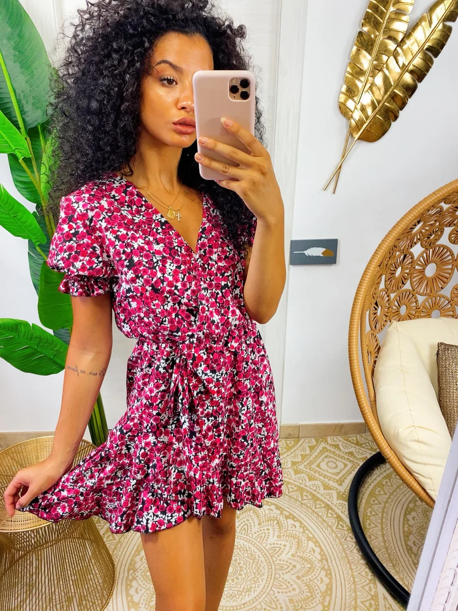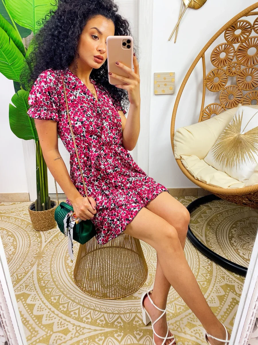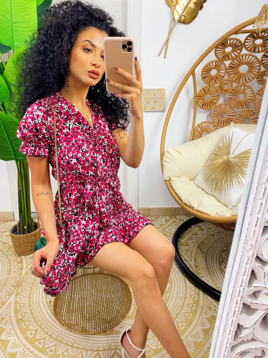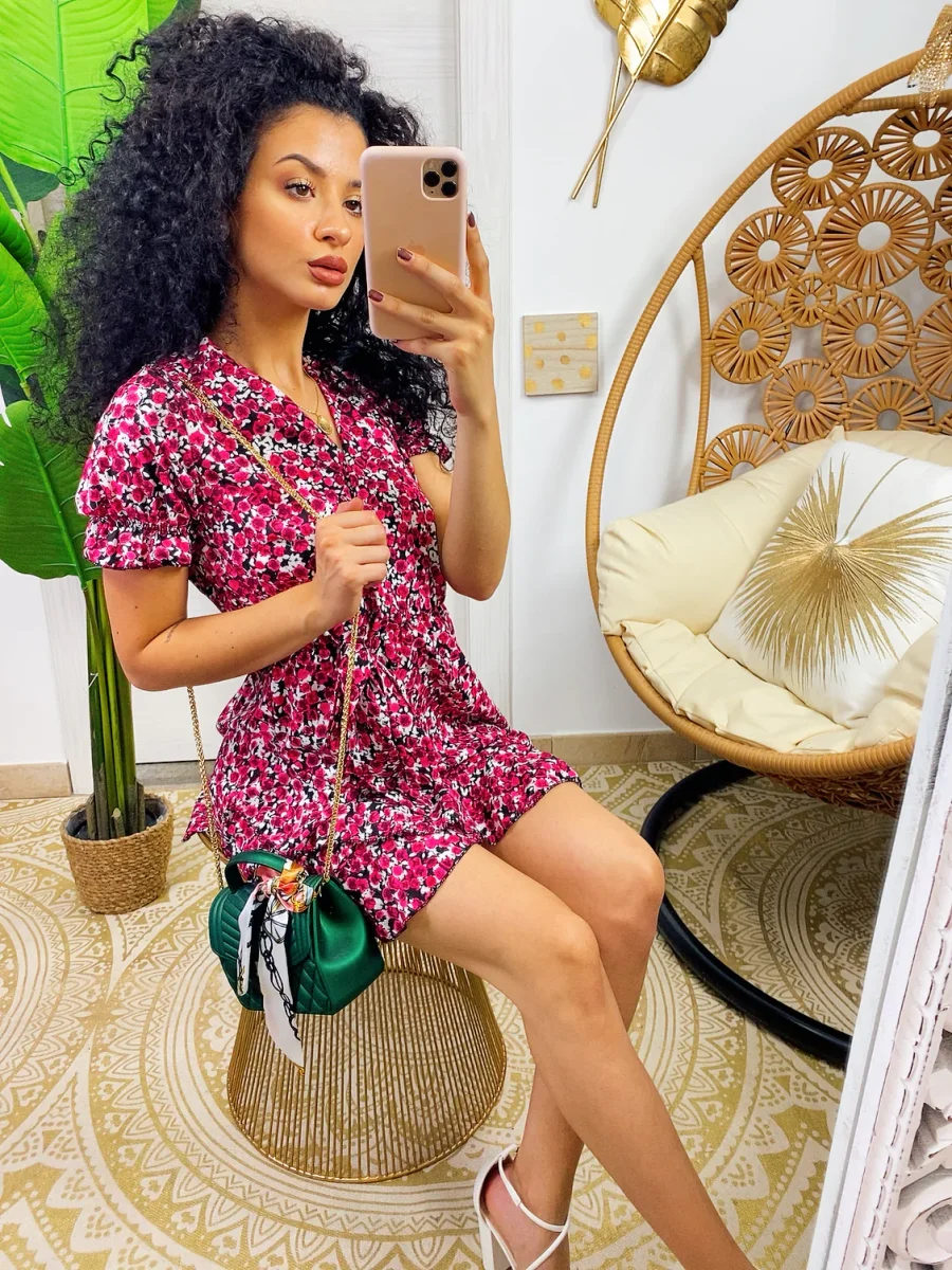Abito a manica corta con sbuffo e rouge sul davanti. Tessuto leggero e fresco, laccio in vita.