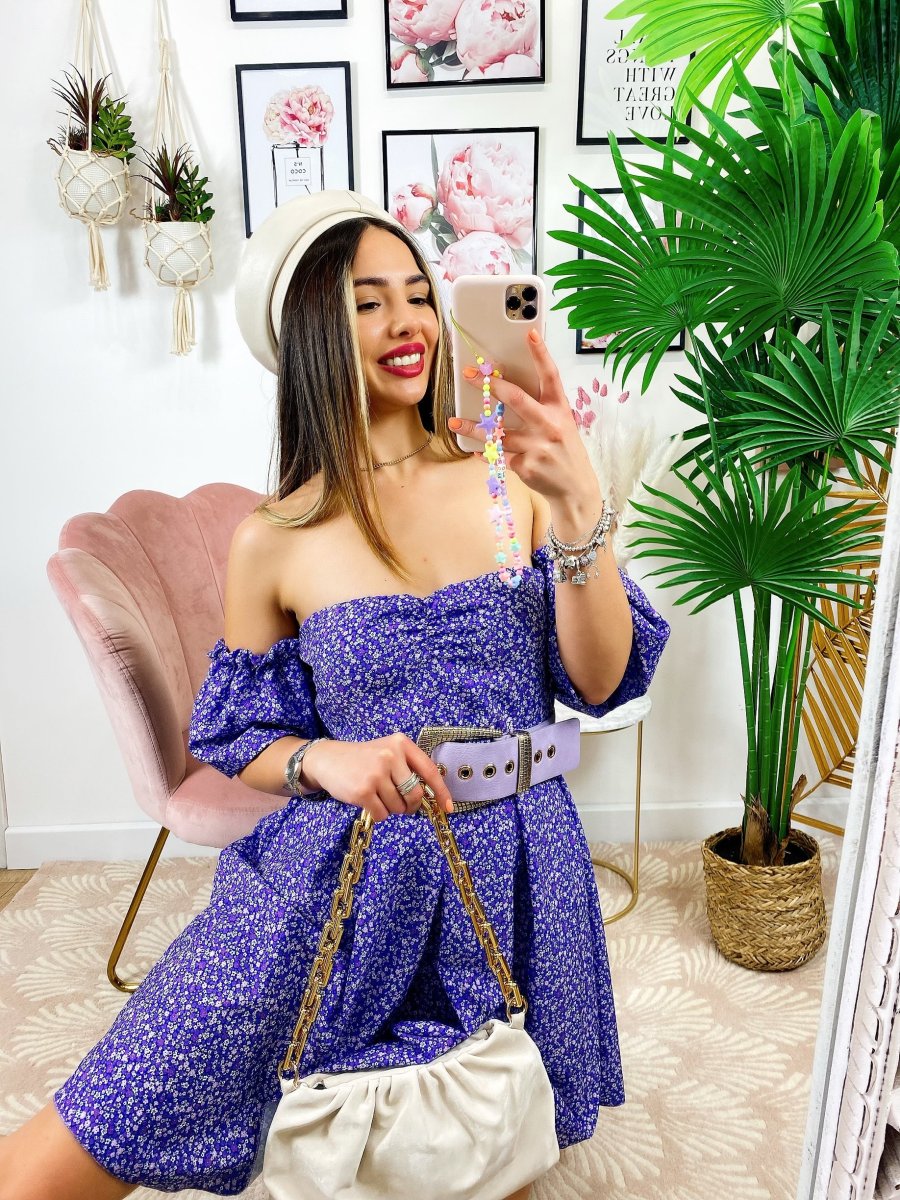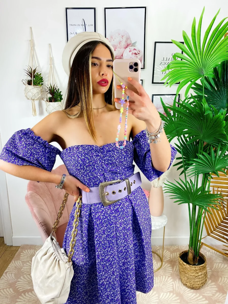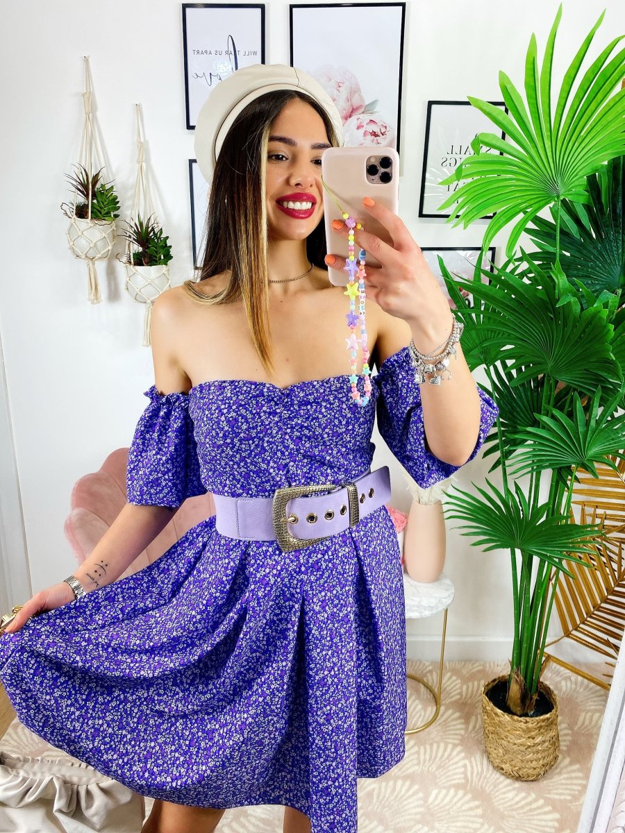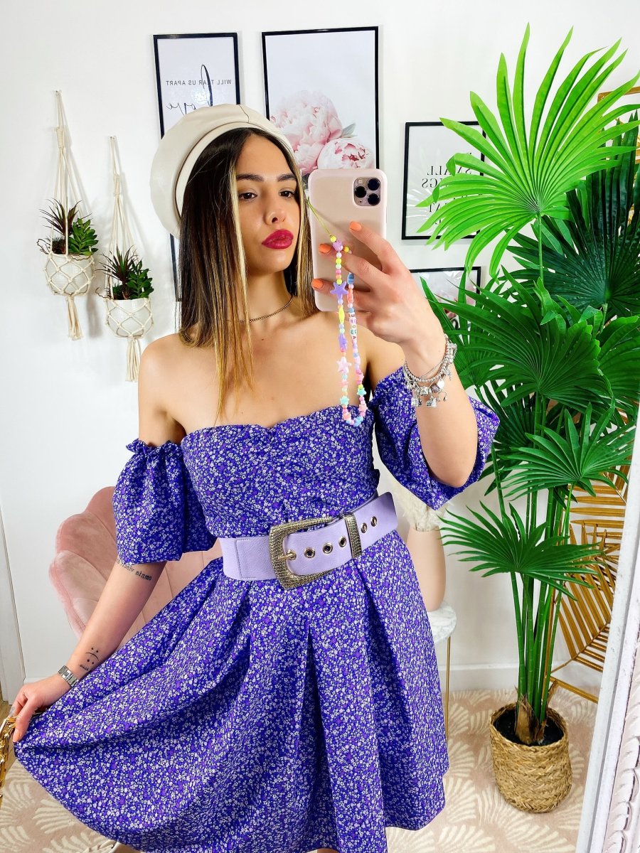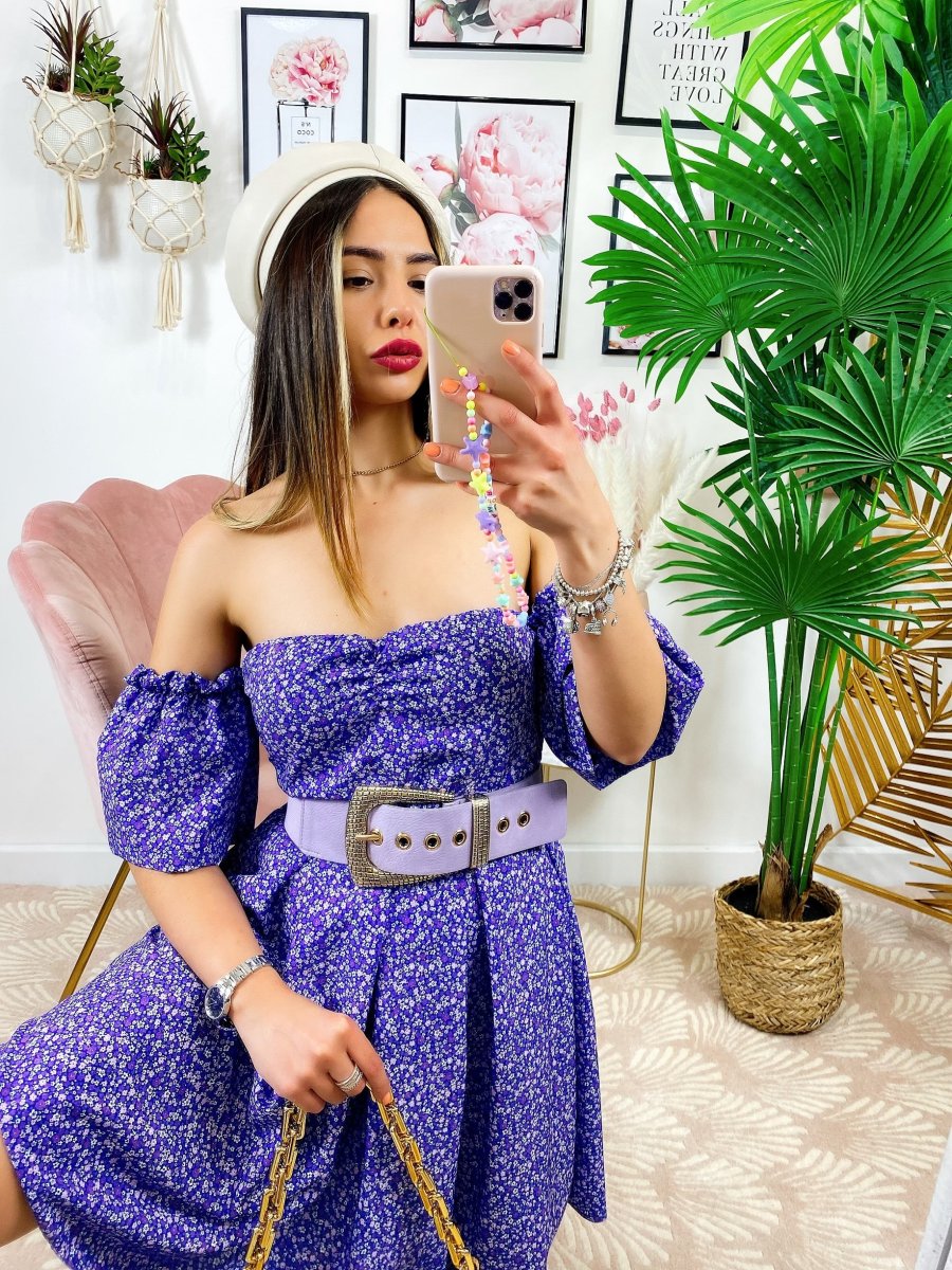 Abito a fiorellini scollo a barchetta Base purple, elasticizzato con manica a palloncino.