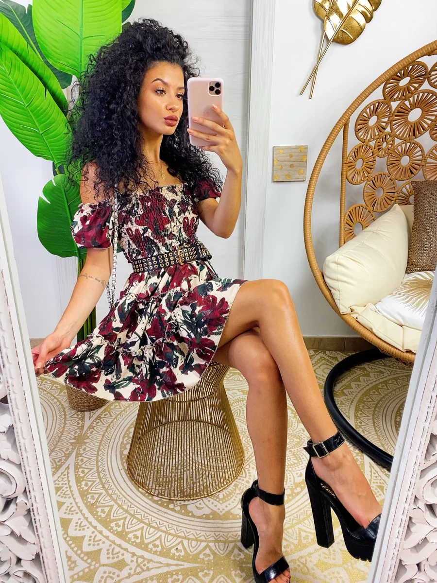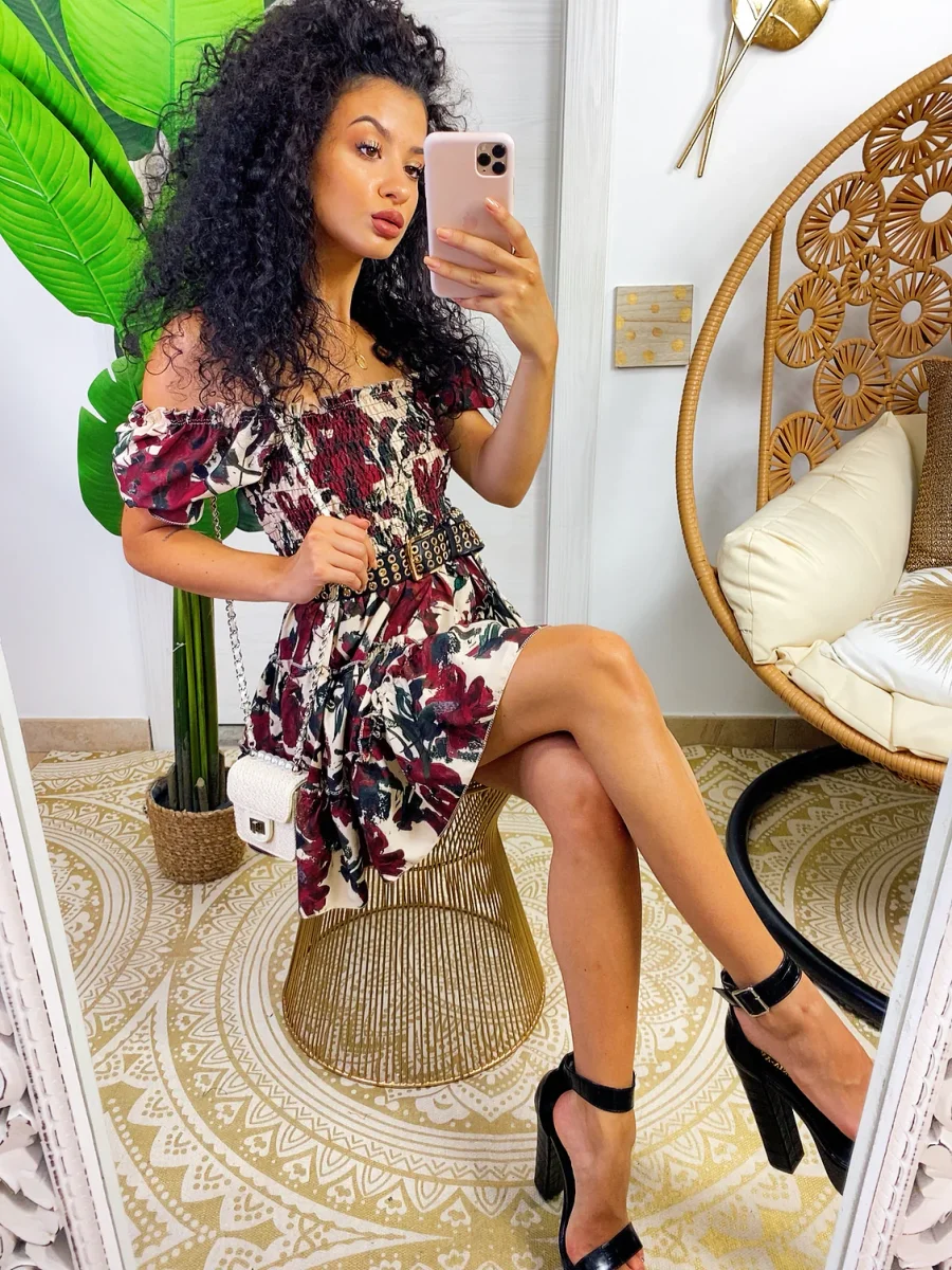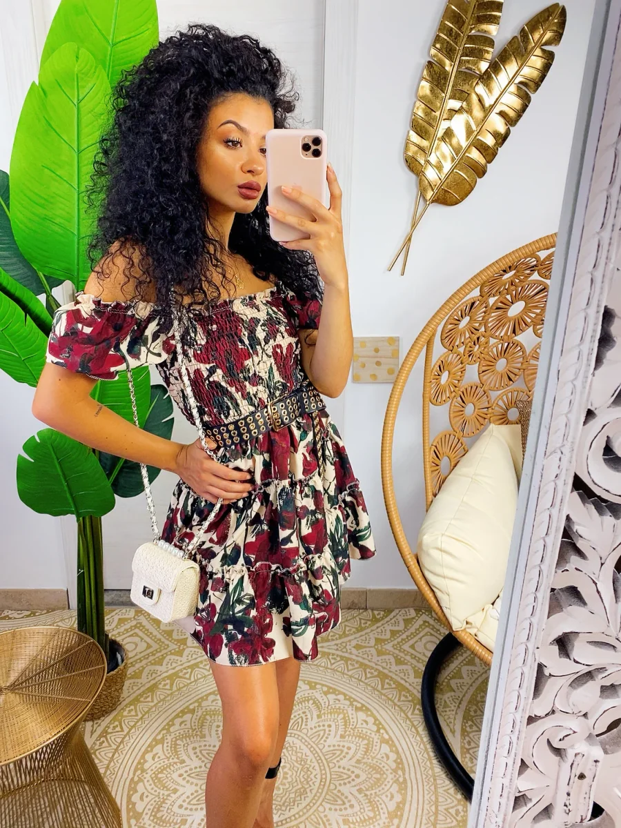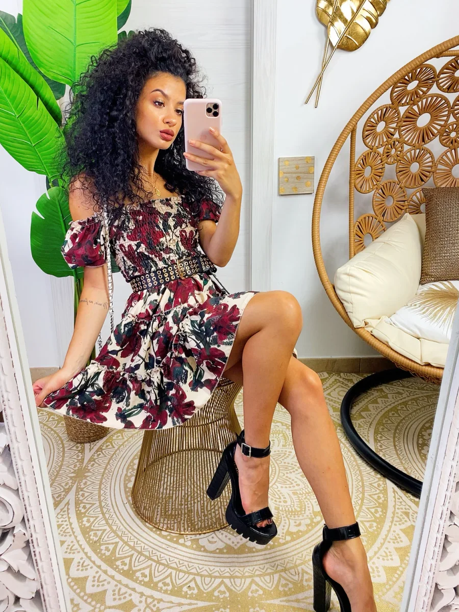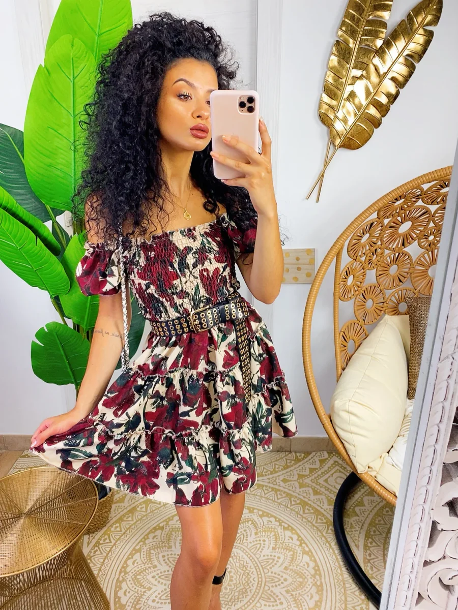 Abito a fiori con scollo a barchetta. Manichina a palloncino e gonna ampia. Tessuto a fiori.