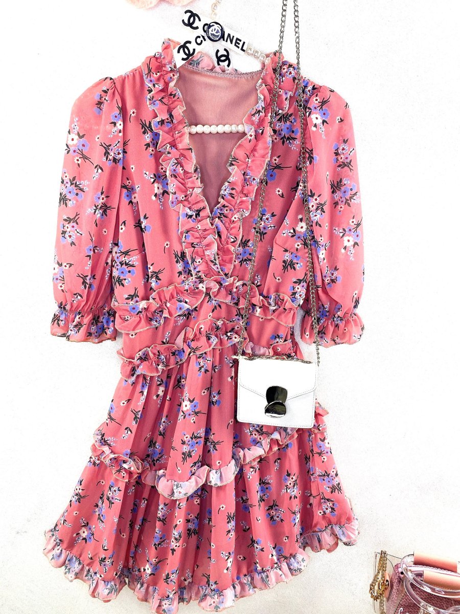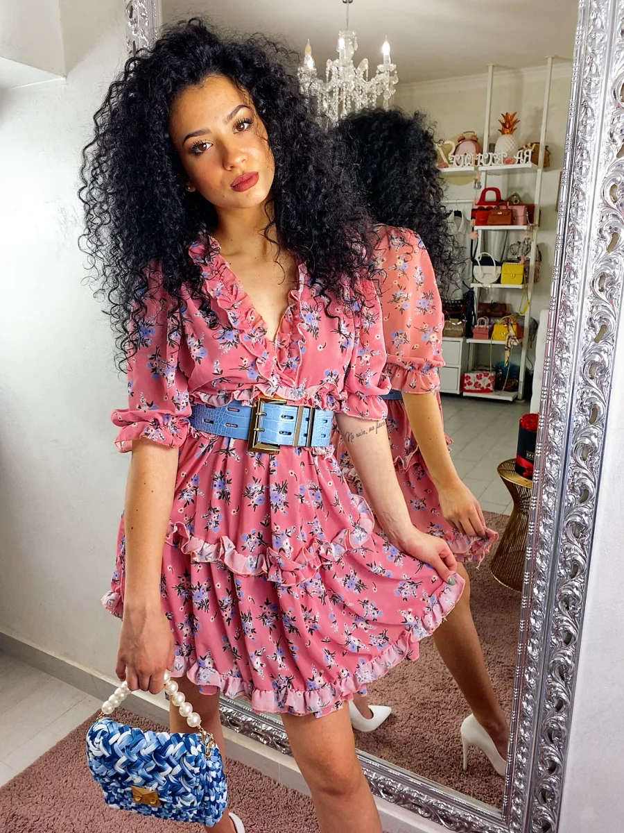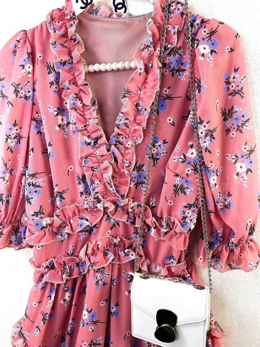 Abito a manica corta con sbuffo e rouge sul davanti e balze. Tessuto leggero e fresco foderato.