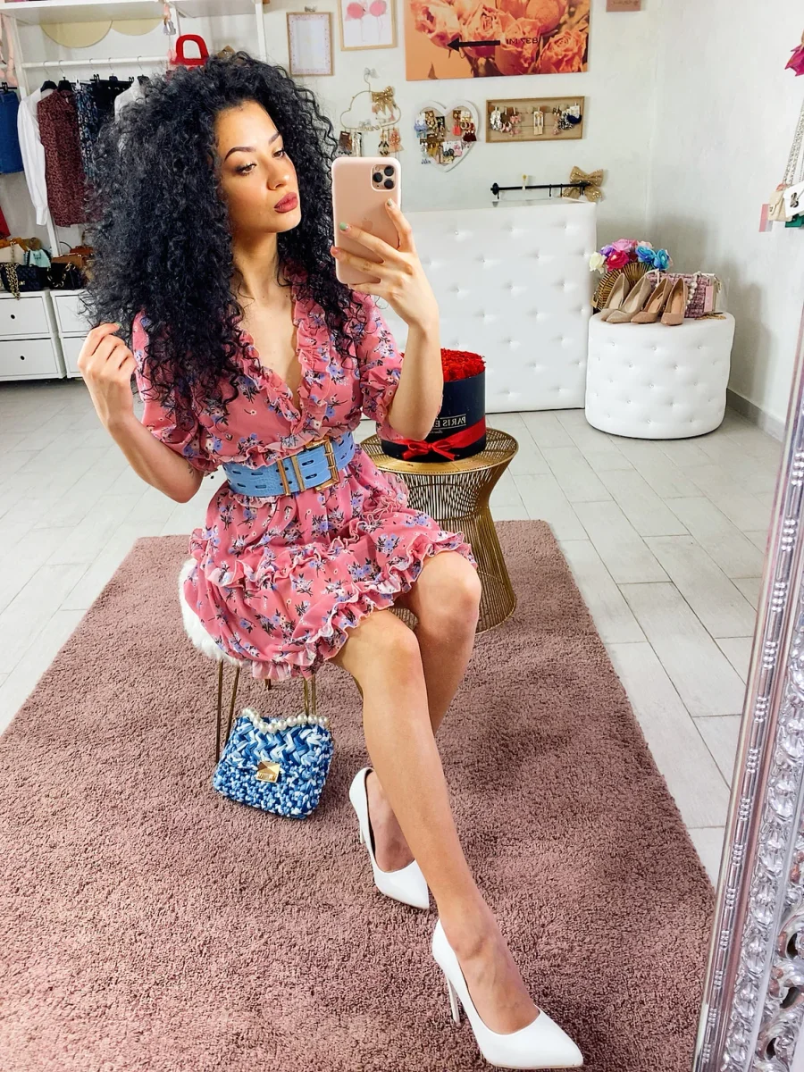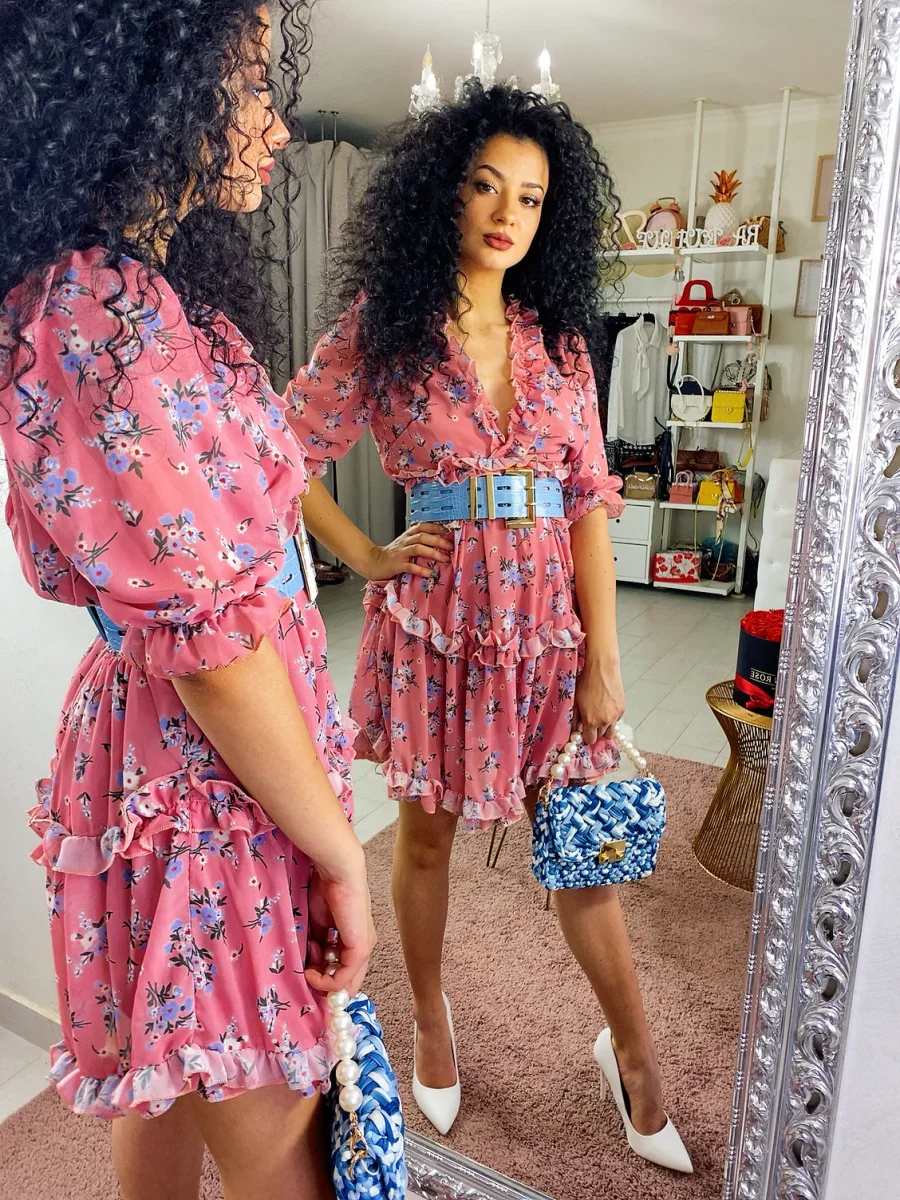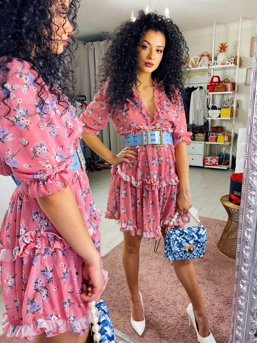 Abito a manica corta con sbuffo e rouge sul davanti e balze. Tessuto leggero e fresco foderato.