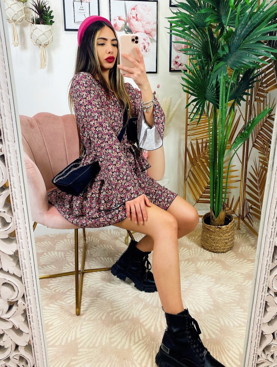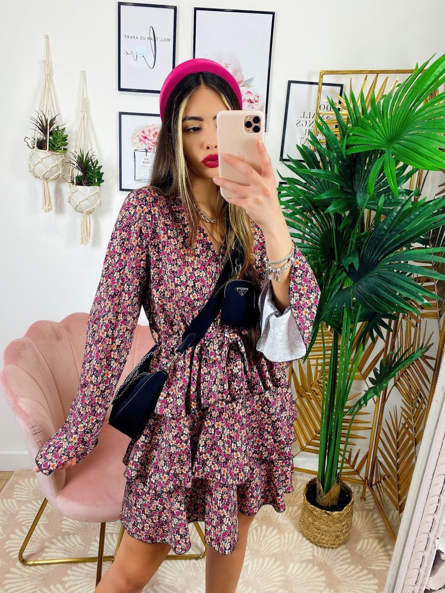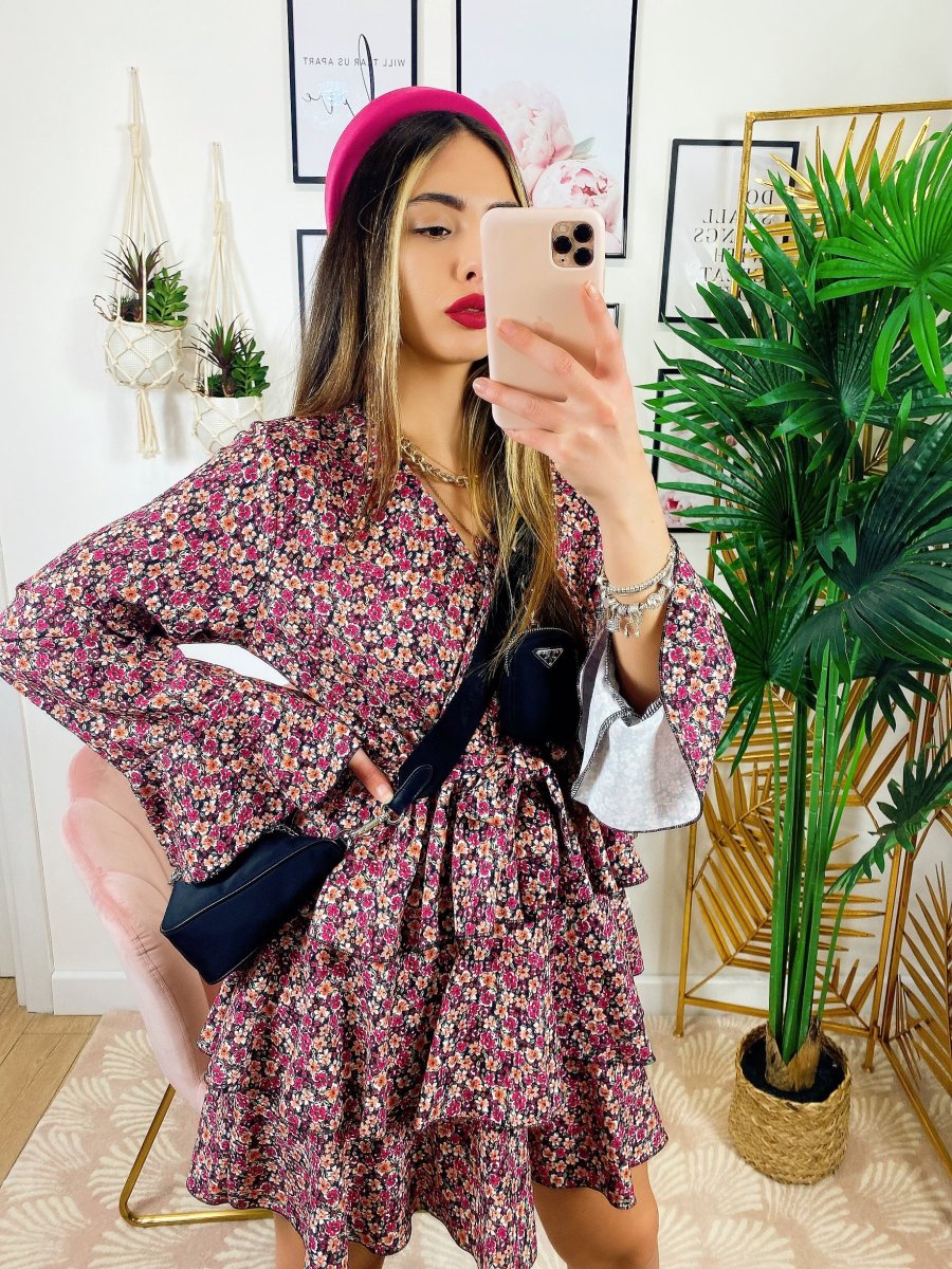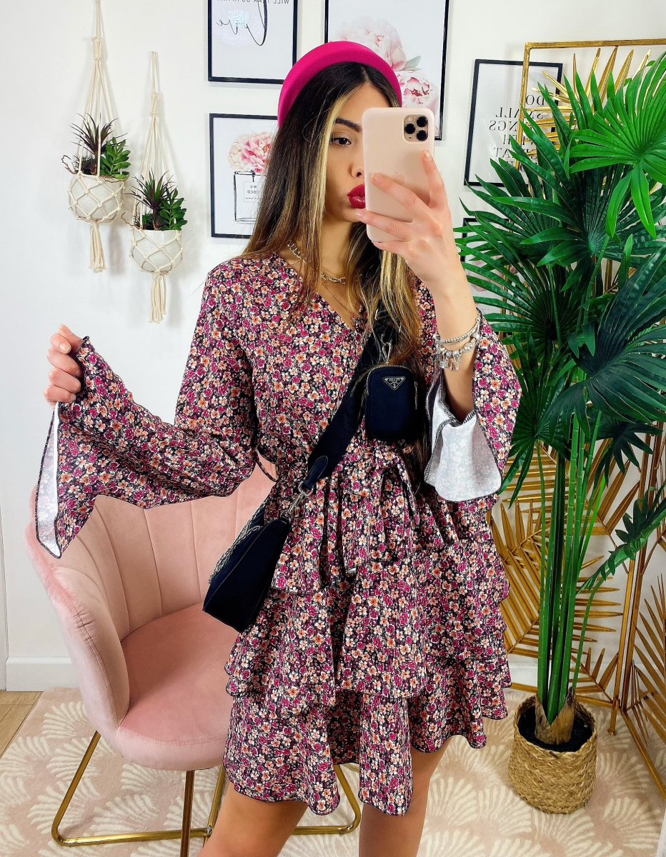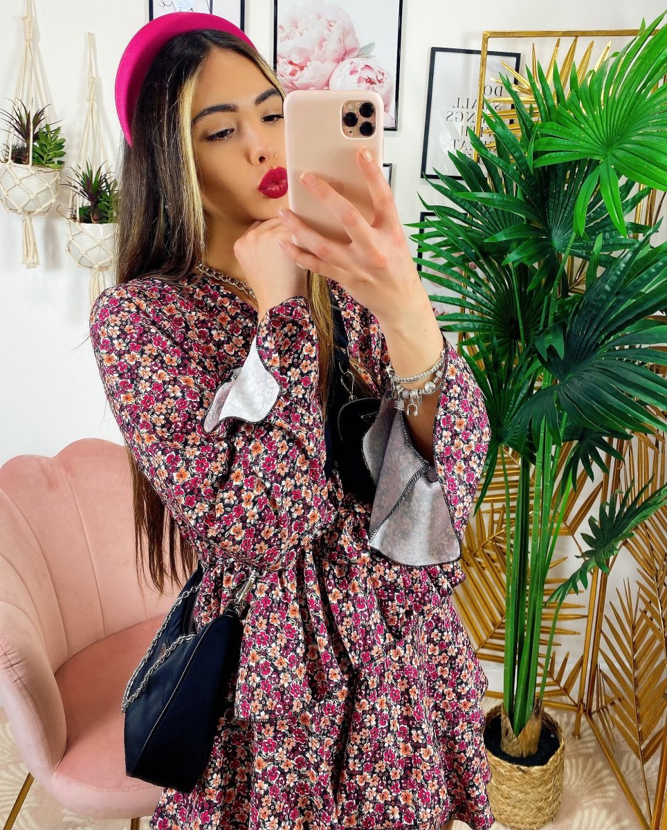 Abito a fiori con balze manica lunga color fucsia, il look giusto primavera estate.