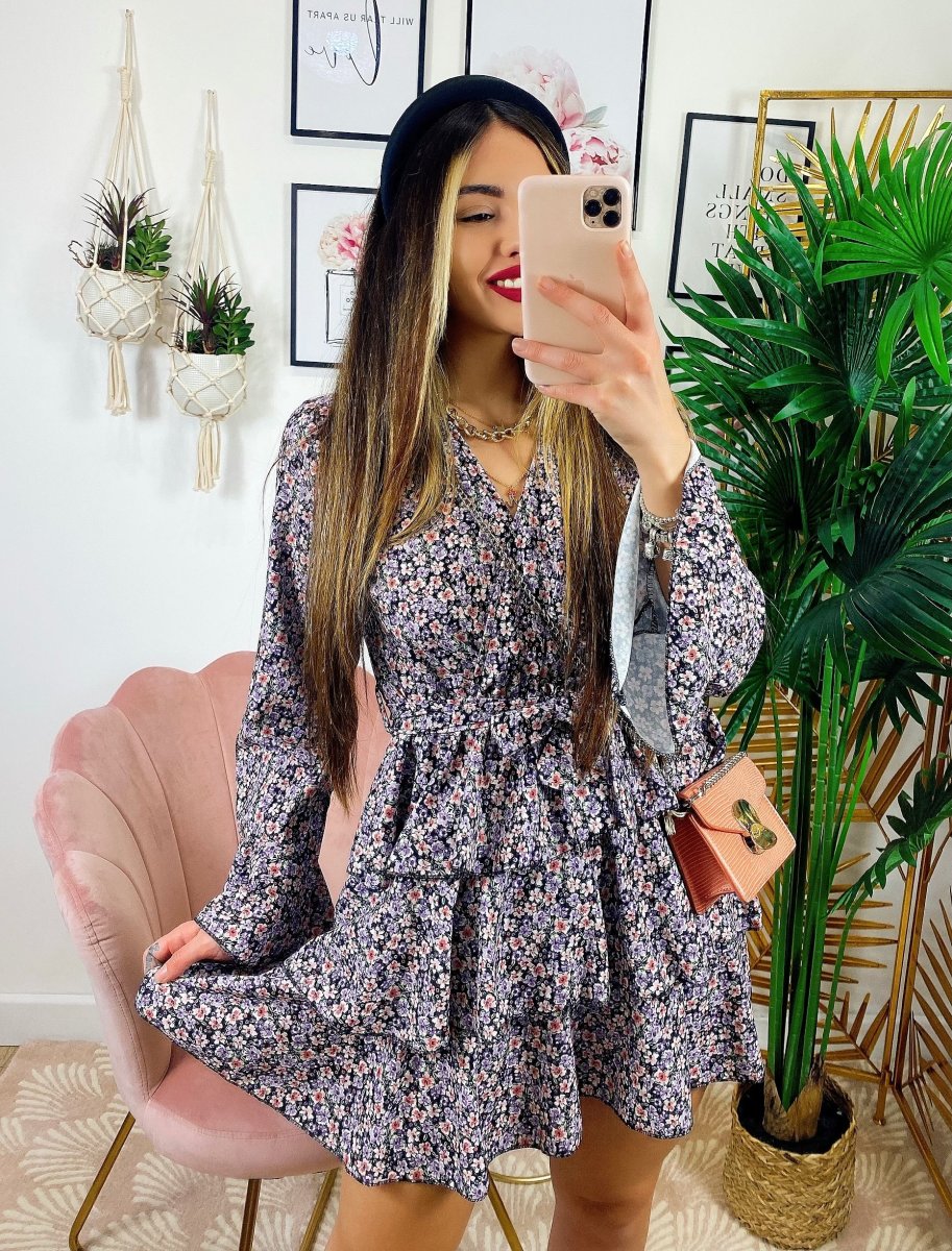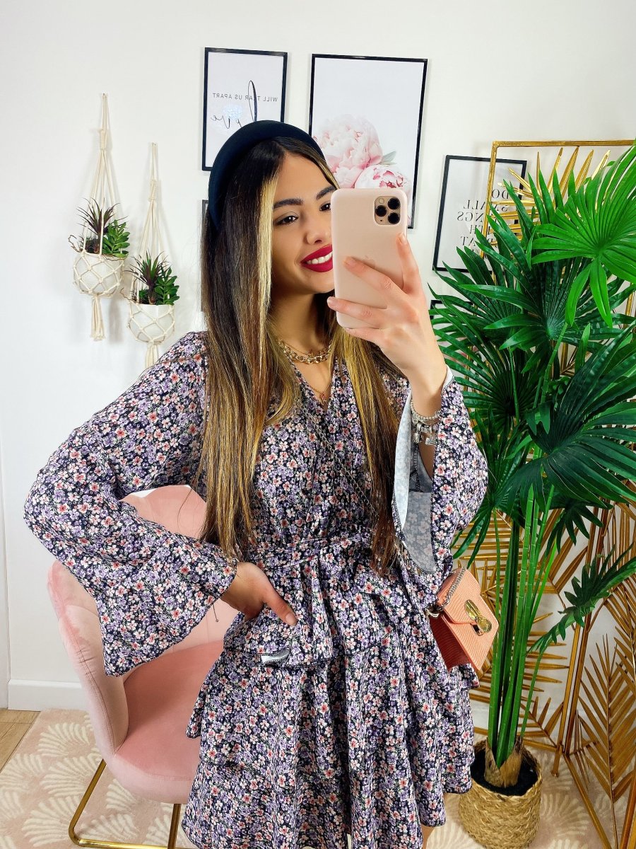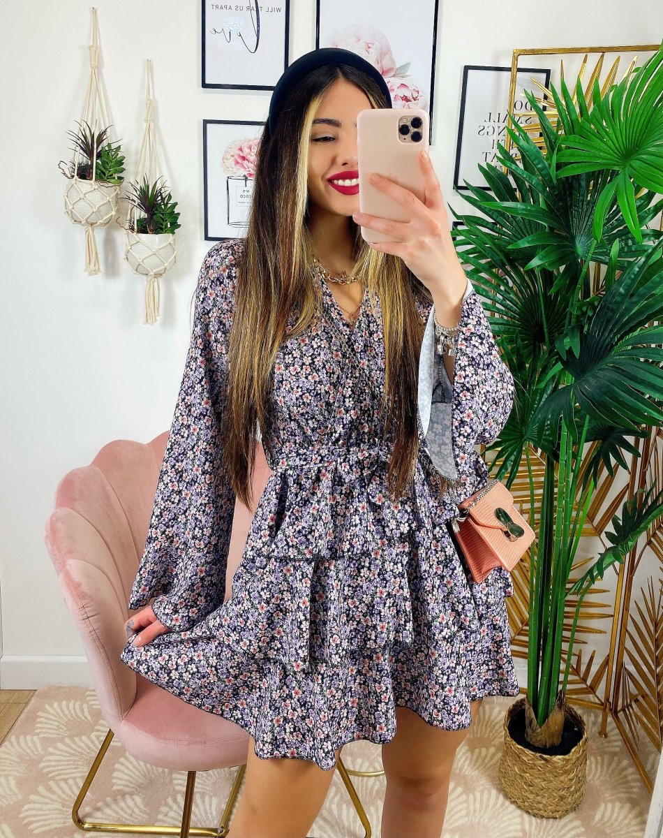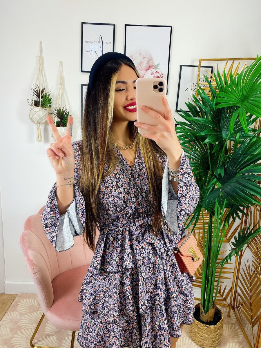 Abito a fiori con balze manica lunga color lilla, il look giusto primavera estate.