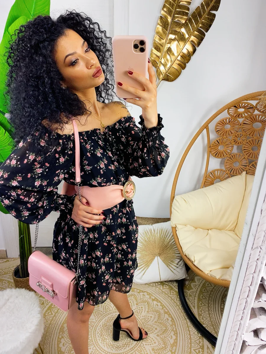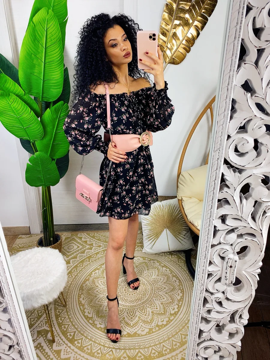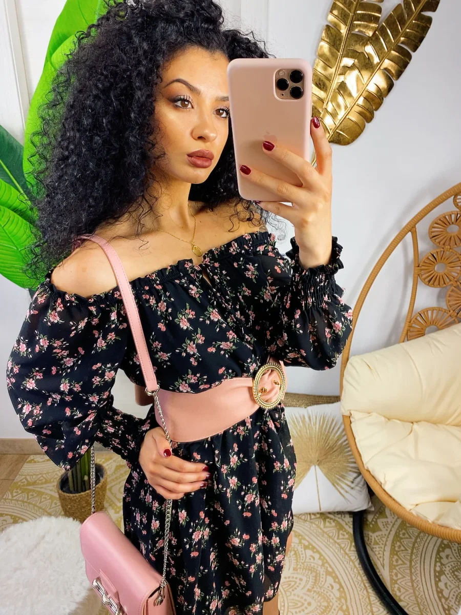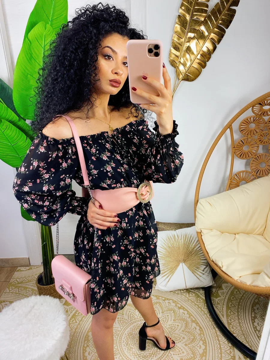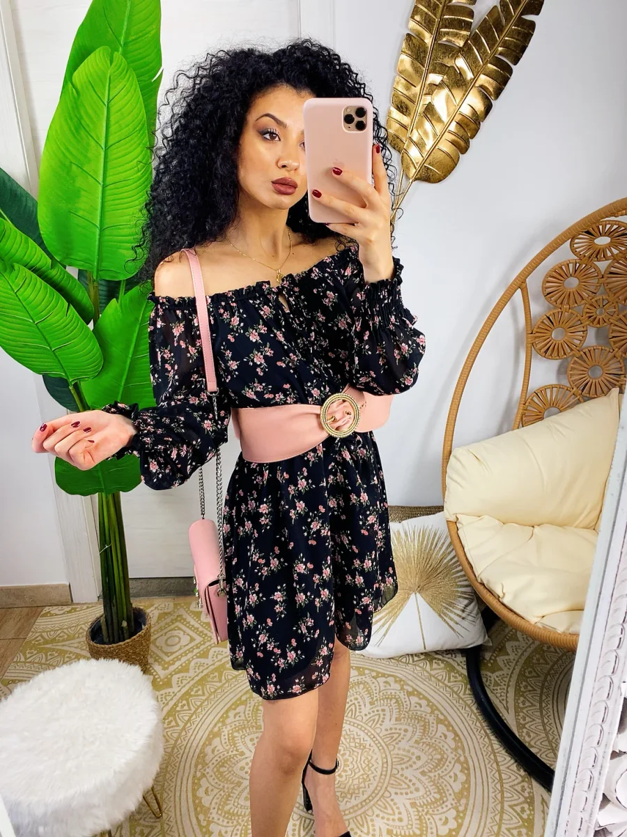 Abito a fiori con scollo a barchetta. Tessuto elasticizzato e comodo.