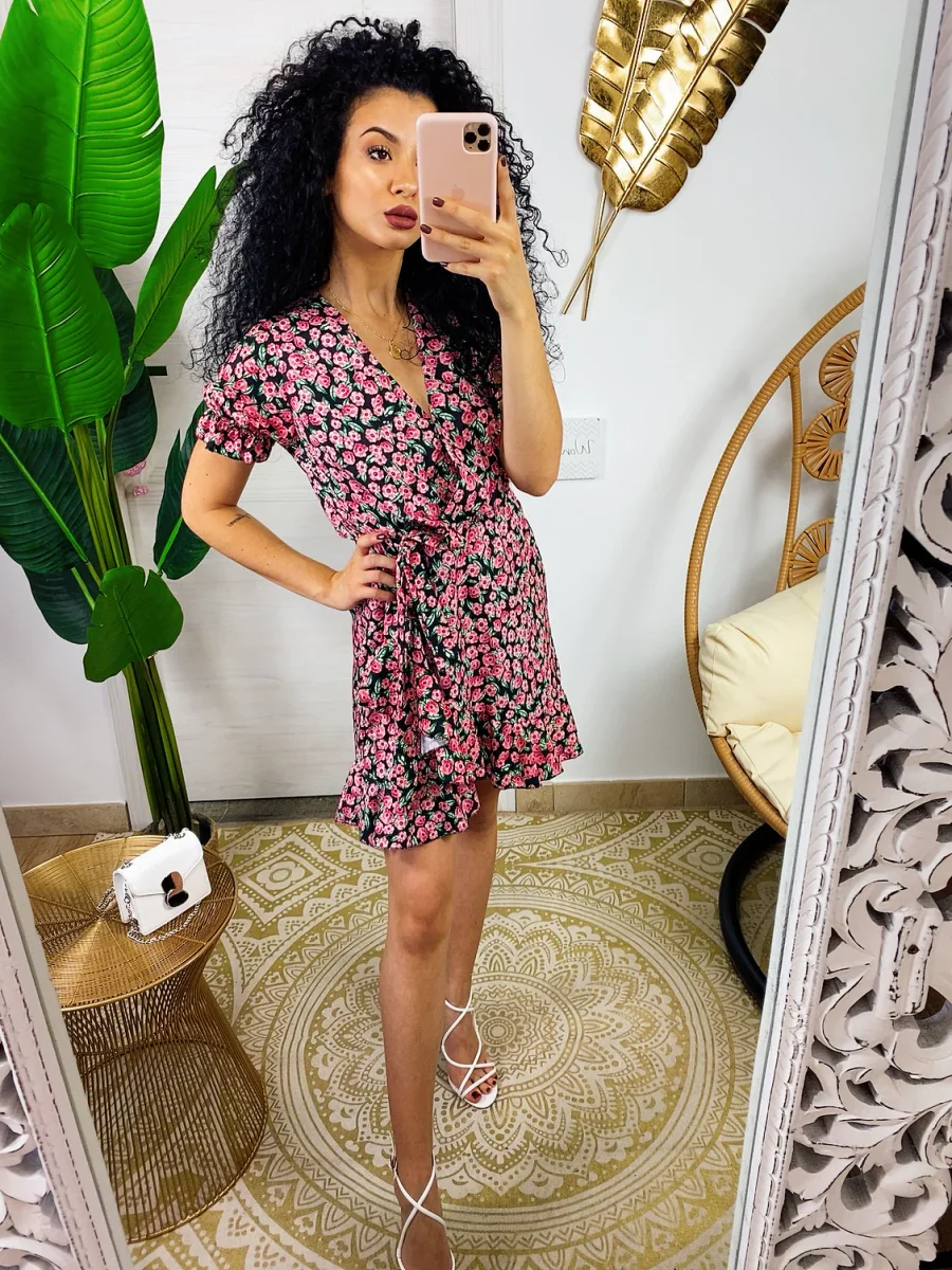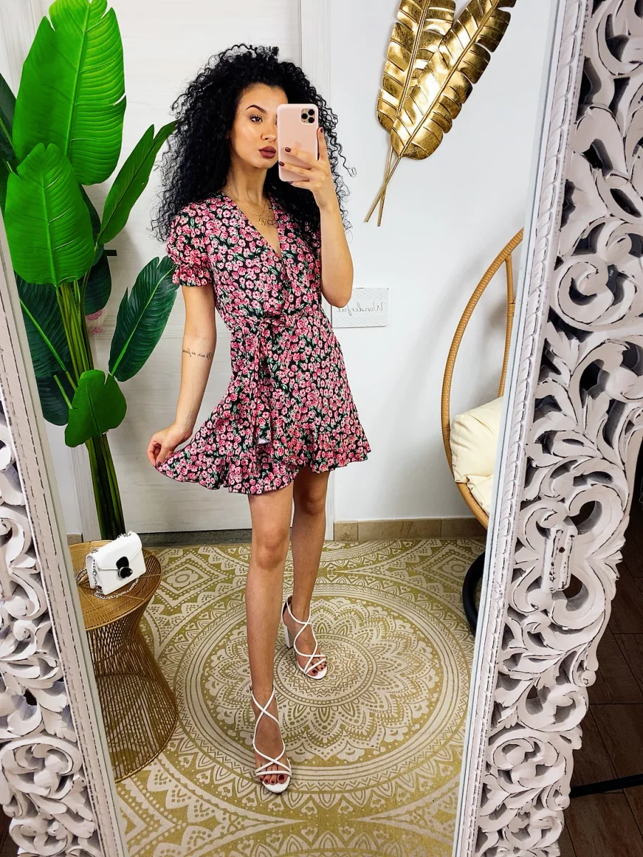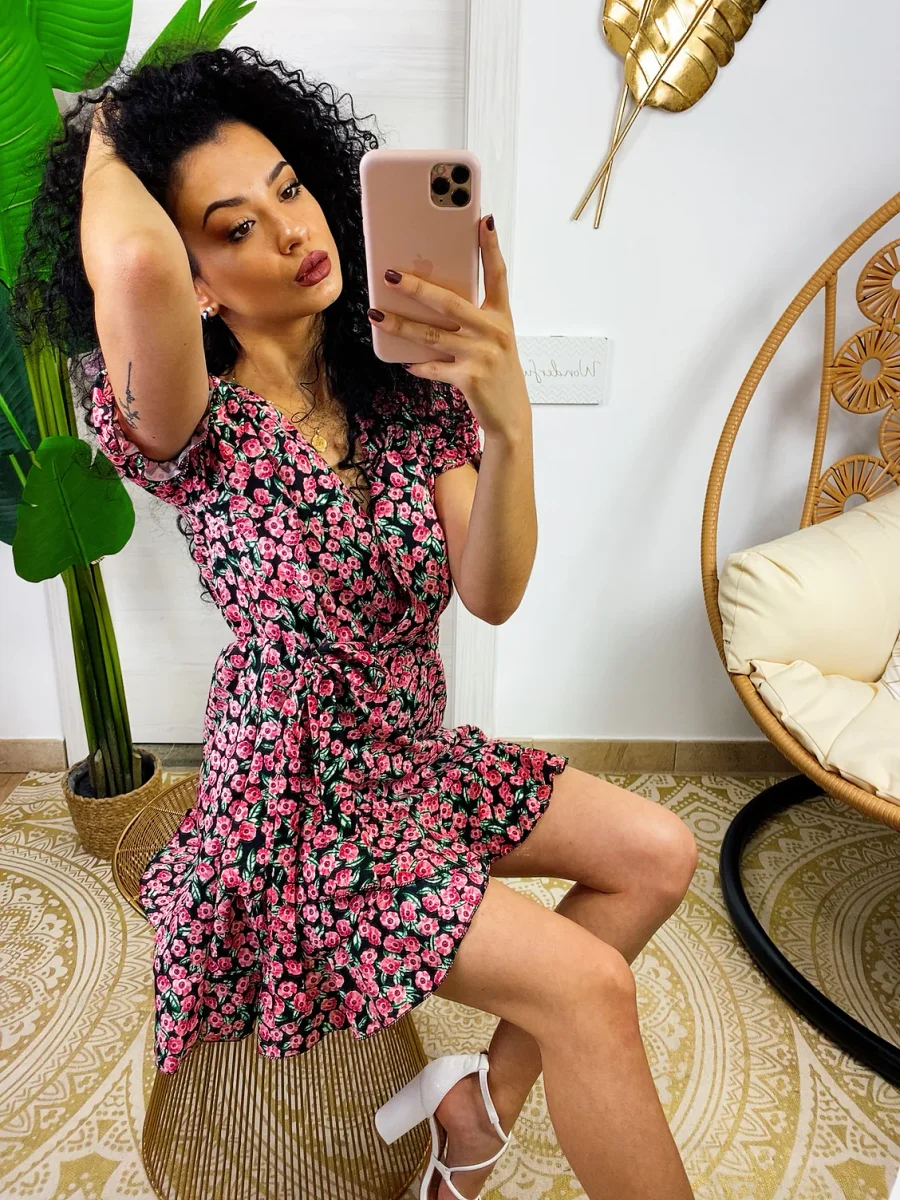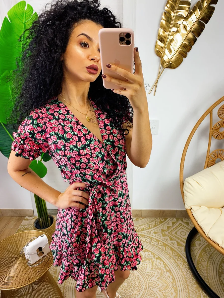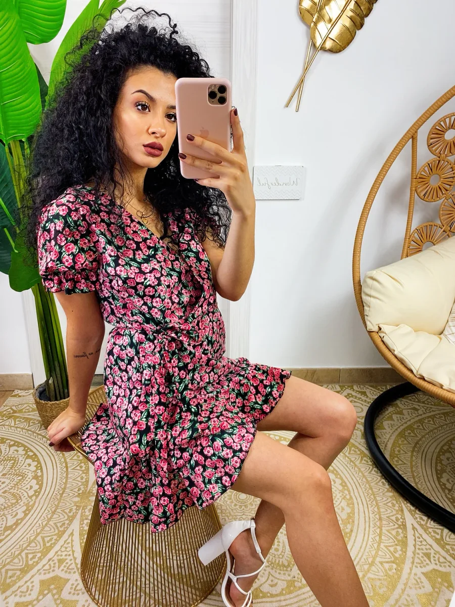 Abito a manica corta con sbuffo e rouge sul davanti. Tessuto leggero e fresco foderato, laccio in vita.