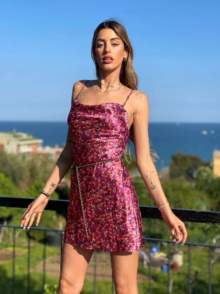 Abito a bretellina in raso morbido fiorato.