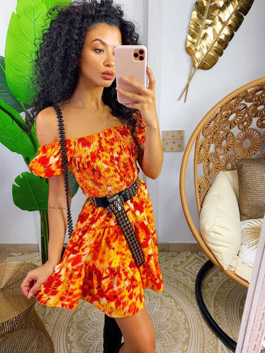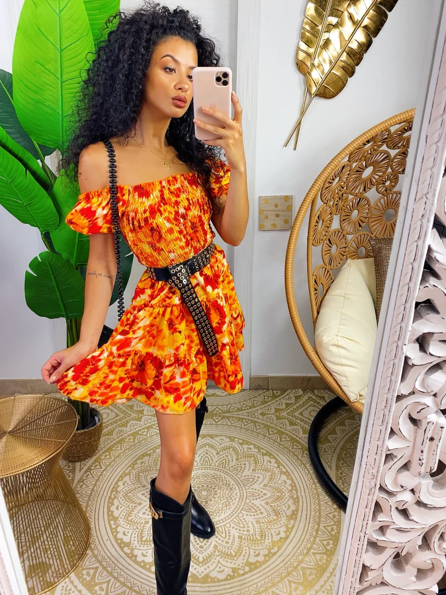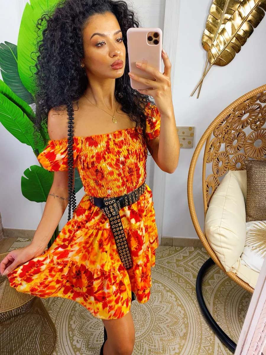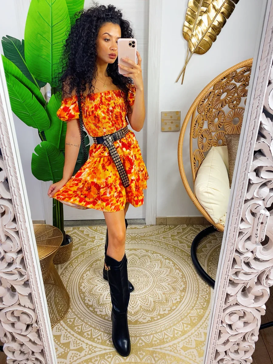 Abito a fiori con scollo a barchetta. Manichina a palloncino e gonna ampia. Tessuto a fiori.