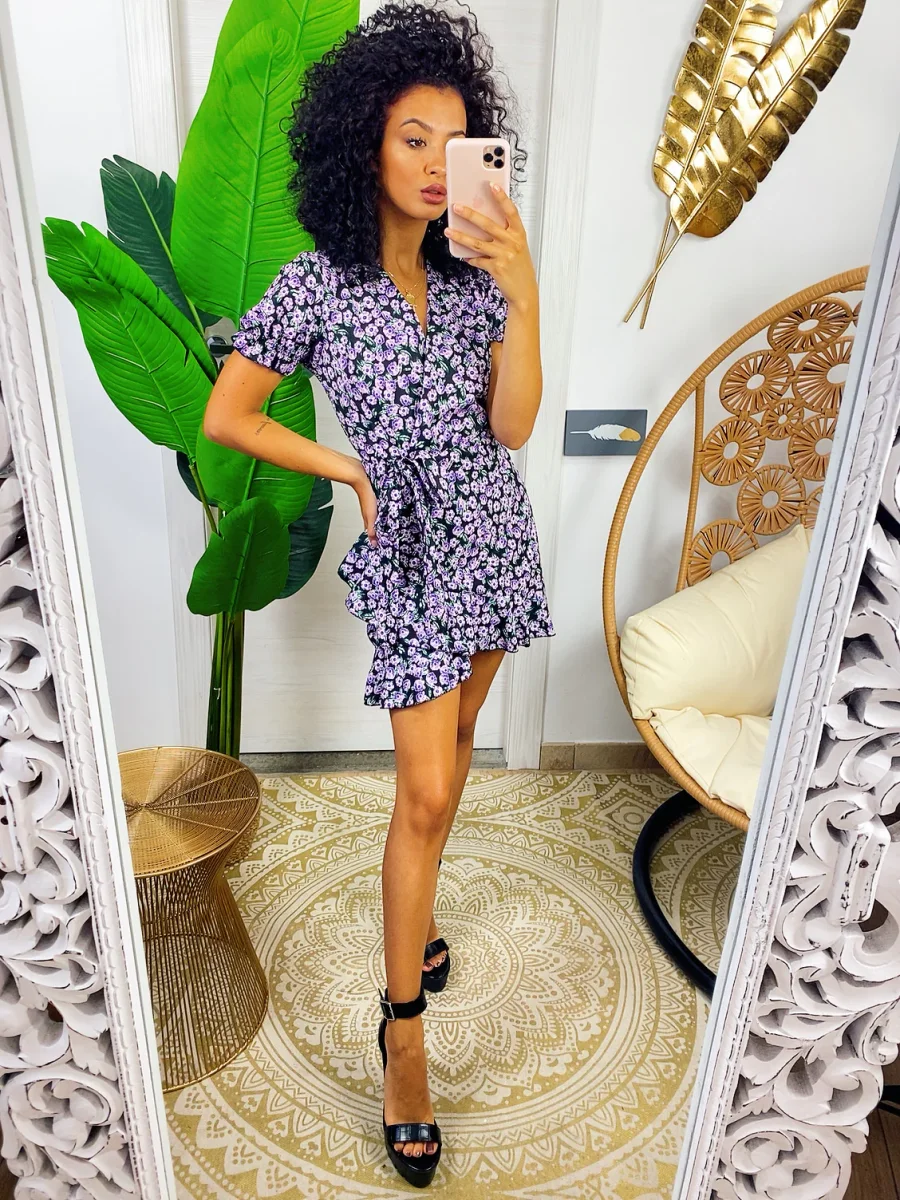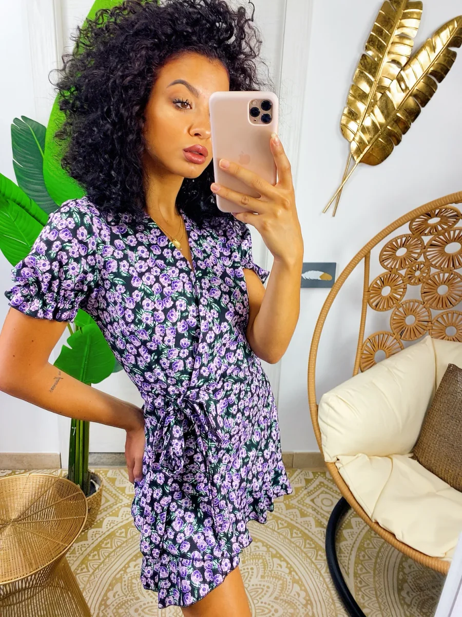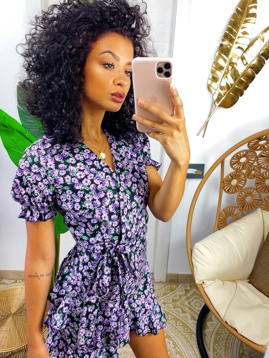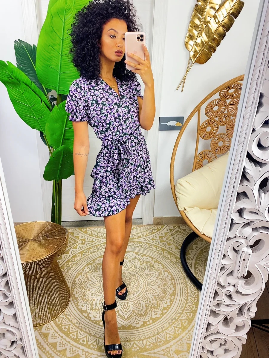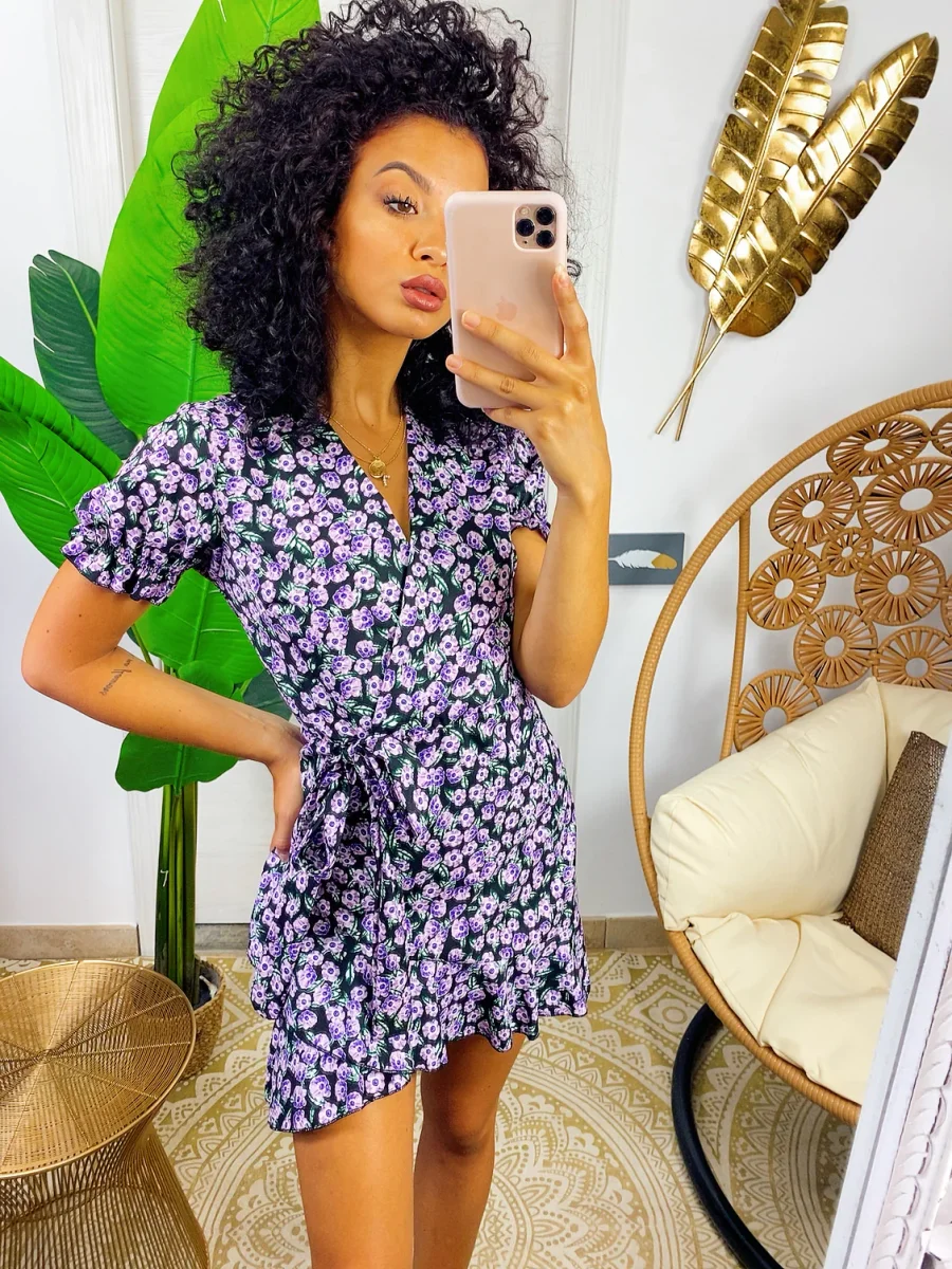 Abito a manica corta con sbuffo e rouge sul davanti. Tessuto leggero e fresco foderato, laccio in vita.