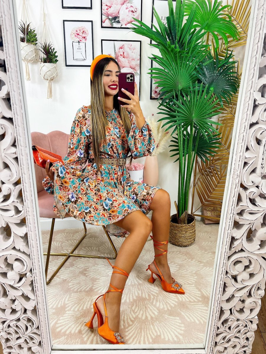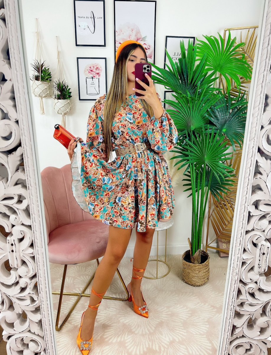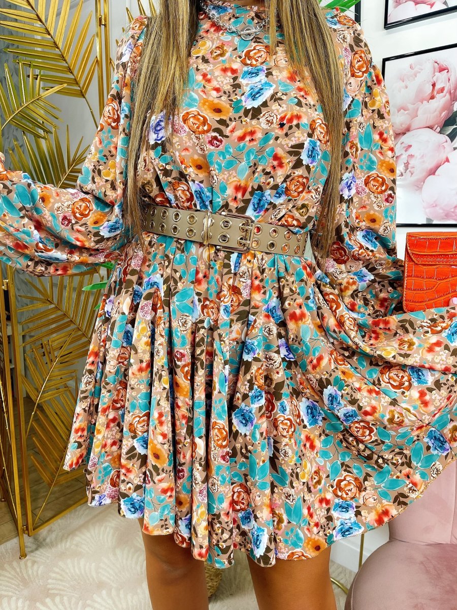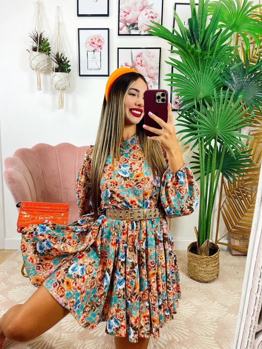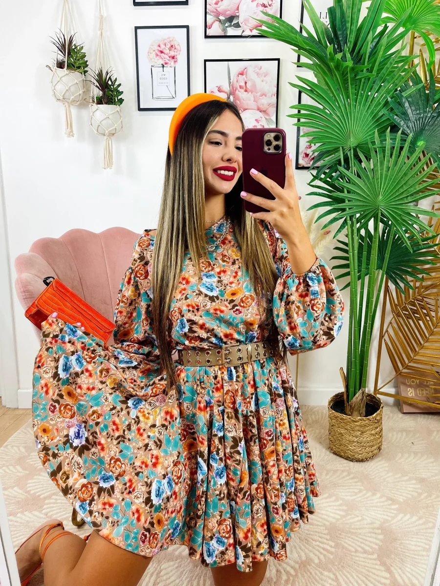 Abito a manica lunga con fantasia a fiori nude e azzurri, cinturina inclusa tono su tono.