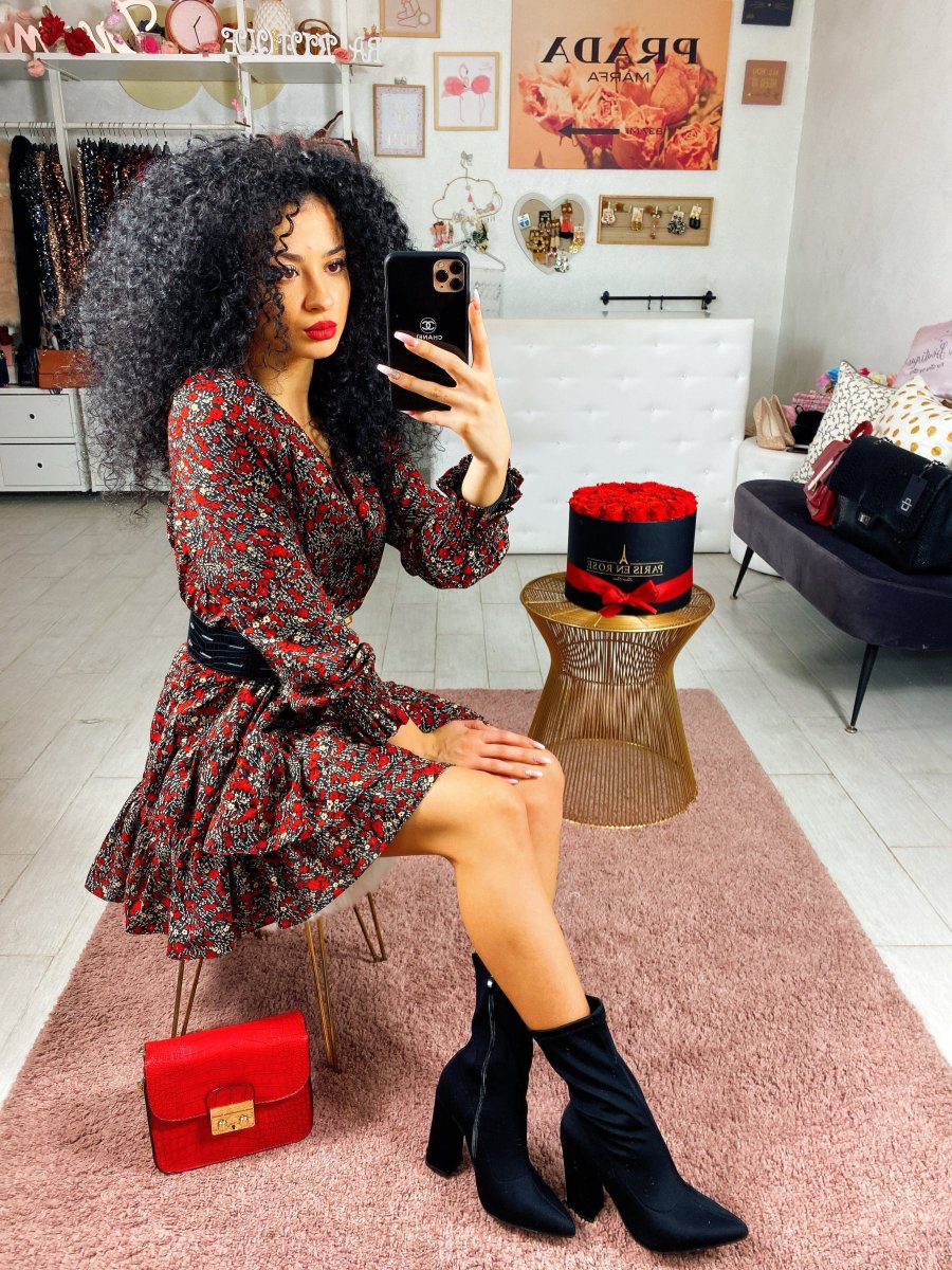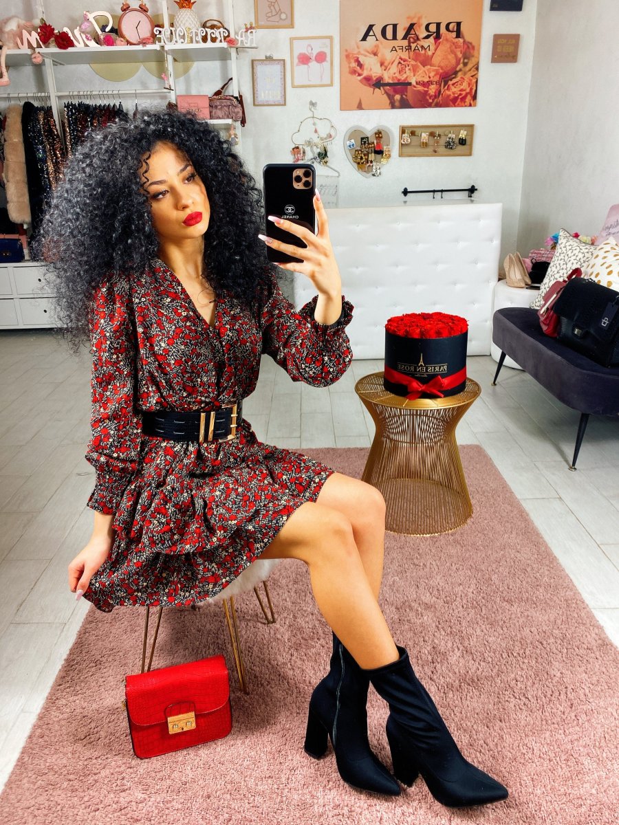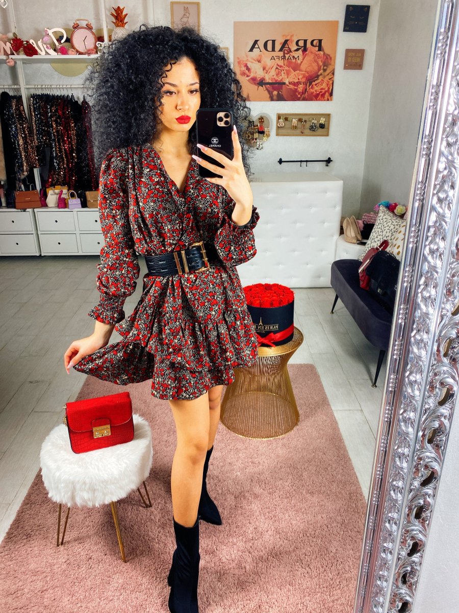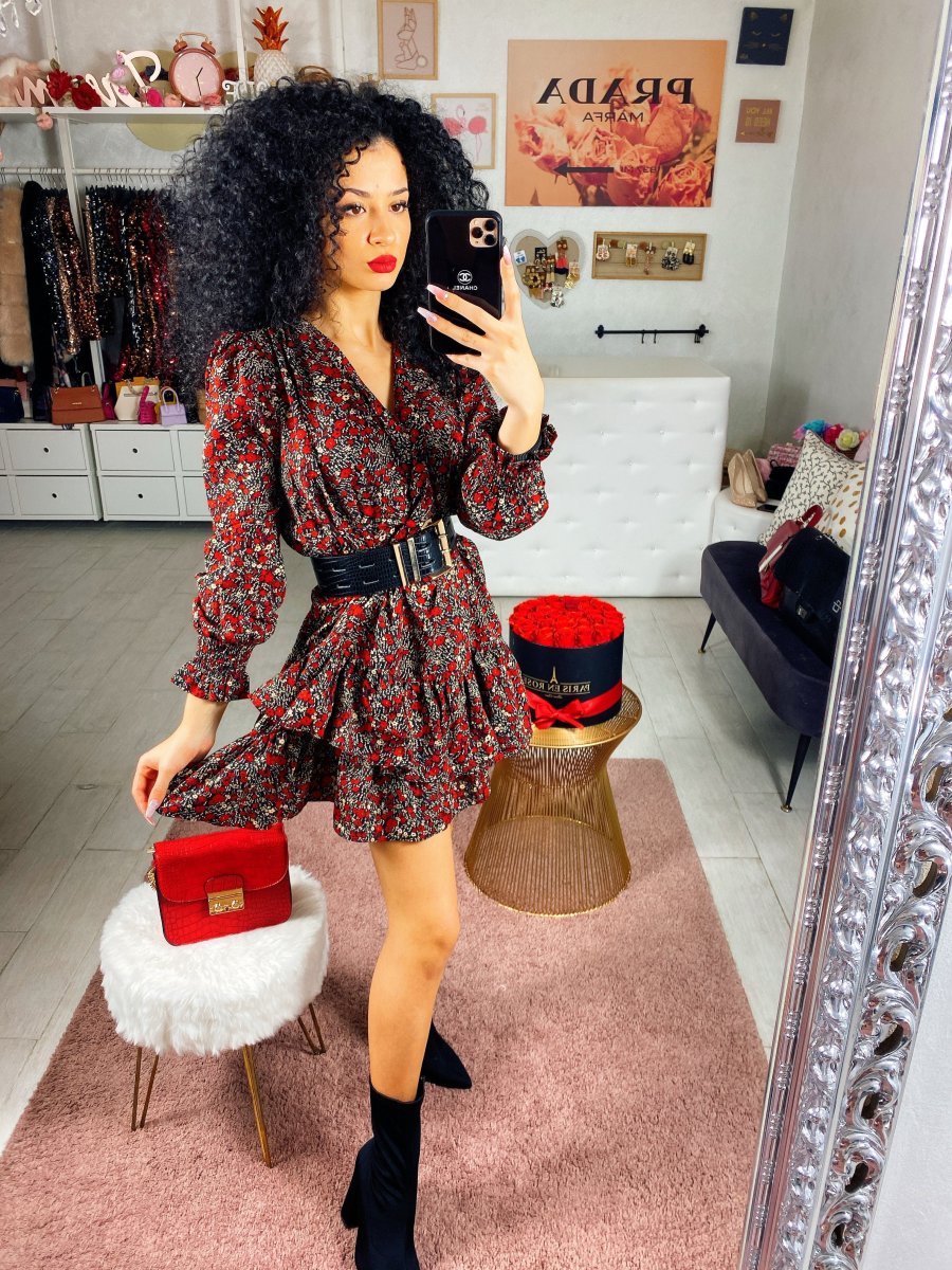 Abito in cotone a manica lunga con stampa a fiori rossi. Tessuto elasticizzato con scollo a V.