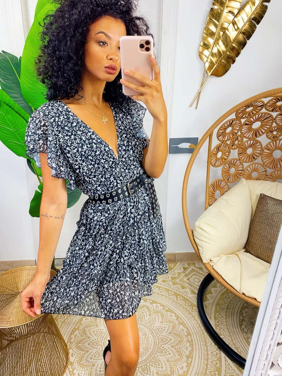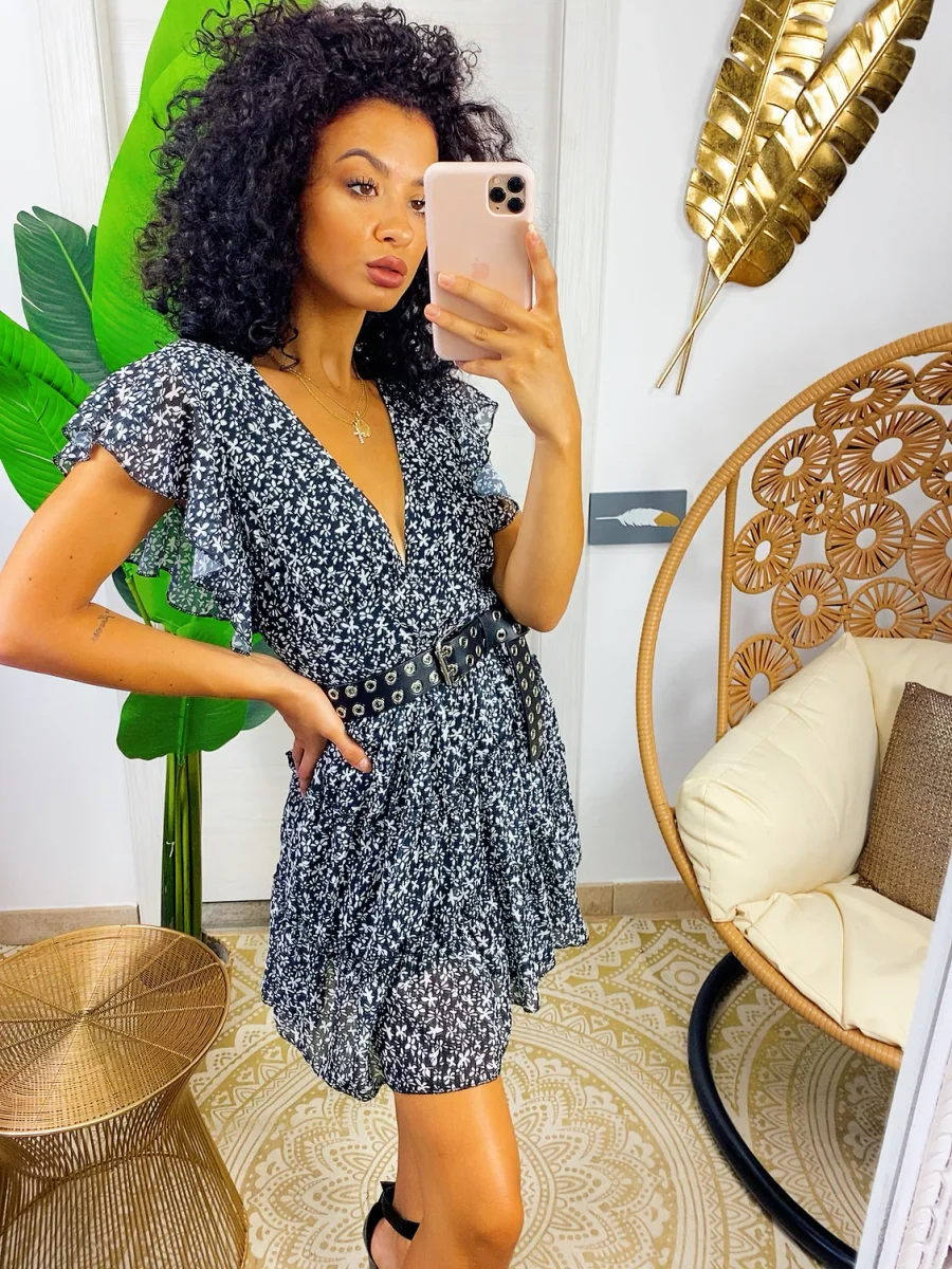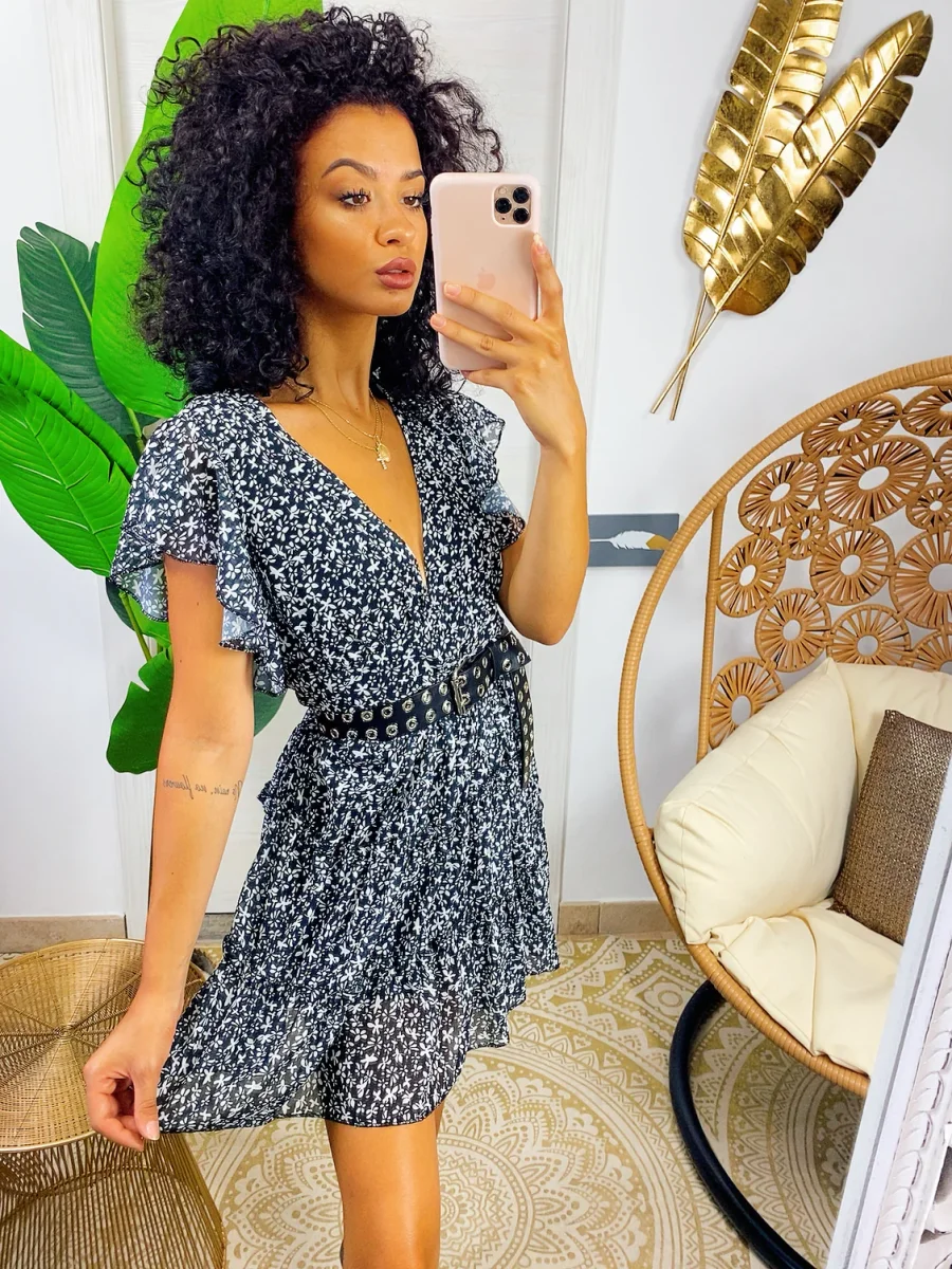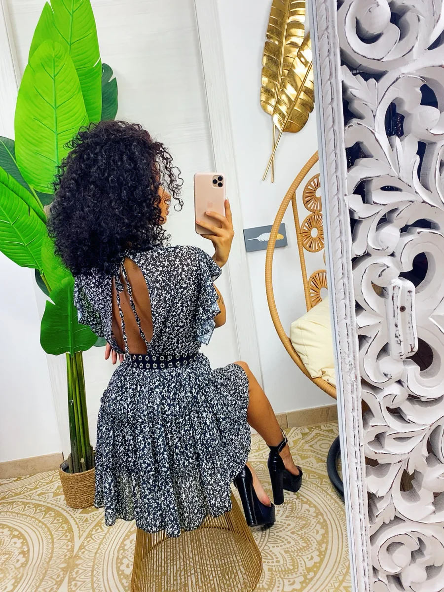 Abito a fiori con schiena aperta, chiusura con laccetto sulla schiena e scollo a U nel dietro. Elastico in vita e gonna ampia.