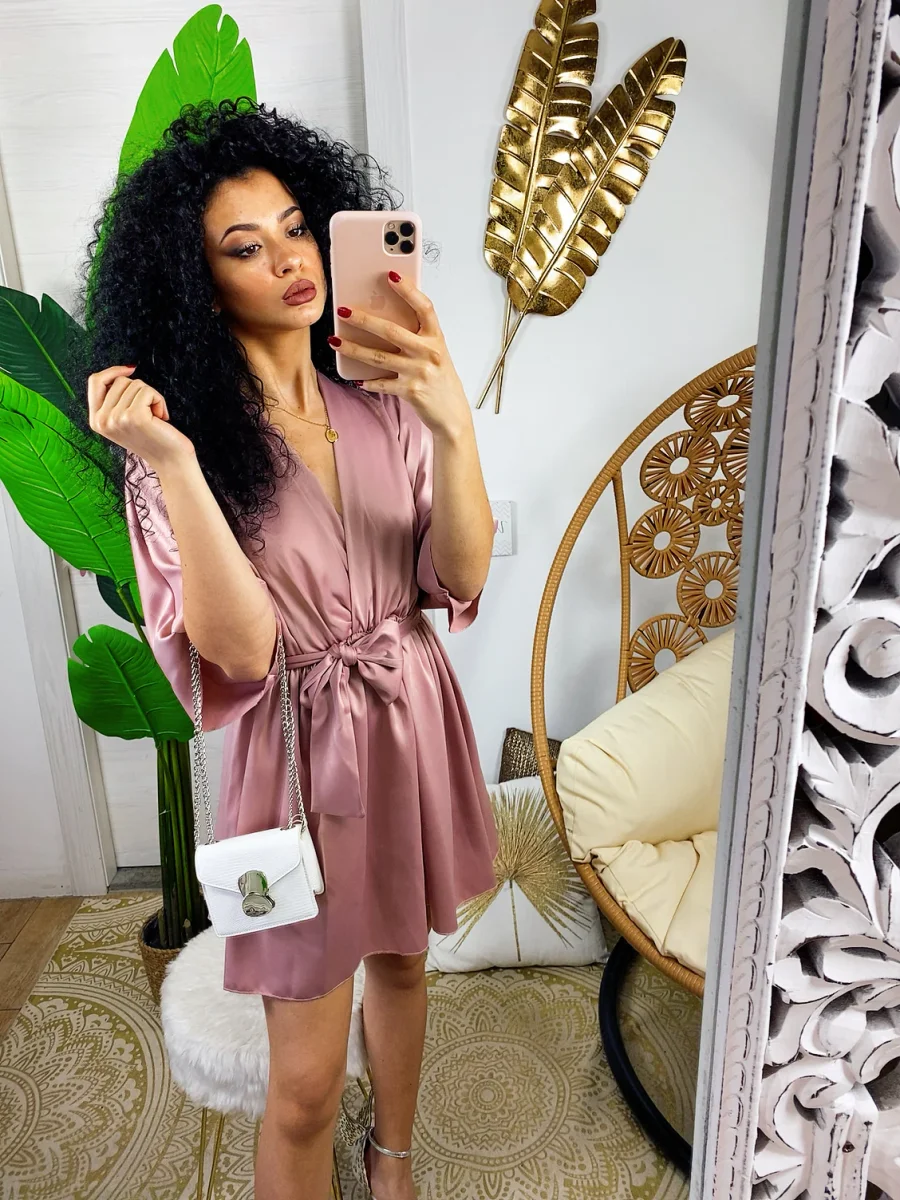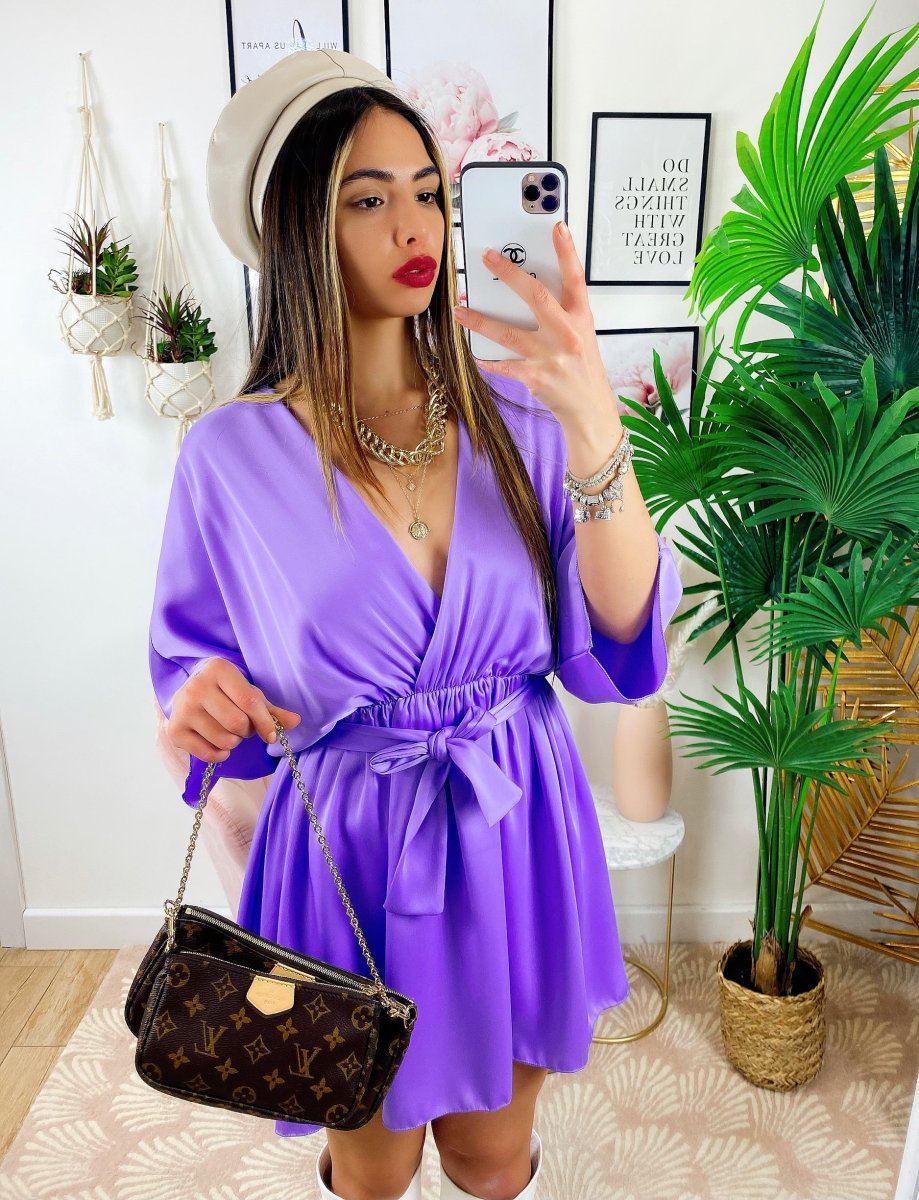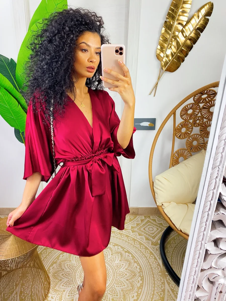 Abito con manica larga a kimono e cintura tono su tono. Ottimo raso spesso e non trasparente. Taglia unica elasticizzato.