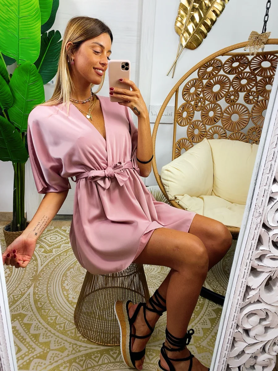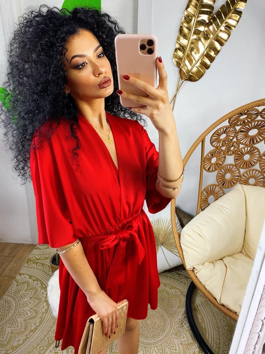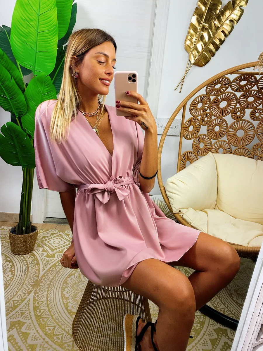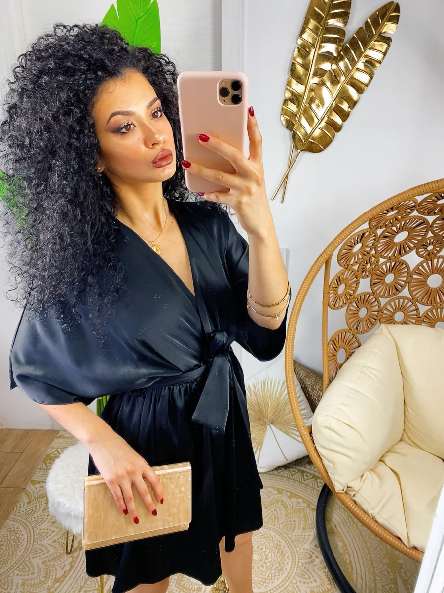 Abito con manica larga a kimono e cintura tono su tono. Ottimo raso spesso e non trasparente. Taglia unica elasticizzato.