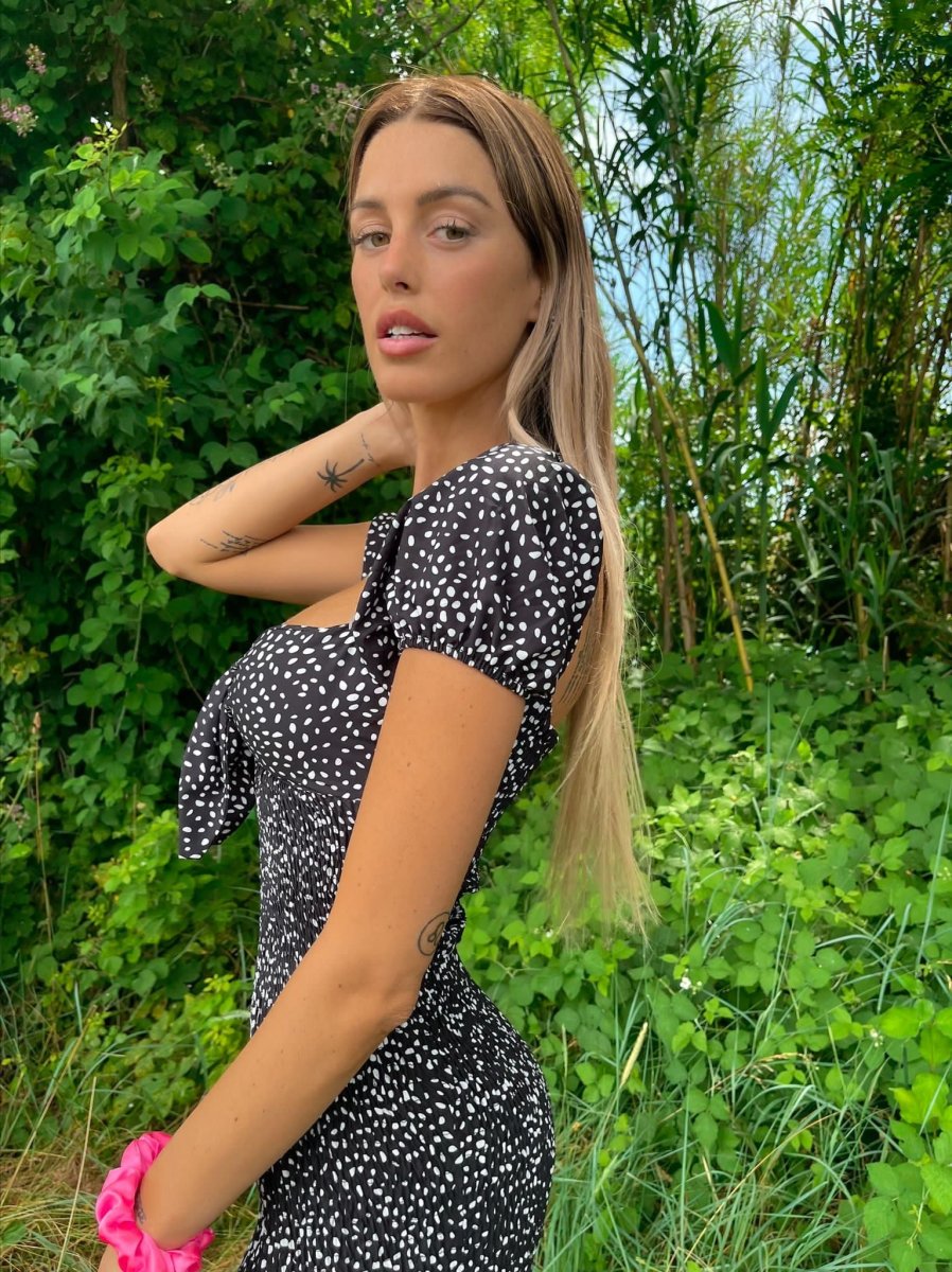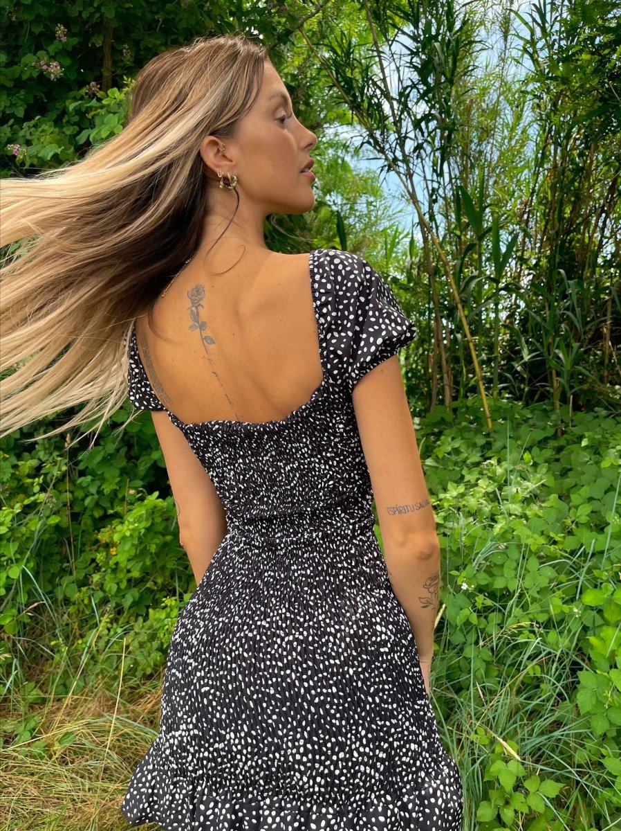 Abito a pois aderente con fiocco elasticizzato e aderente in vita, compreso di coppe, schiena chiusa al livello reggiseno.