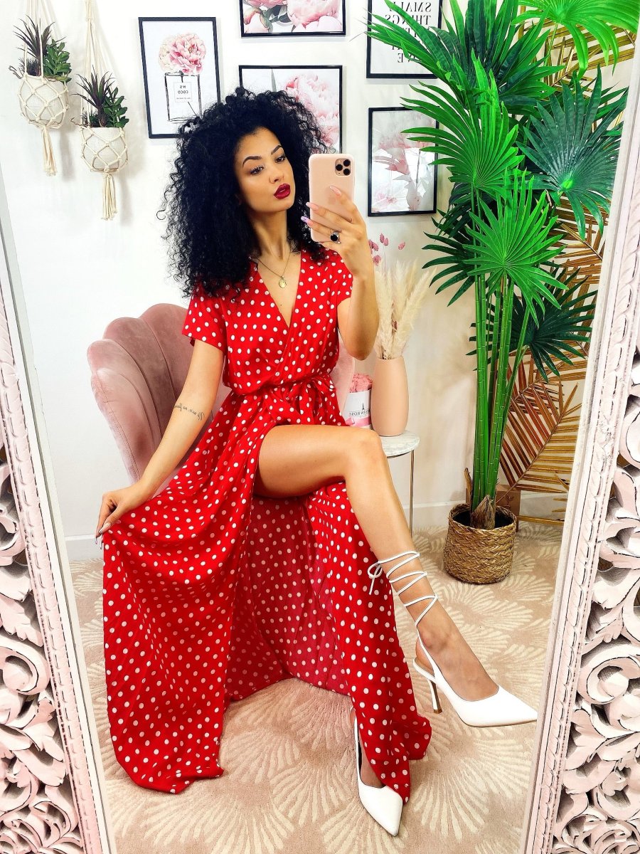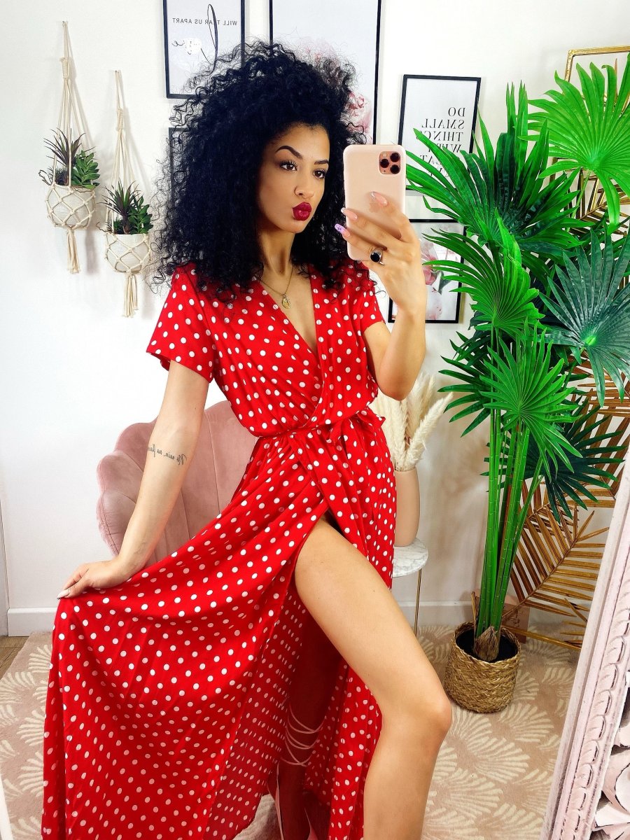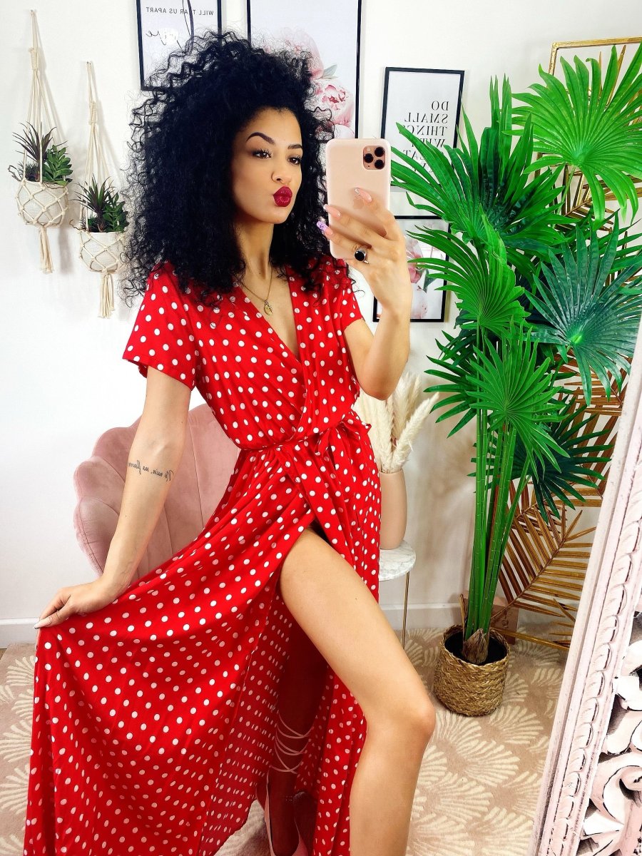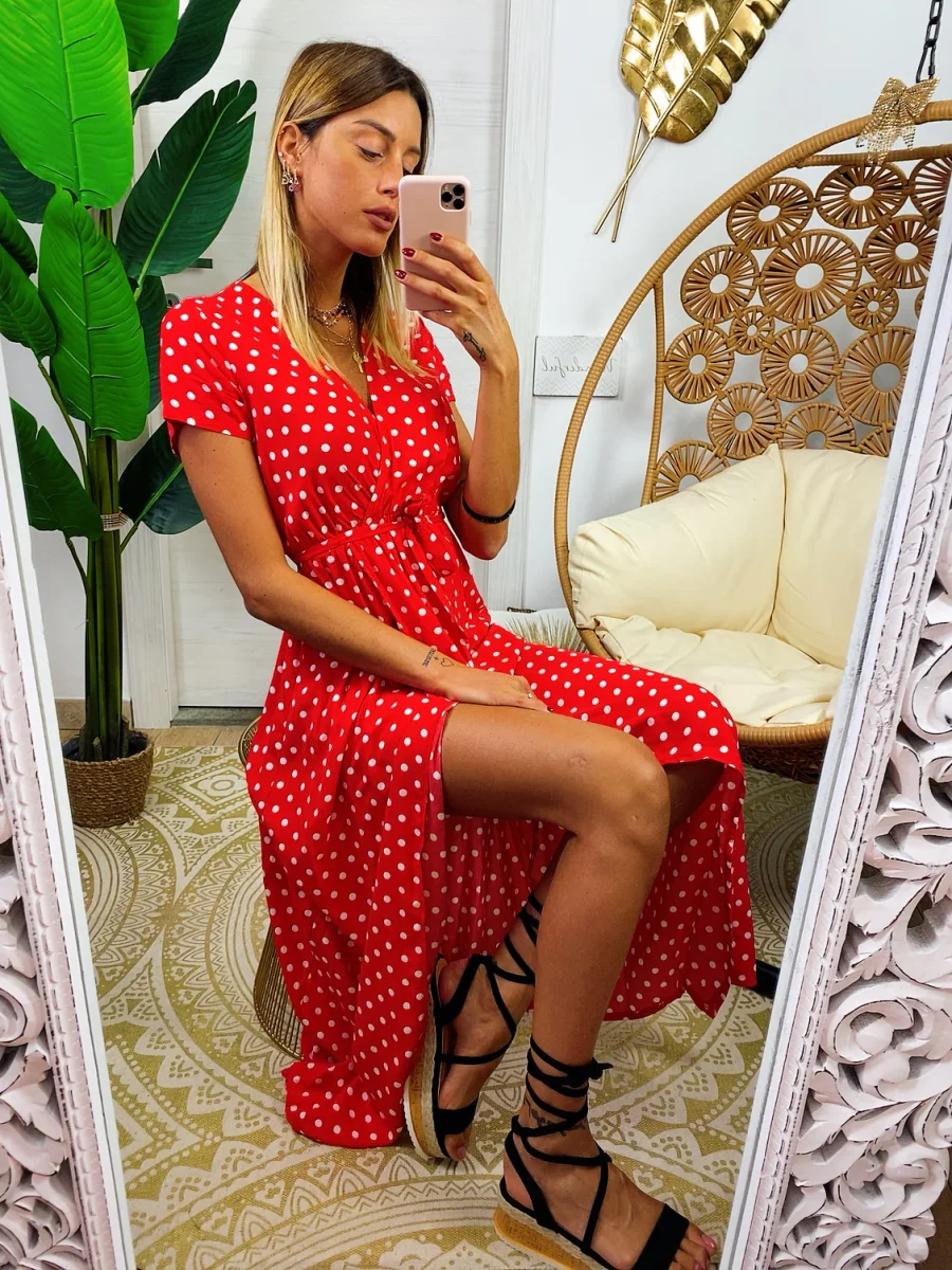 Abito a pois lungo con maxi spacco a manica corta ideale per le giornate primaverili, è una fantasia che non tramonterà mai.