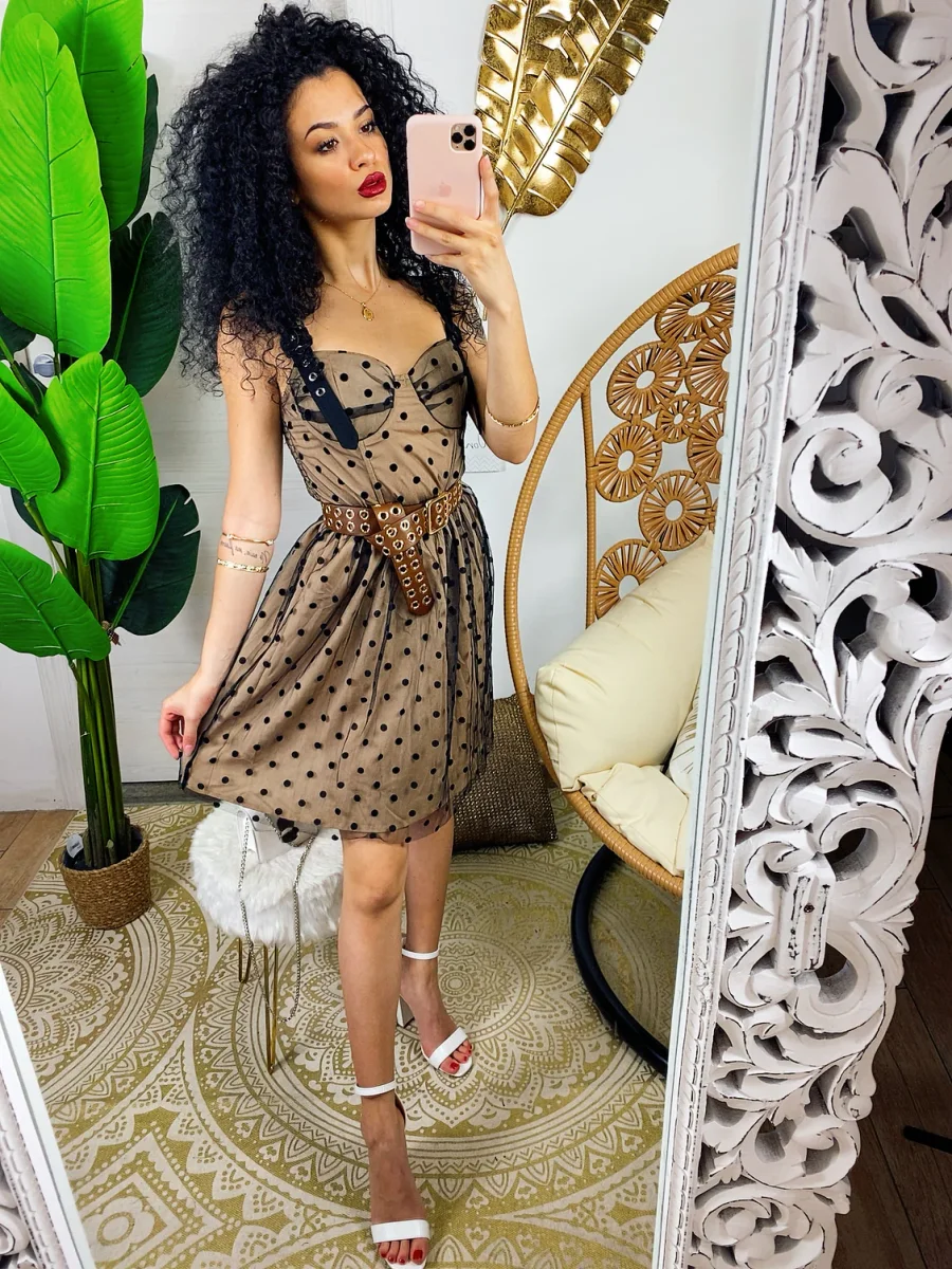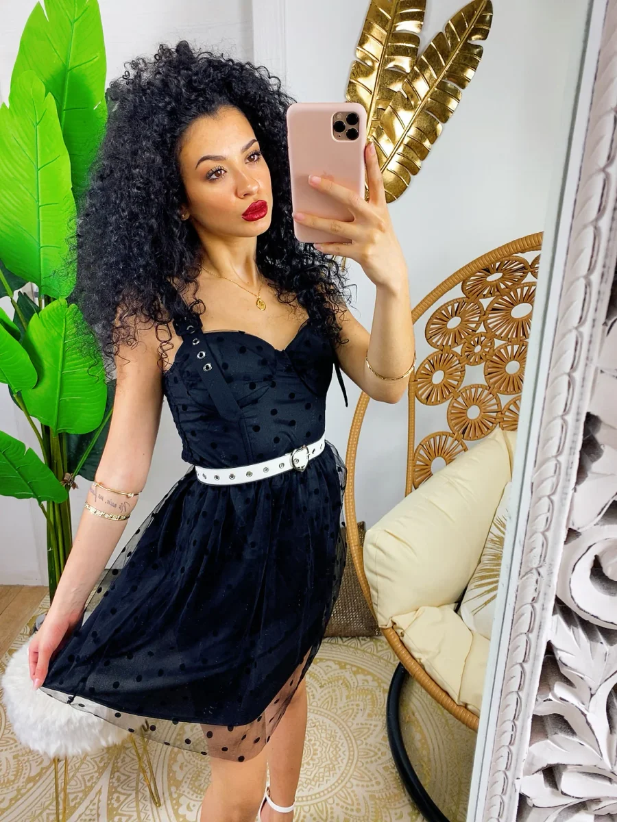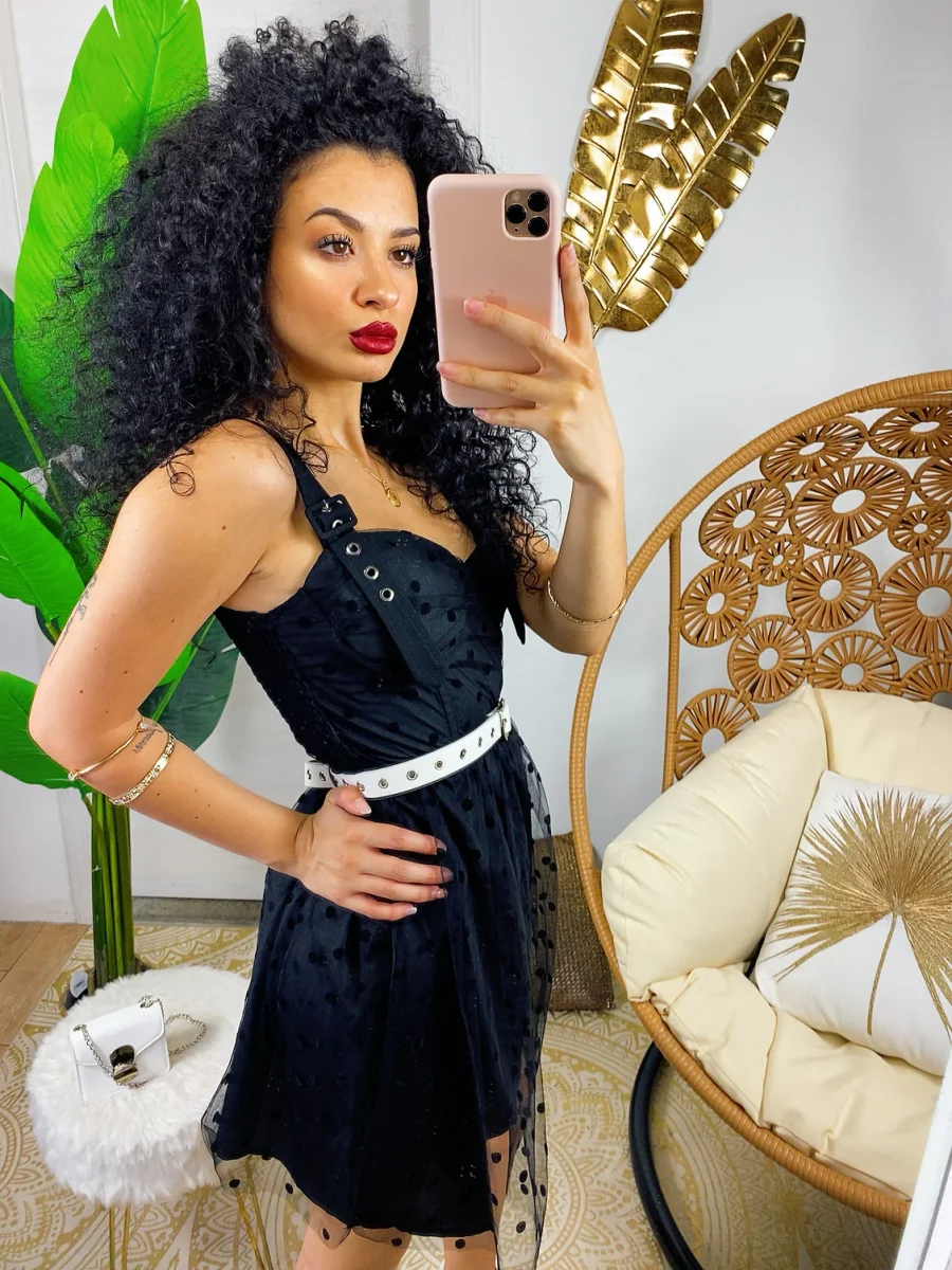 Abito con corpetto e gonna ampia foderata. Bretelle regolabili.