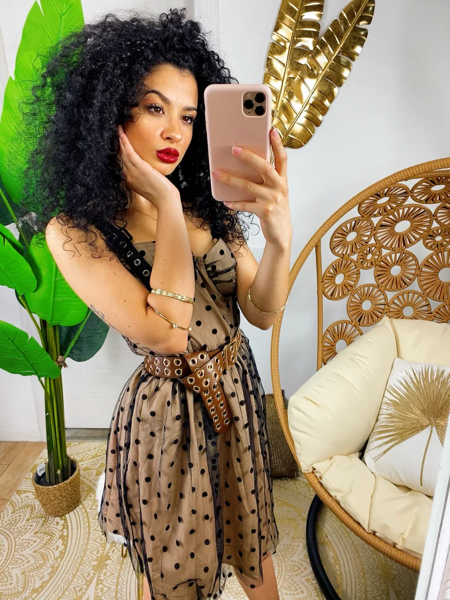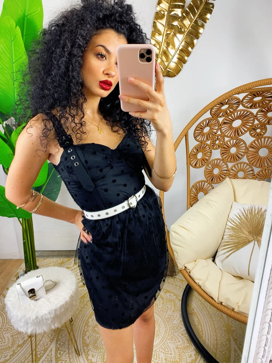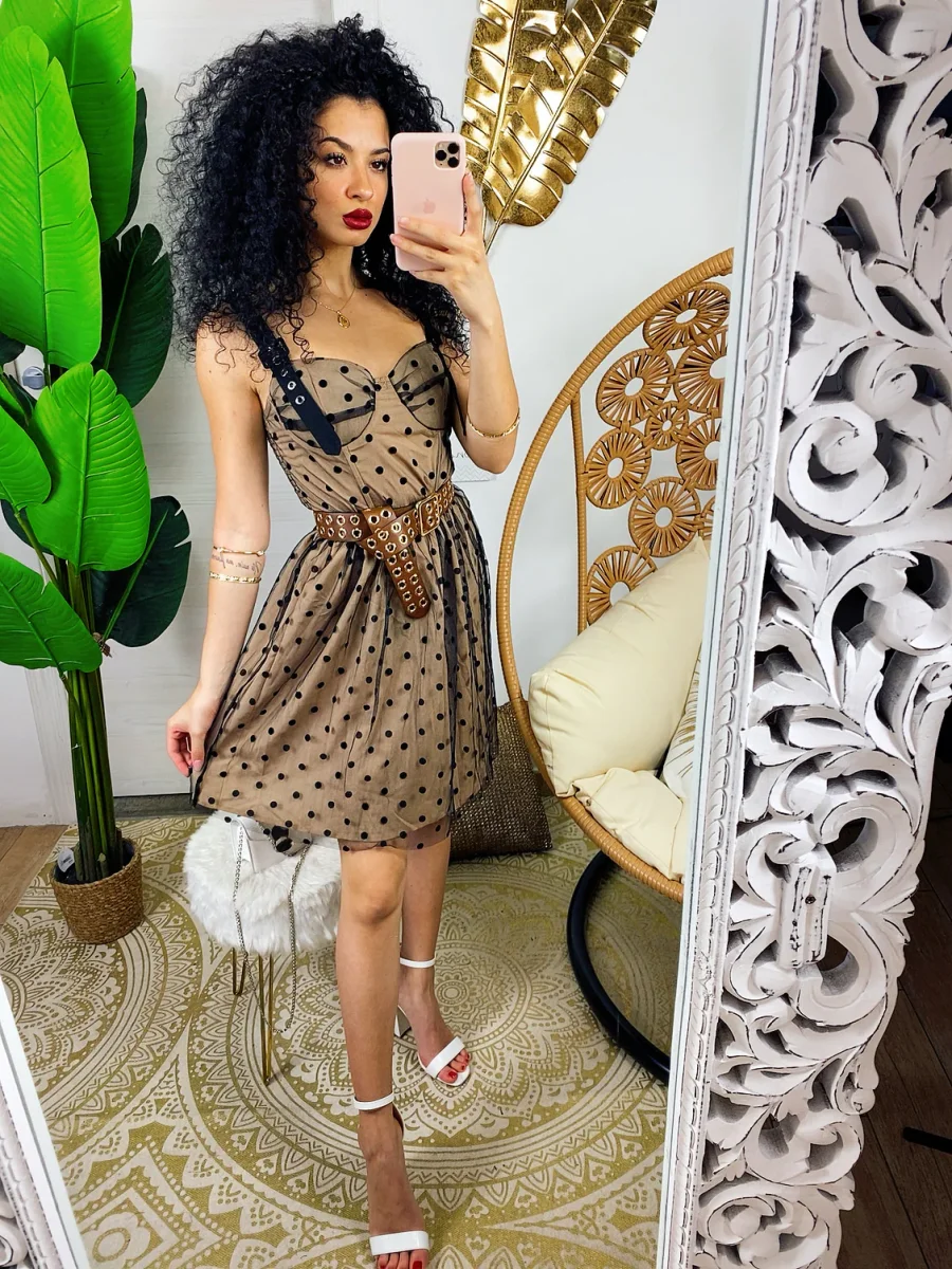 Abito con corpetto e gonna ampia foderata. Bretelle regolabili.