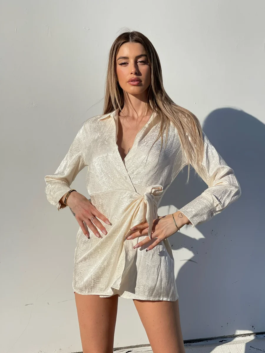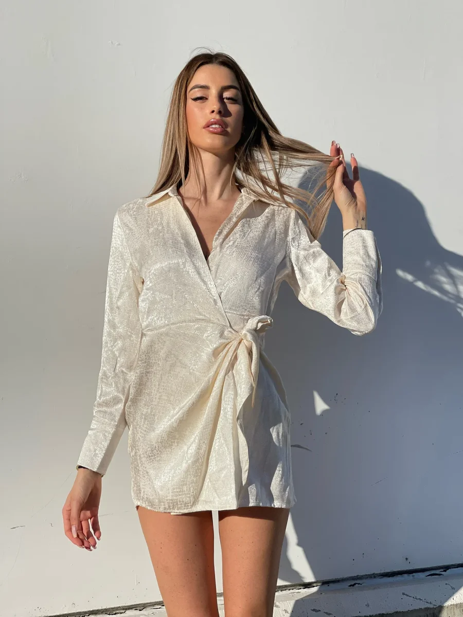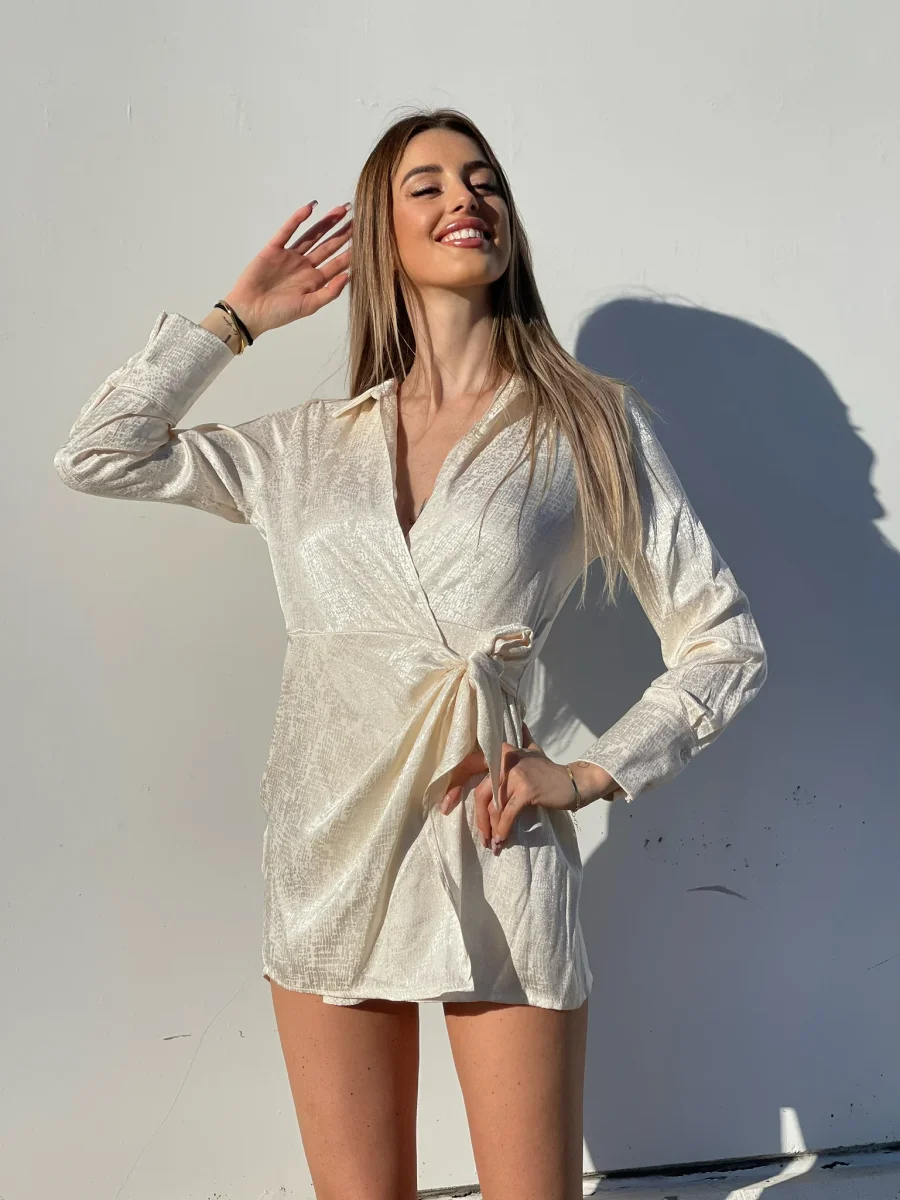 Abito in lino , chiusura a portafoglio e gonna asimmetrica. Fusciacca in vita tono su tono.