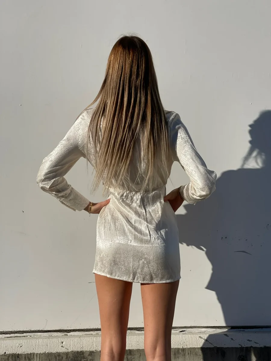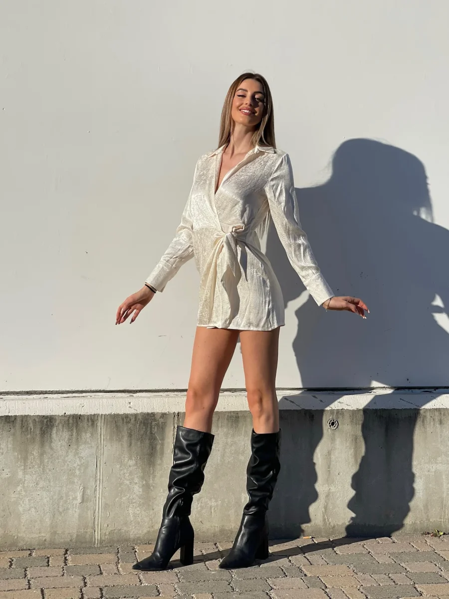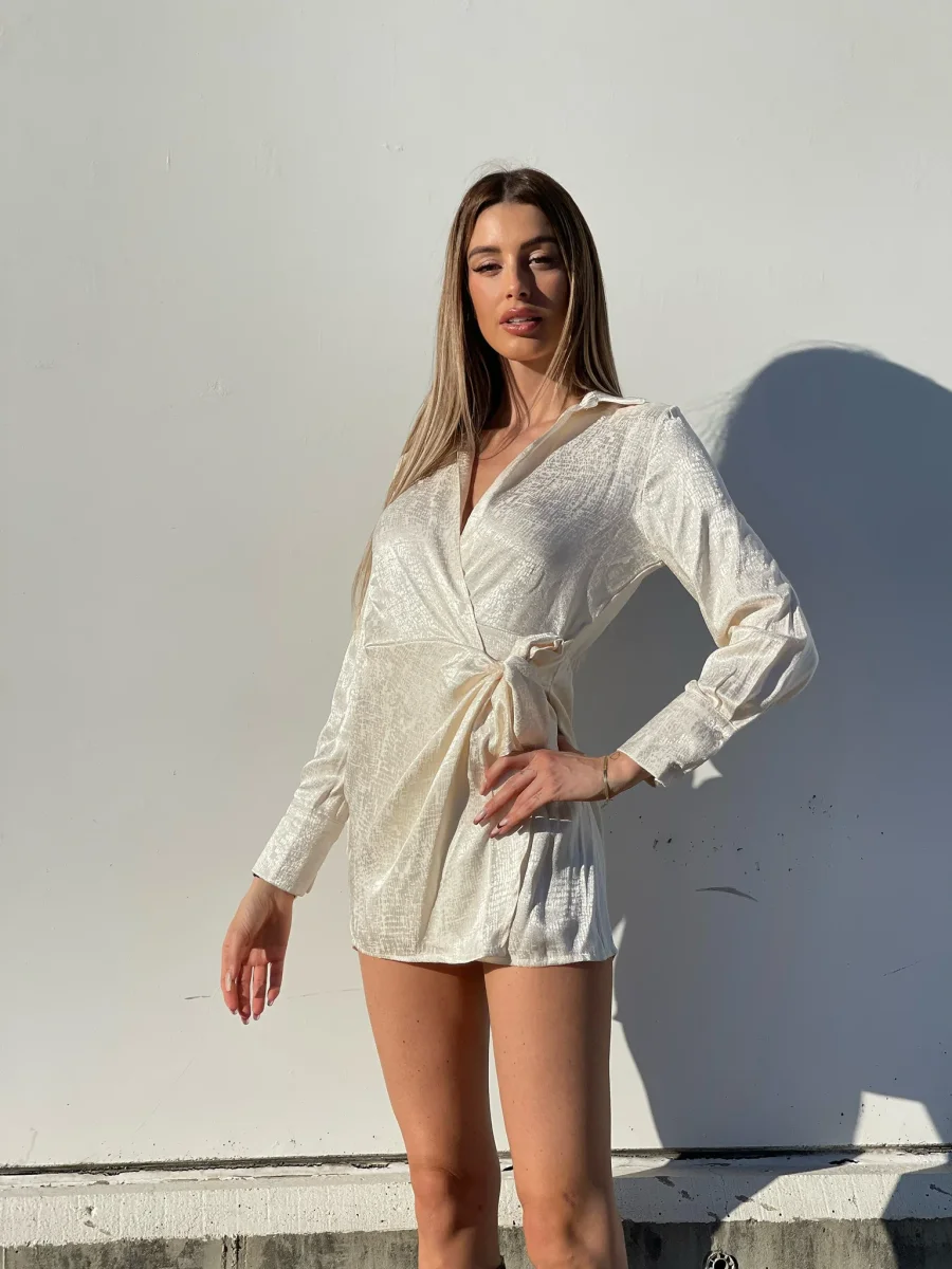 Abito in lino , chiusura a portafoglio e gonna asimmetrica. Fusciacca in vita tono su tono.