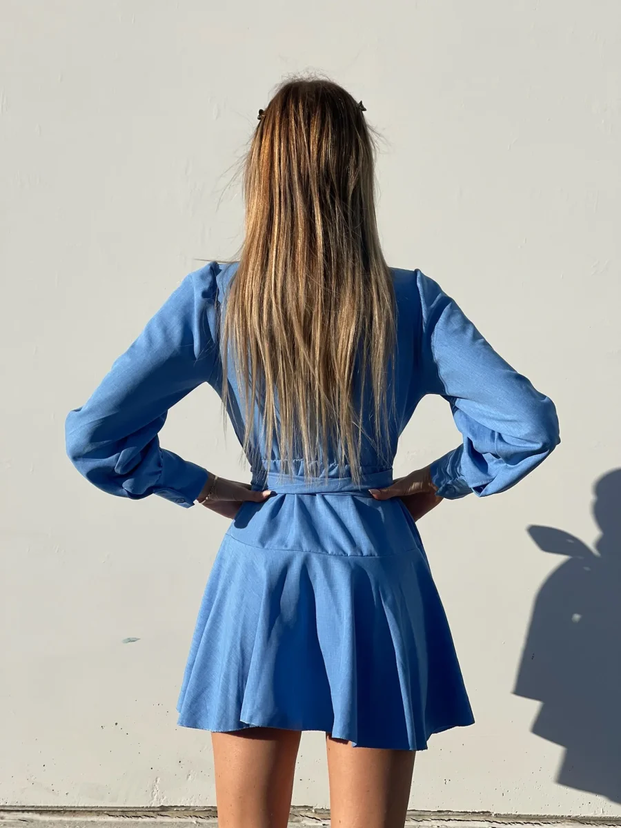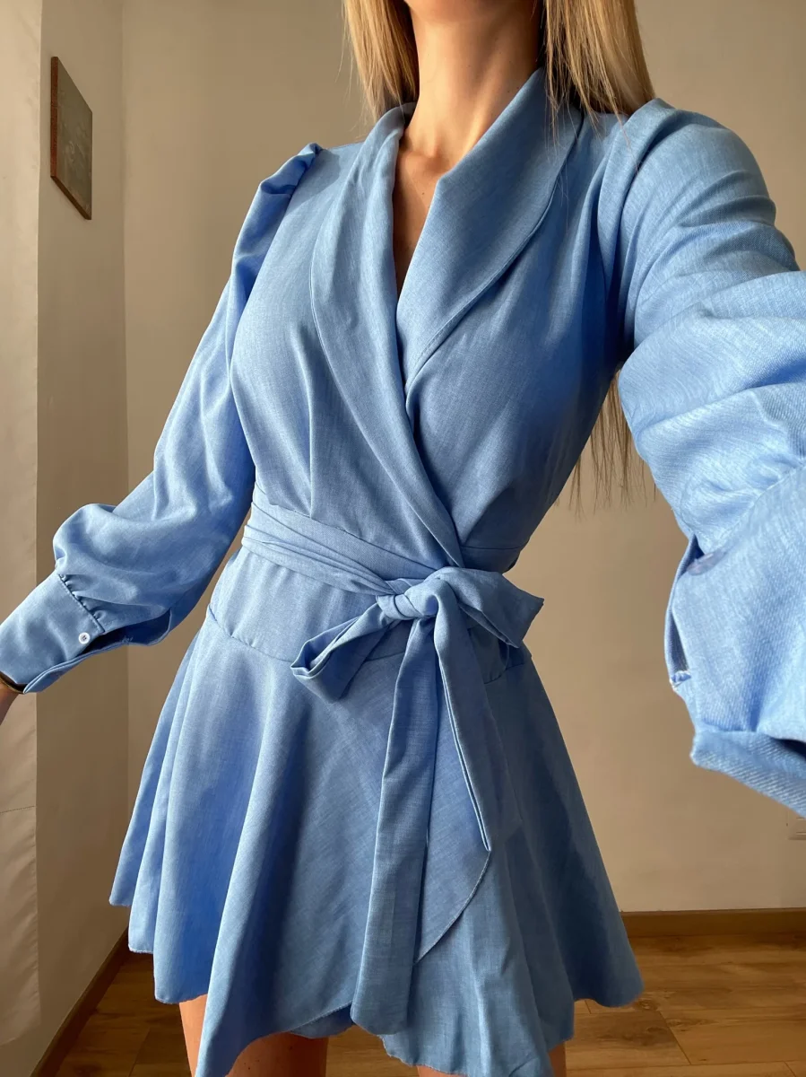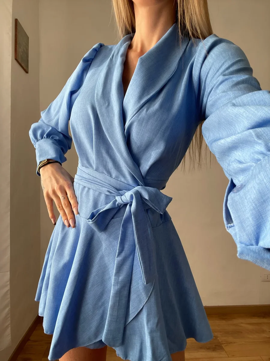 Abito in lino , chiusura a portafoglio e gonna asimmetrica. Fusciacca in vita tono su tono.