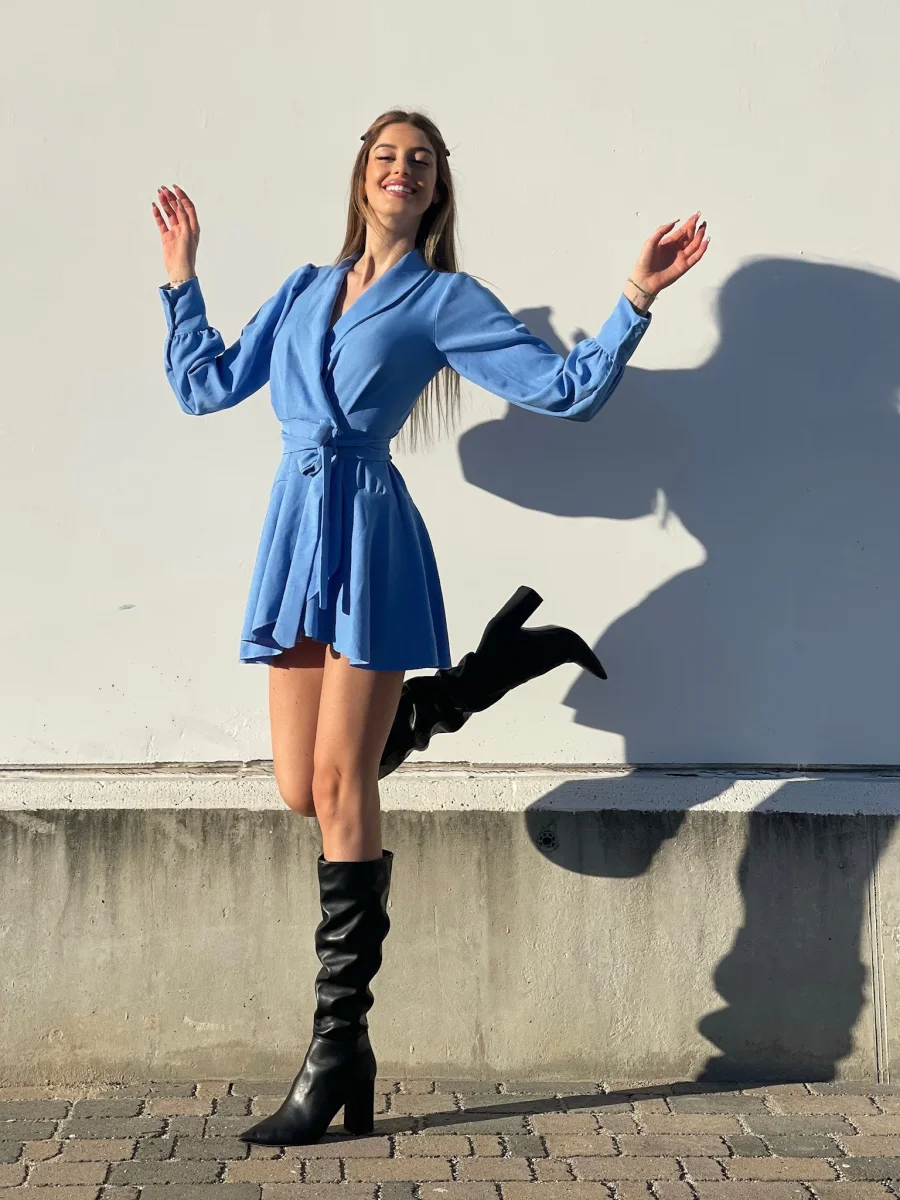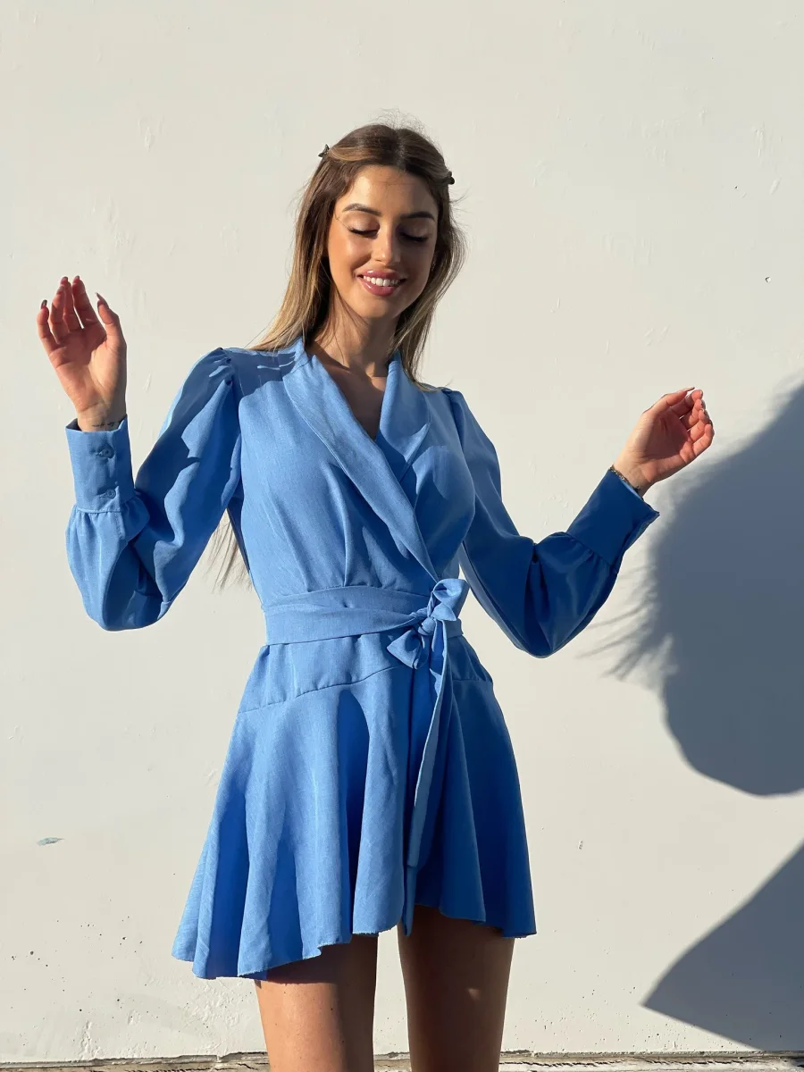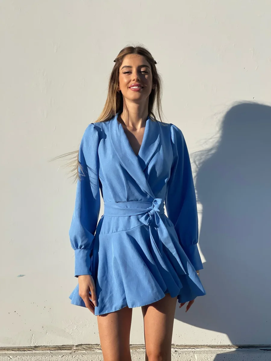 Abito in lino , chiusura a portafoglio e gonna asimmetrica. Fusciacca in vita tono su tono.
