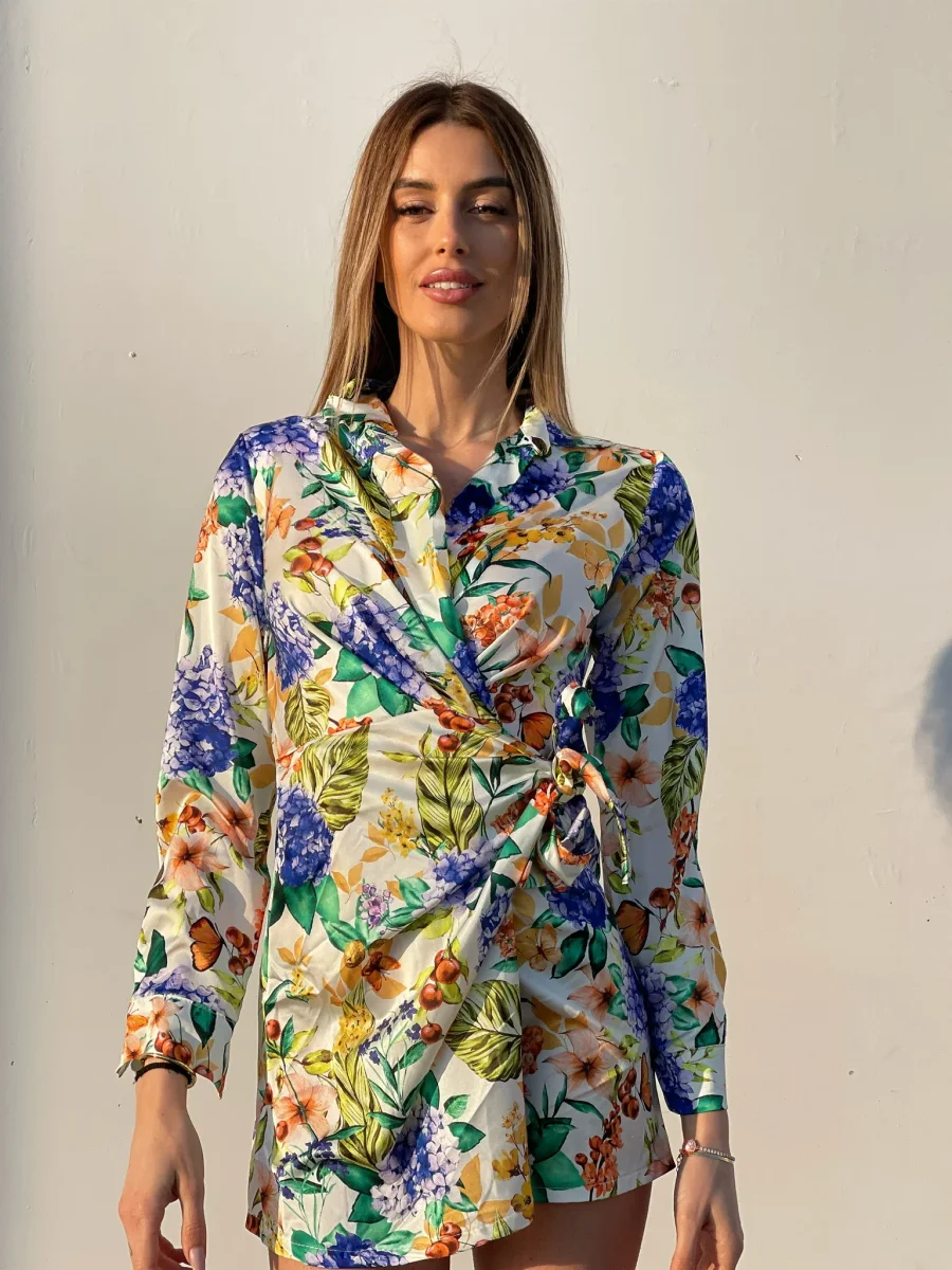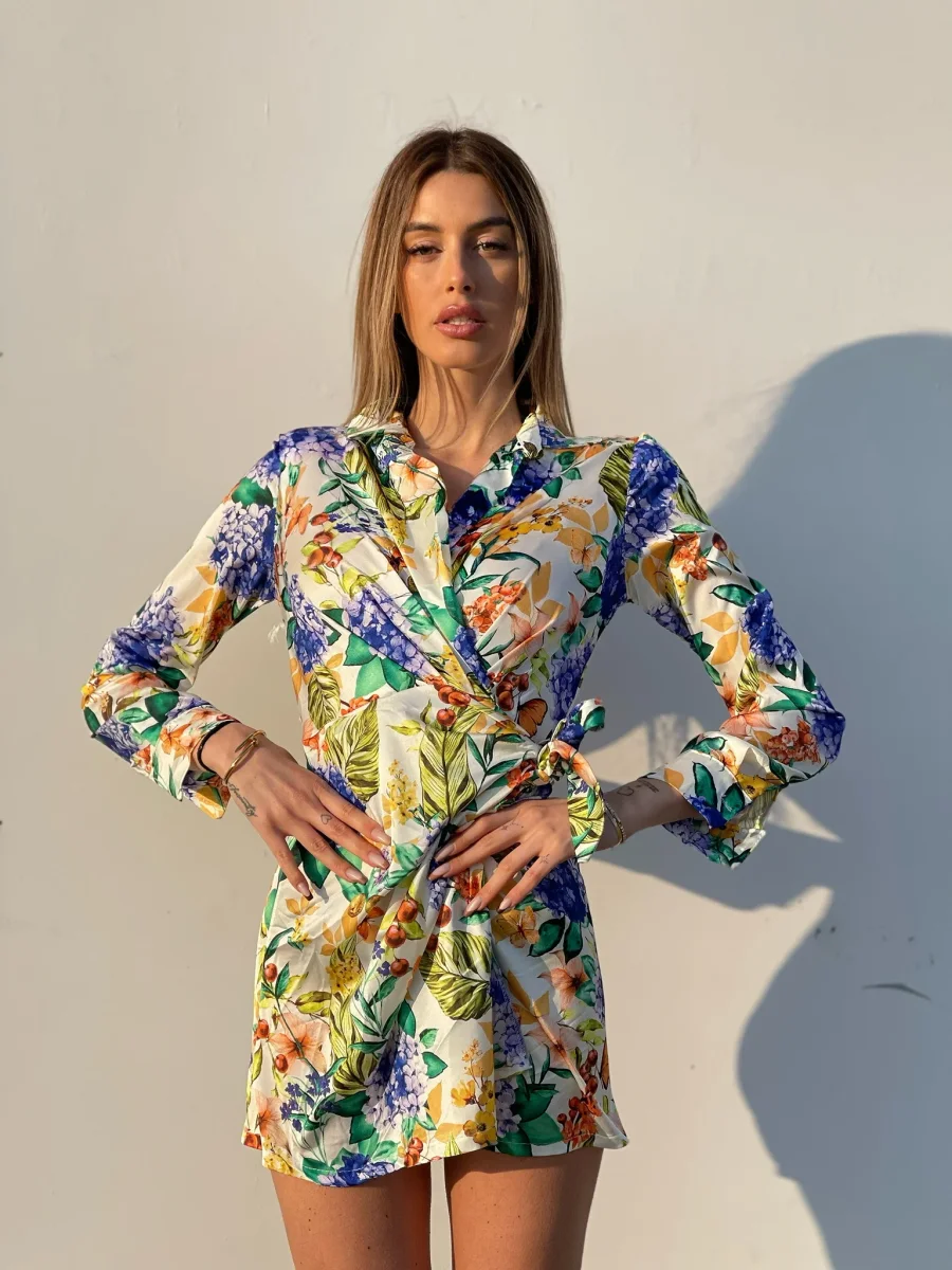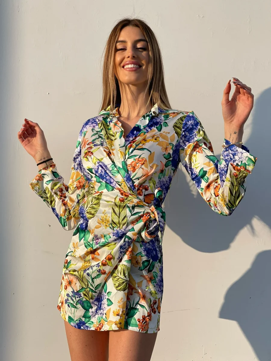 Abito in raso con chiusura a portafoglio stampa a fiori. Chiusura con fiocco sul davanti.