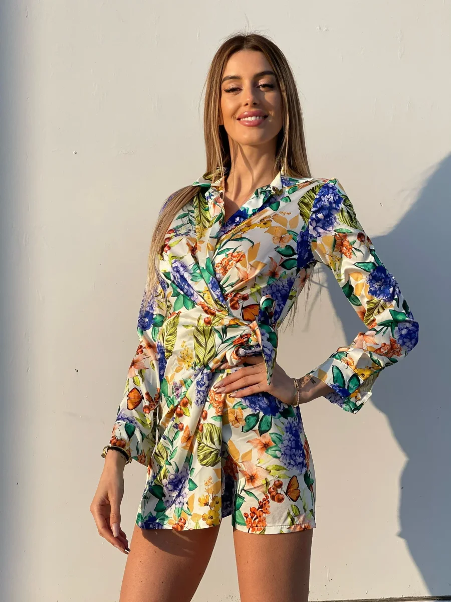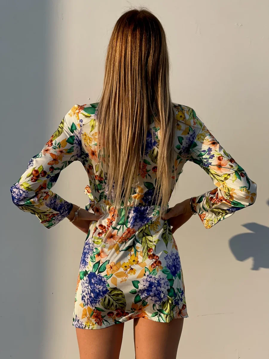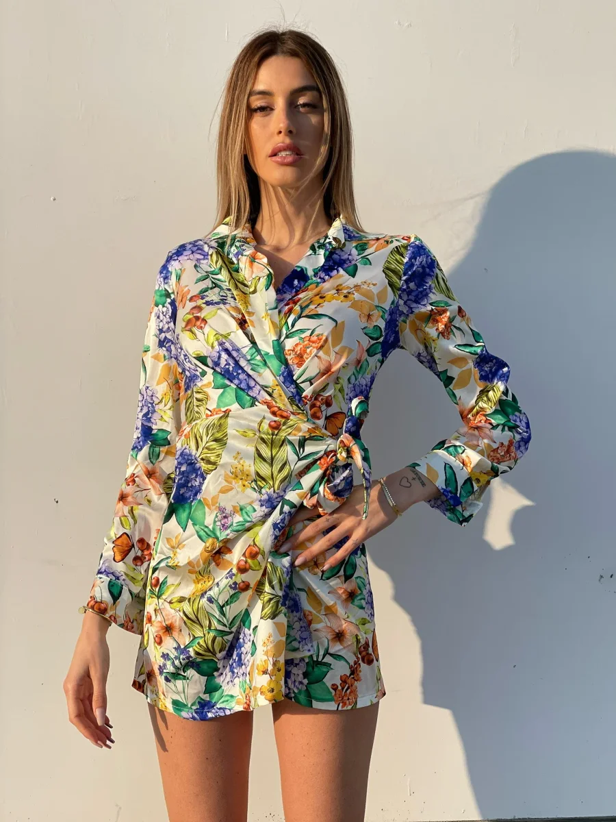 Abito in raso con chiusura a portafoglio stampa a fiori. Chiusura con fiocco sul davanti.