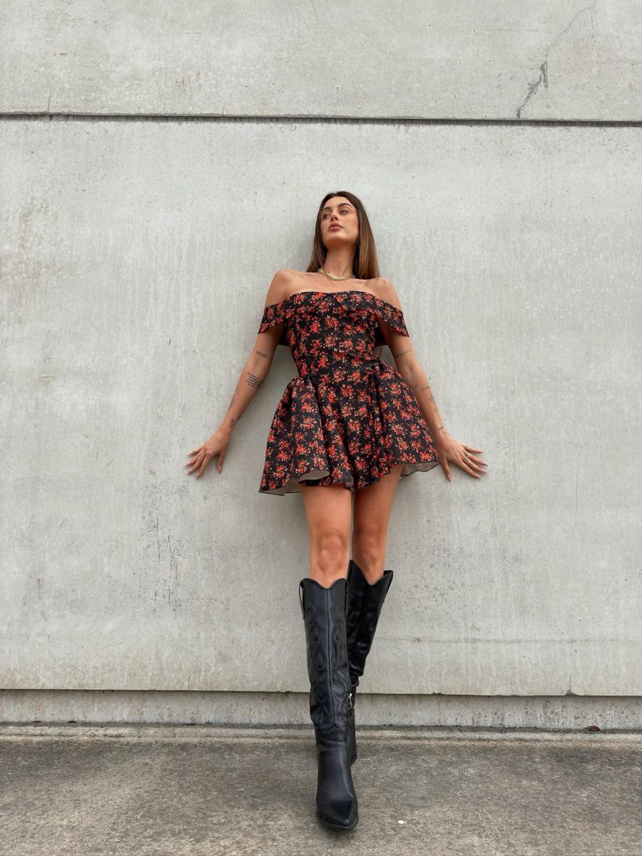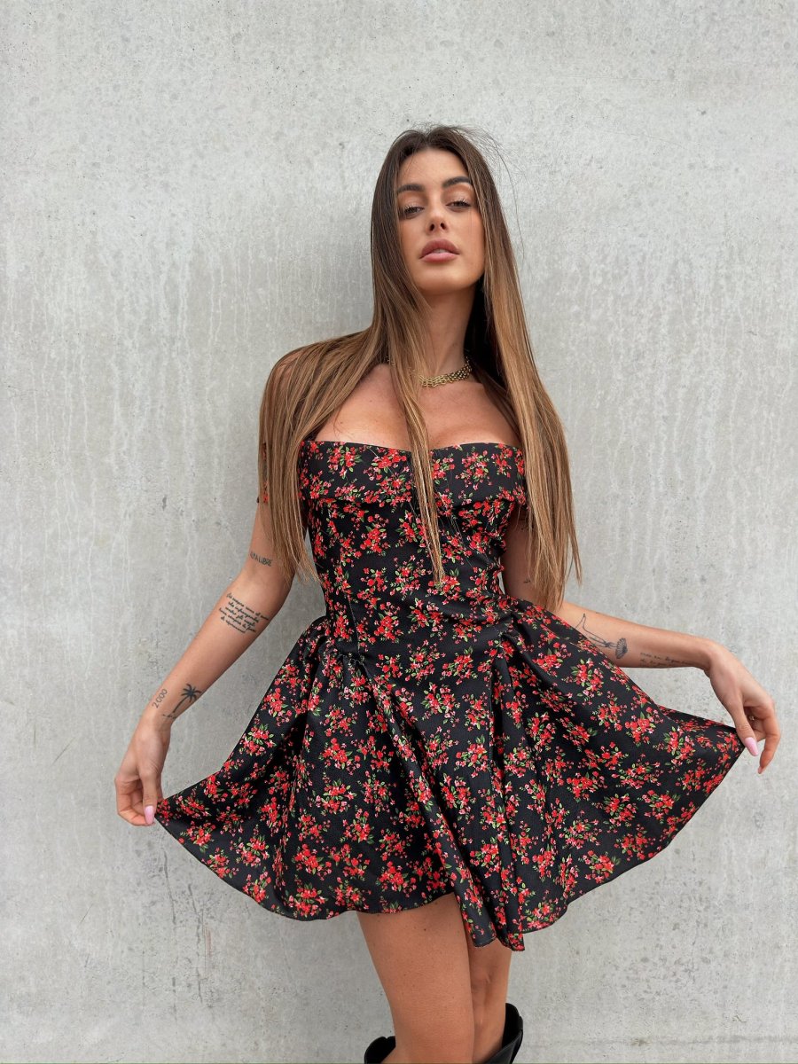 Abito con scollo a barchetta dotato anche di spalline e zip nel dietro. Fiocco nel dietro