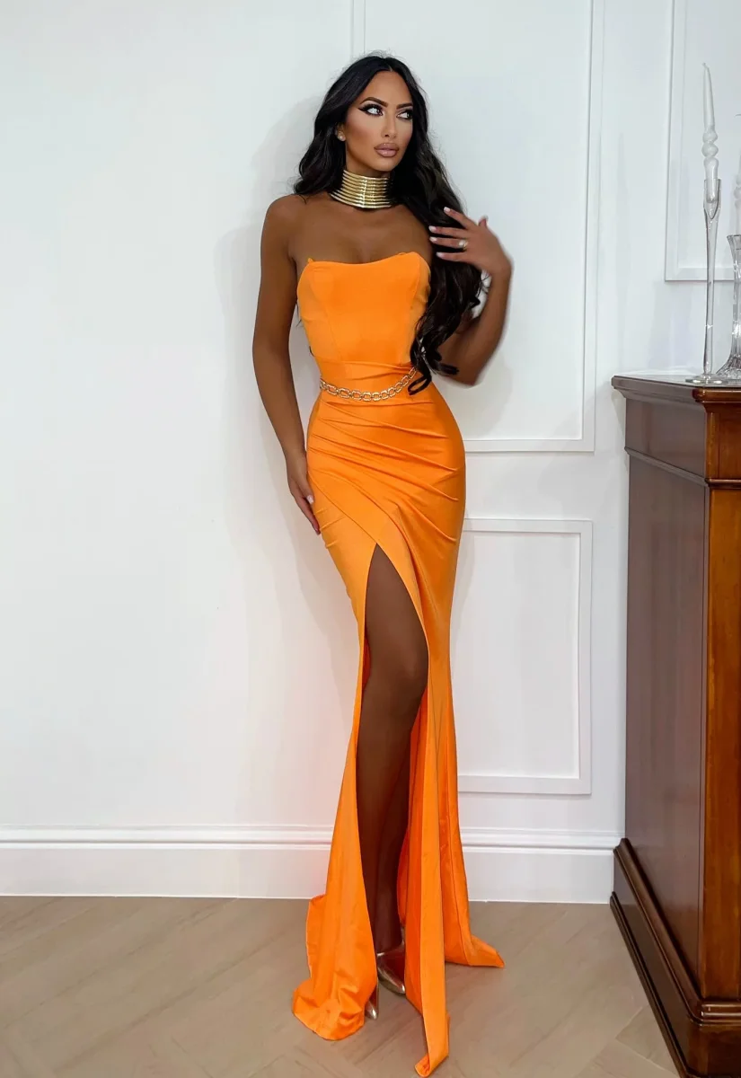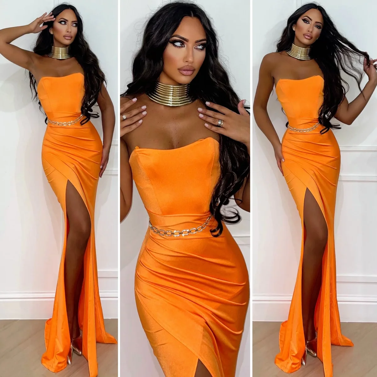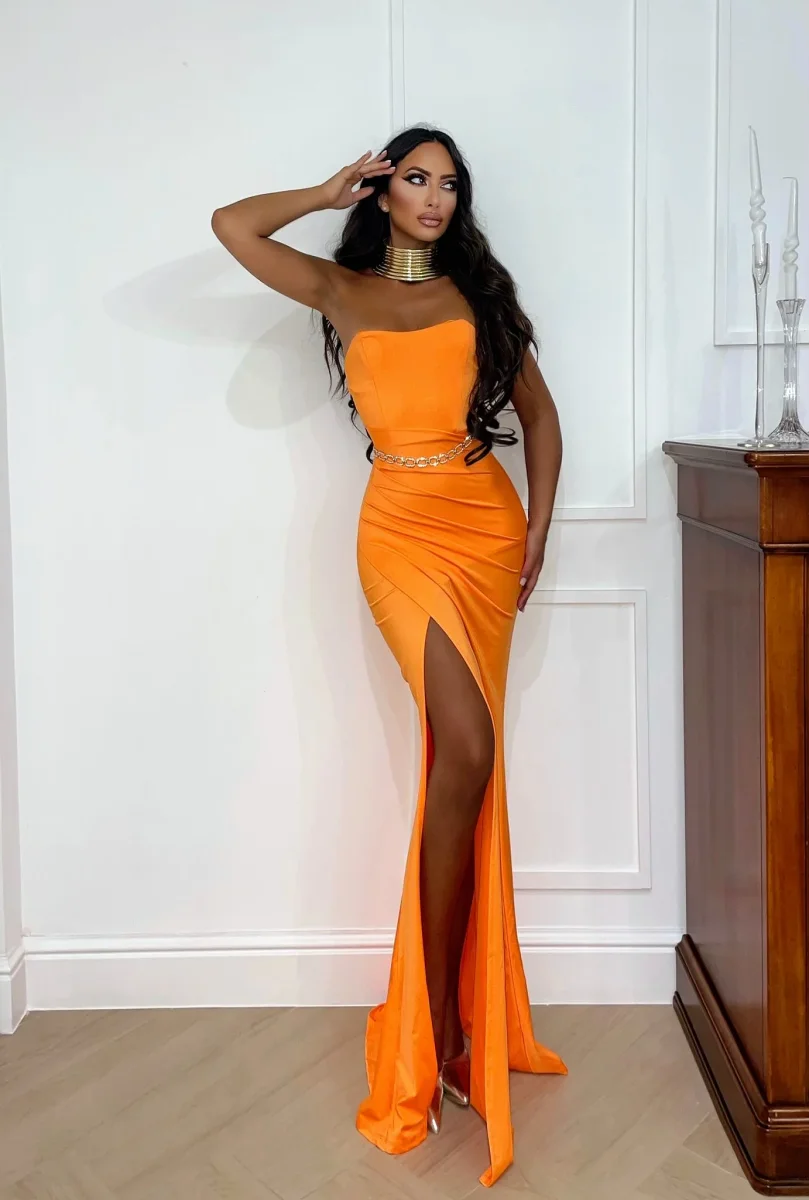 Abito a fascia in lycra aderente e elasticizzato senza coppe con stecche a sostegno anteriori, bretelline utilizzabili all’occorrenza. Maxi spacco vertiginoso e gonna lunghissima