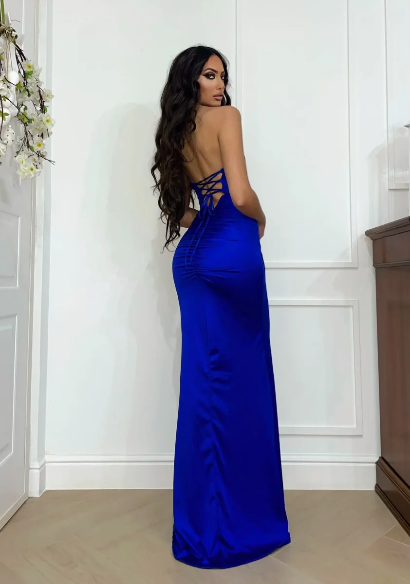 Abito a fascia in lycra aderente e elasticizzato senza coppe con stecche a sostegno anteriori, bretelline utilizzabili all’occorrenza. Maxi spacco vertiginoso e gonna lunghissima