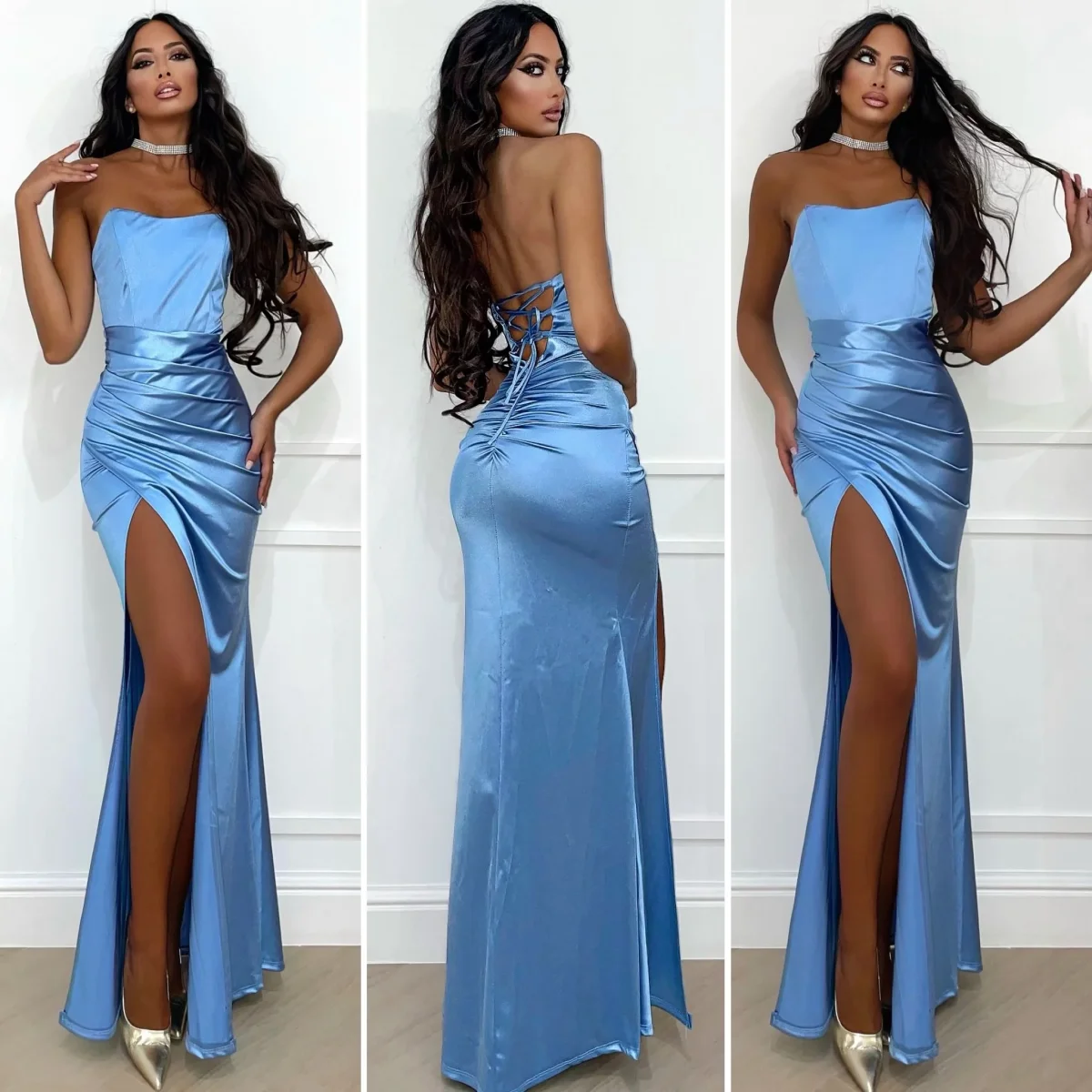 Abito a fascia in lycra aderente e elasticizzato senza coppe con stecche a sostegno anteriori, bretelline utilizzabili all’occorrenza. Maxi spacco vertiginoso e gonna lunghissima