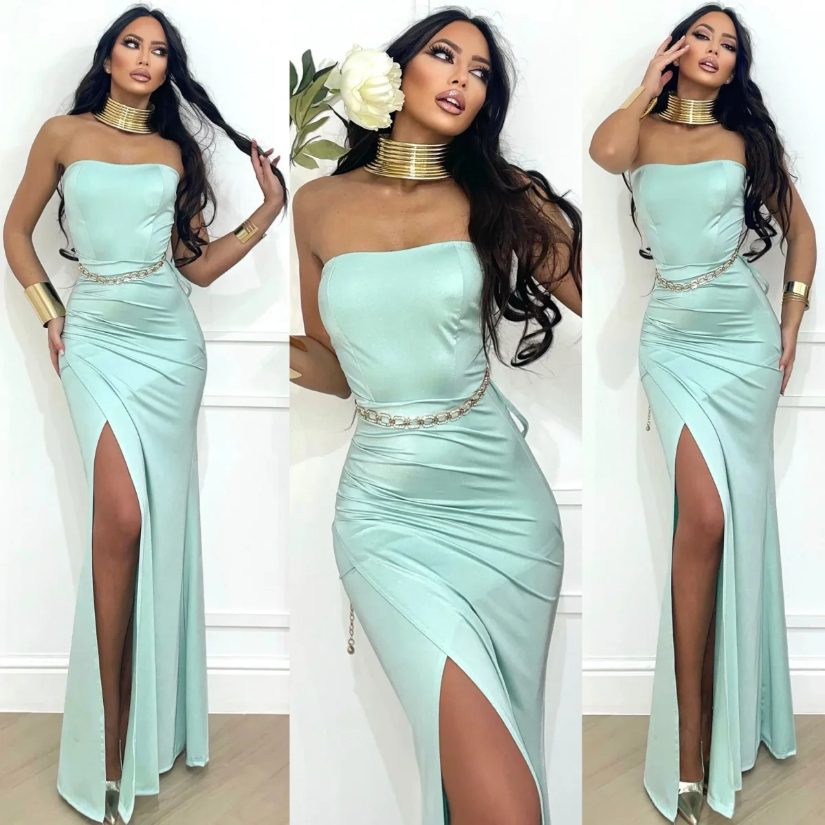 Abito a fascia in lycra aderente e elasticizzato senza coppe. Maxi spacco vertiginoso e gonna lunghissima