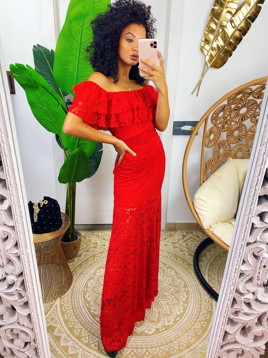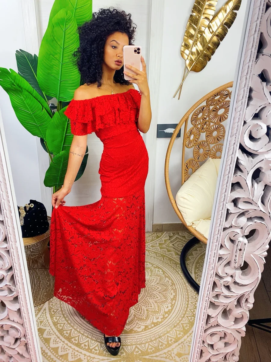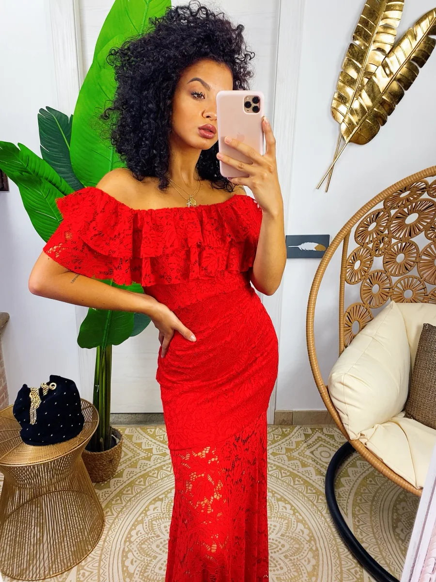 Abito in delicato pizzo con scollo a barchetta. Lunga gonna a sirena aderente sui fianchi. Look seducente e elegante
