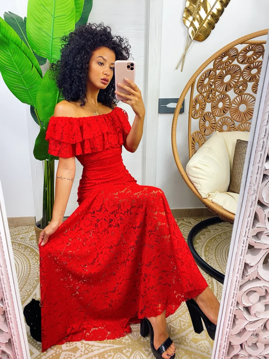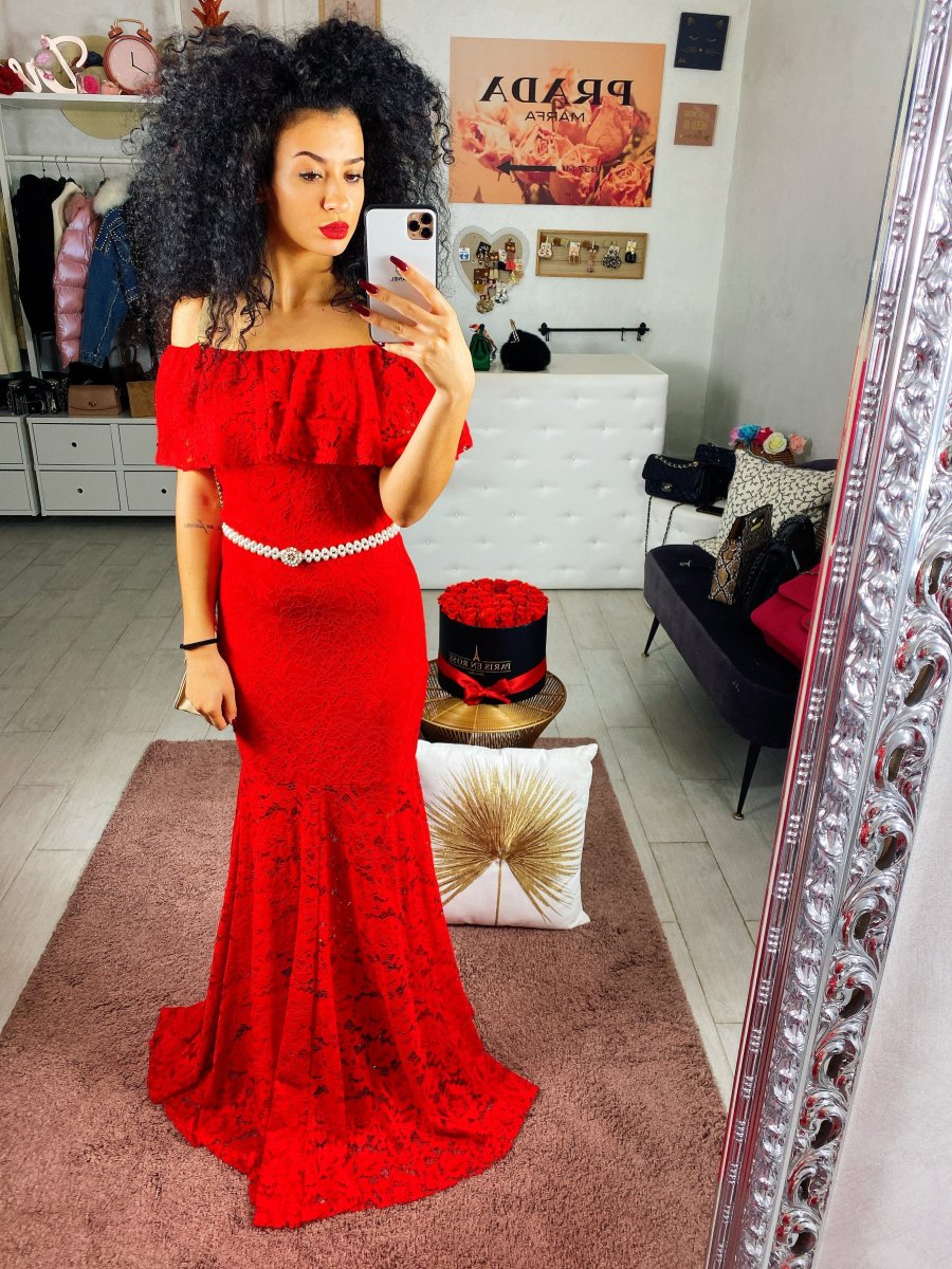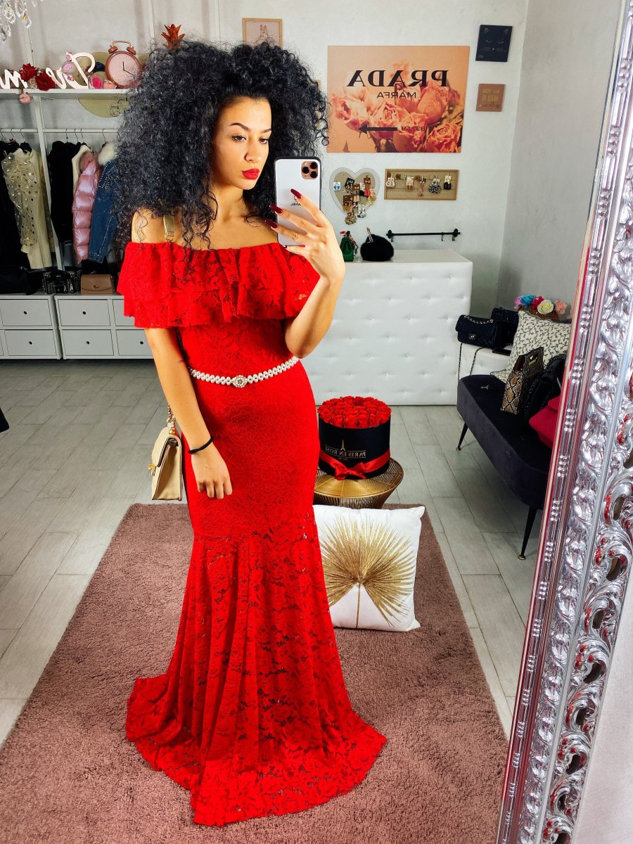 Abito in delicato pizzo con scollo a barchetta. Lunga gonna a sirena aderente sui fianchi. Look seducente e elegante