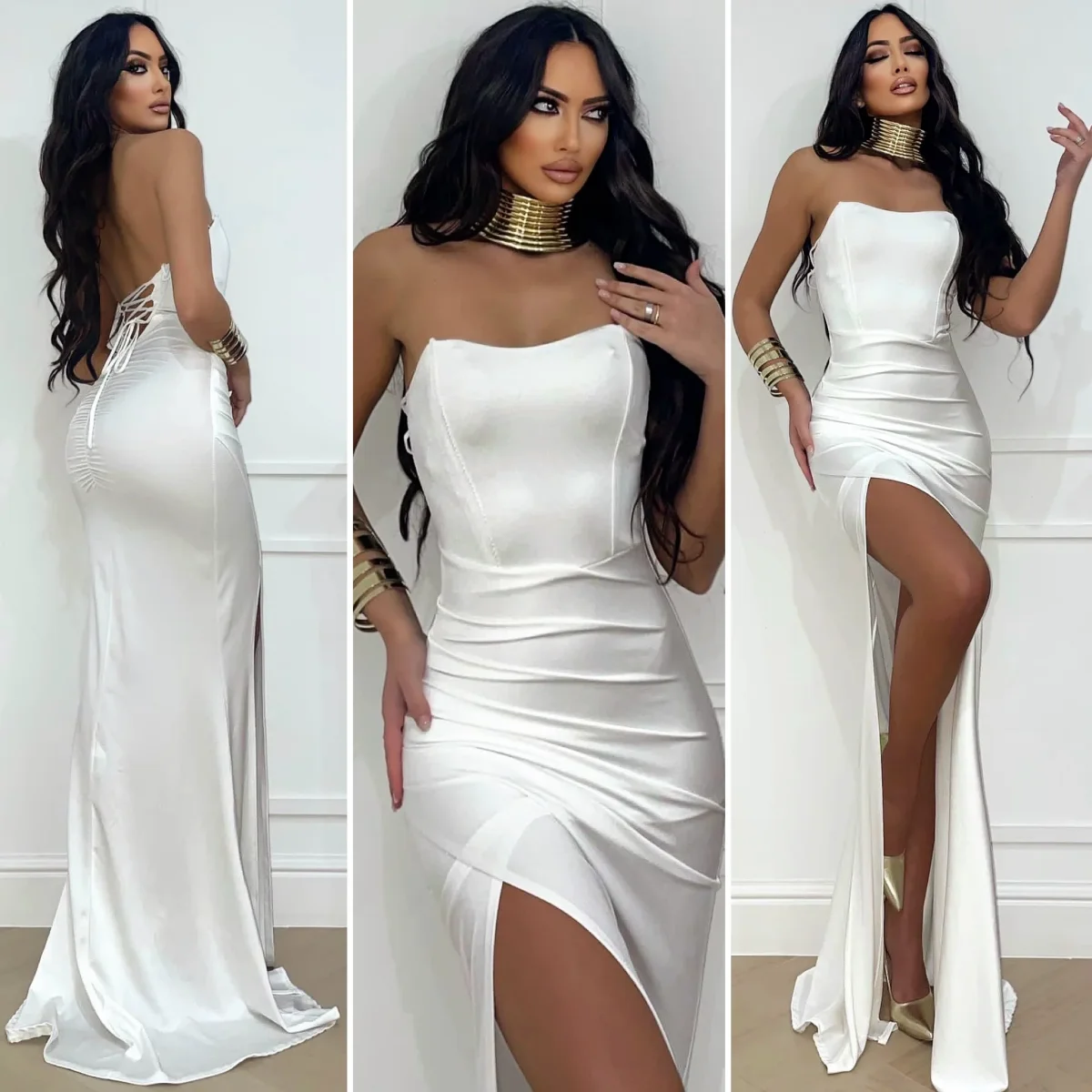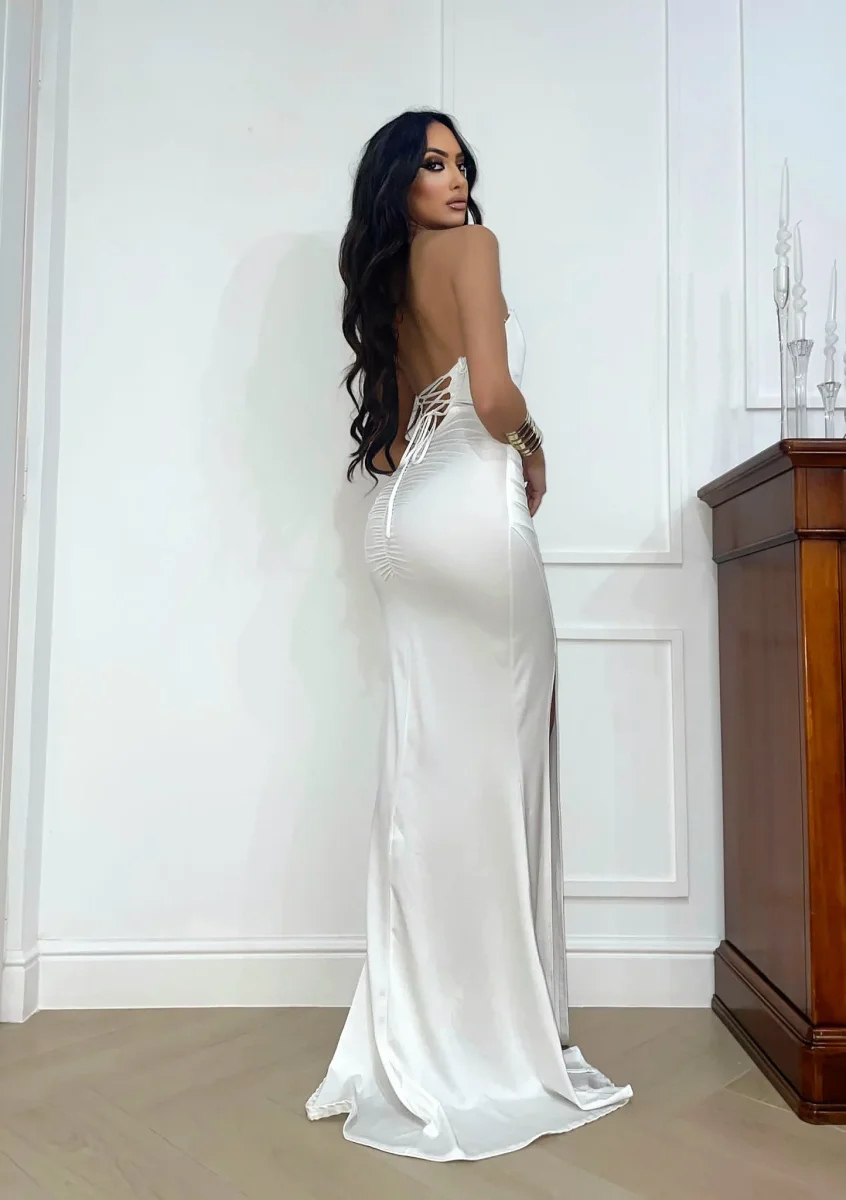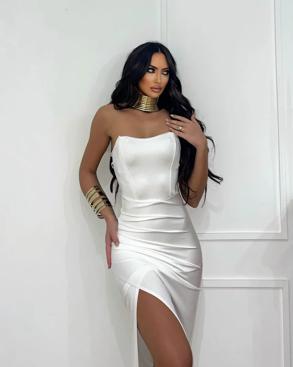 Abito a fascia in lycra aderente e elasticizzato senza coppe con stecche a sostegno anteriori, bretelline utilizzabili all’occorrenza. Maxi spacco vertiginoso e gonna lunghissima