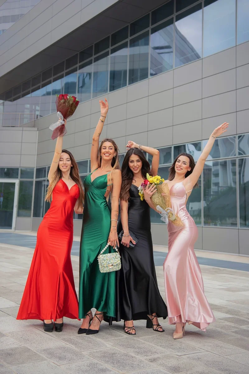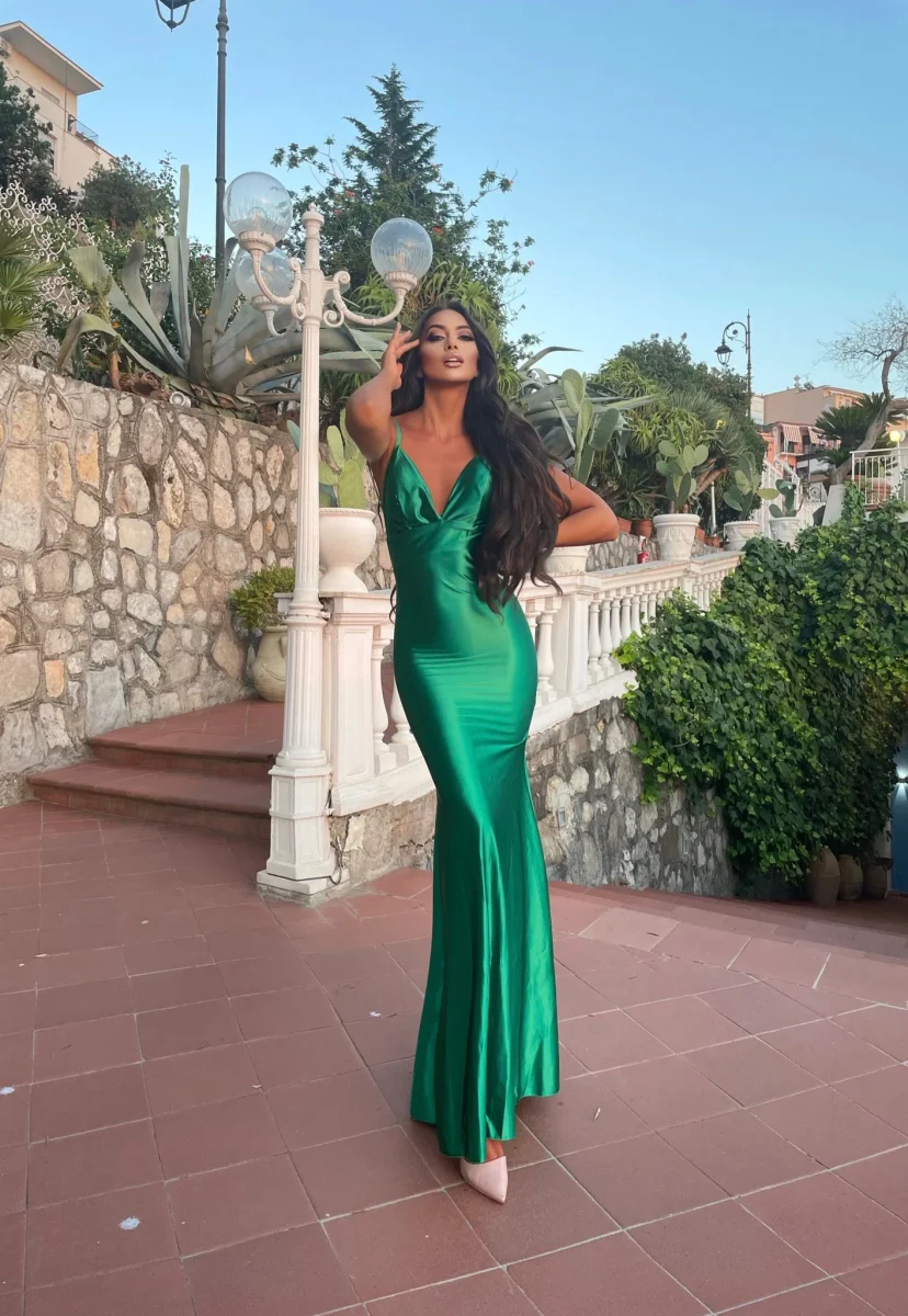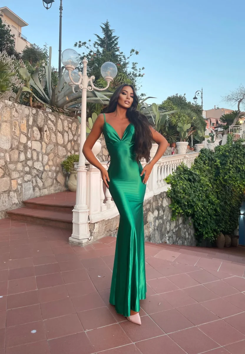 Abito in raso spesso e semi rigido con coppe e gonna a sirena. Chiusura con zip.