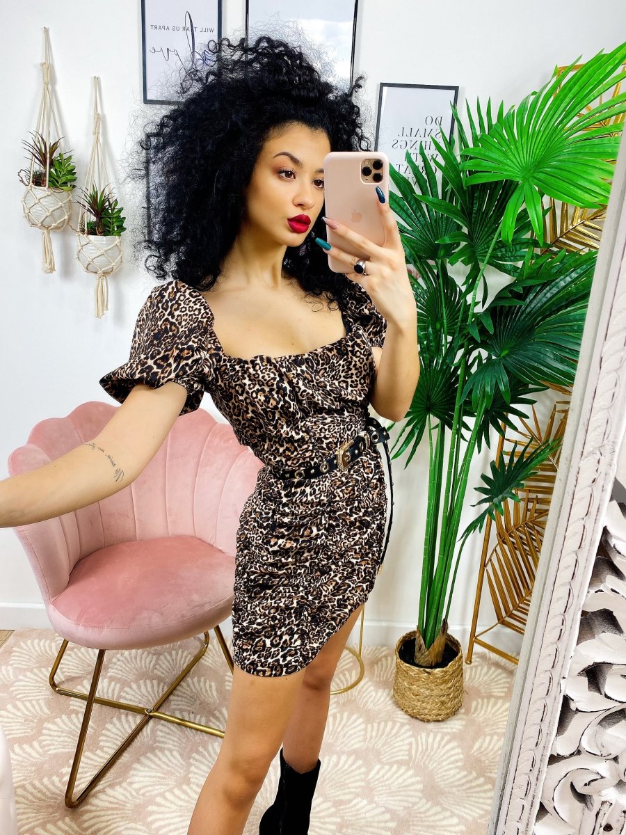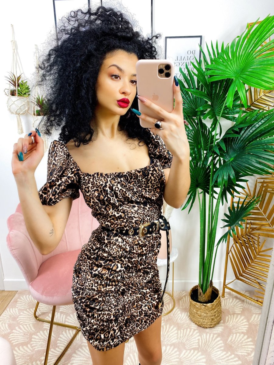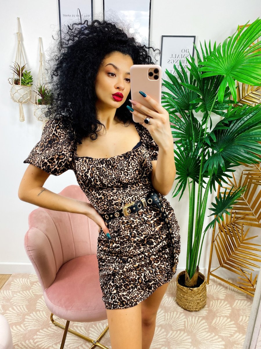 Abito aderente in trama maculata. Tessuto arricciato e manica a palloncino.