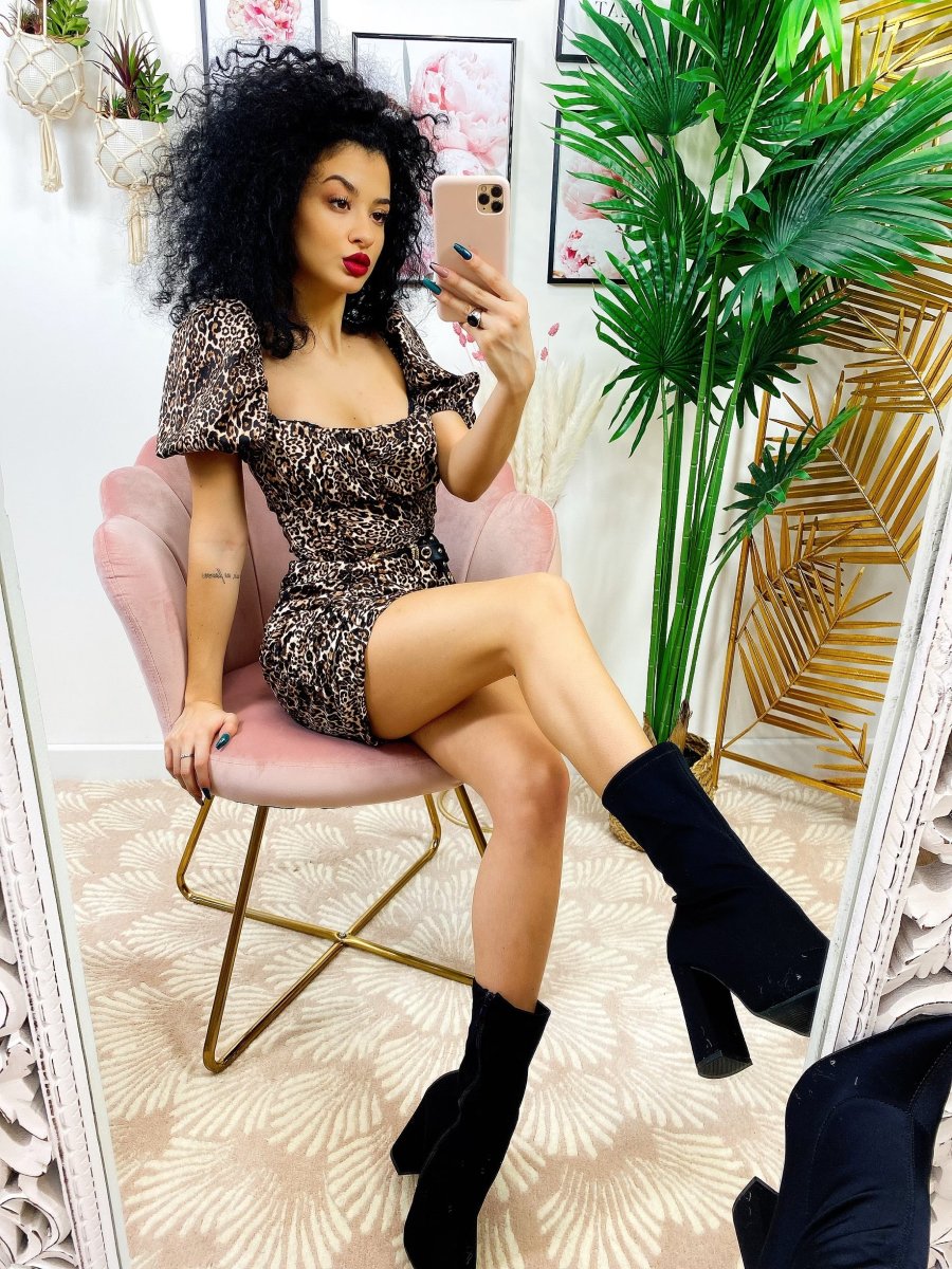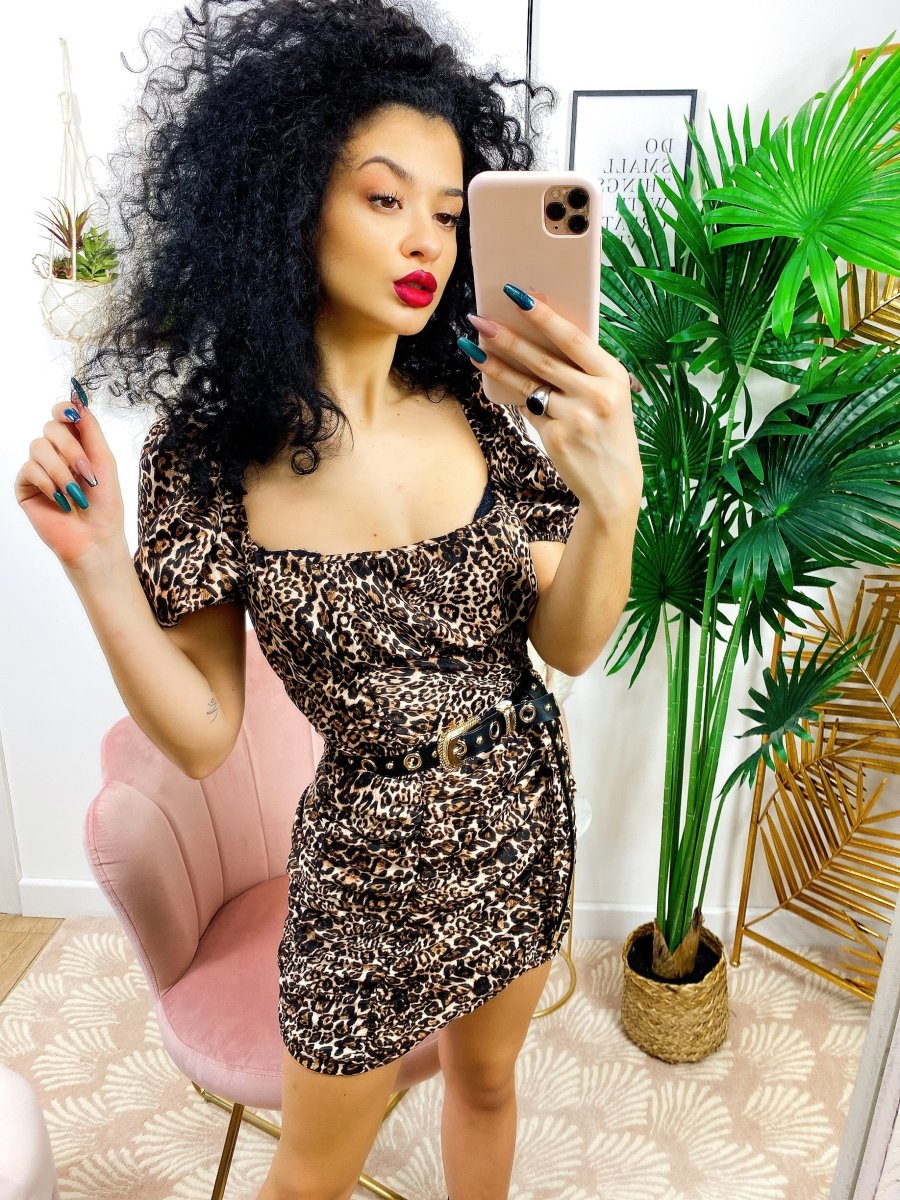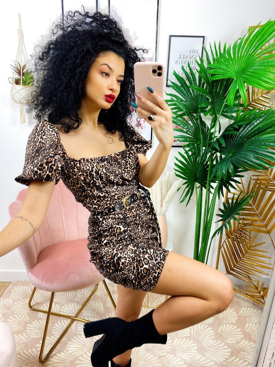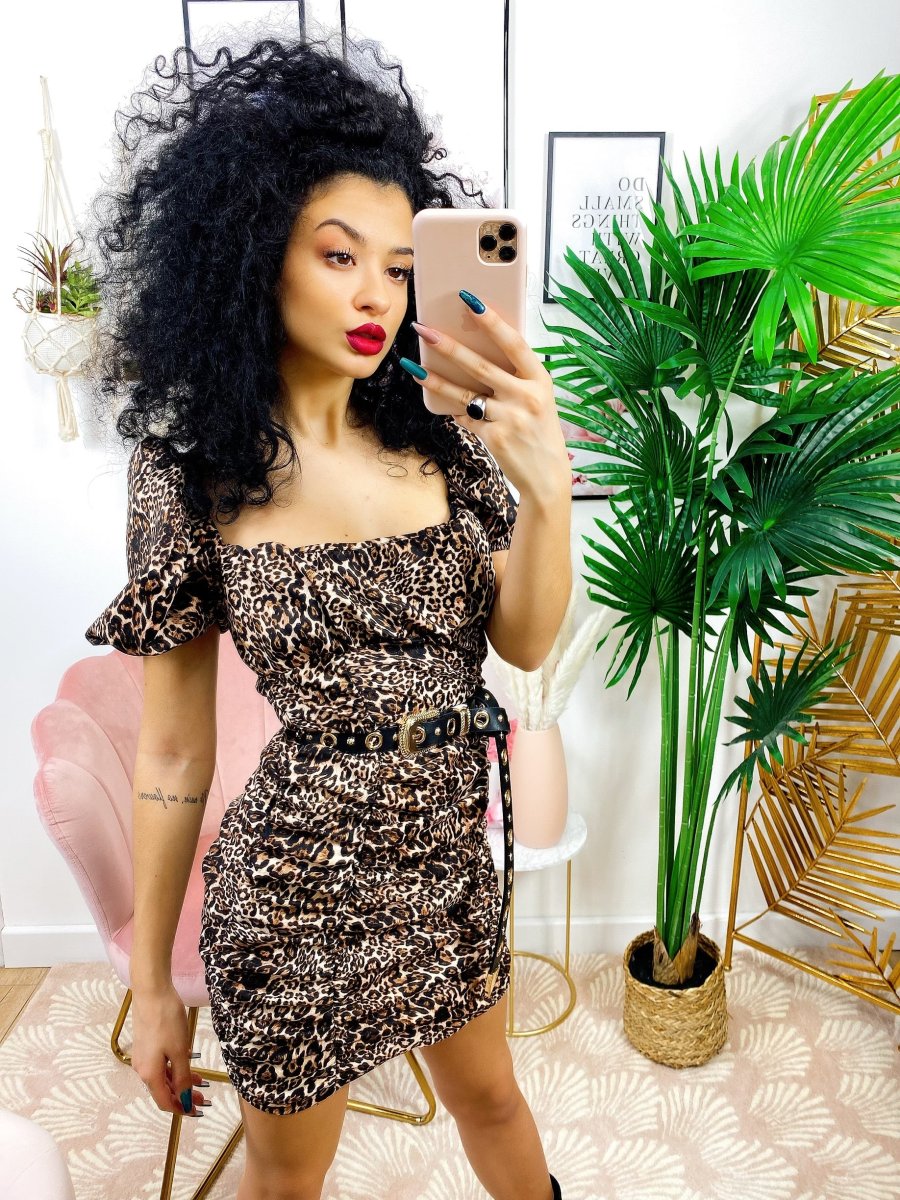 Abito aderente in trama maculata. Tessuto arricciato e manica a palloncino.