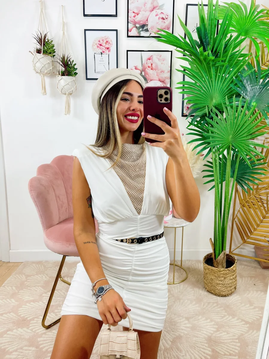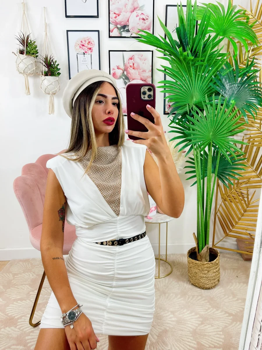 Abito aderente con spalline imbottite e scollo a V sul davanti ricoperto di strass.