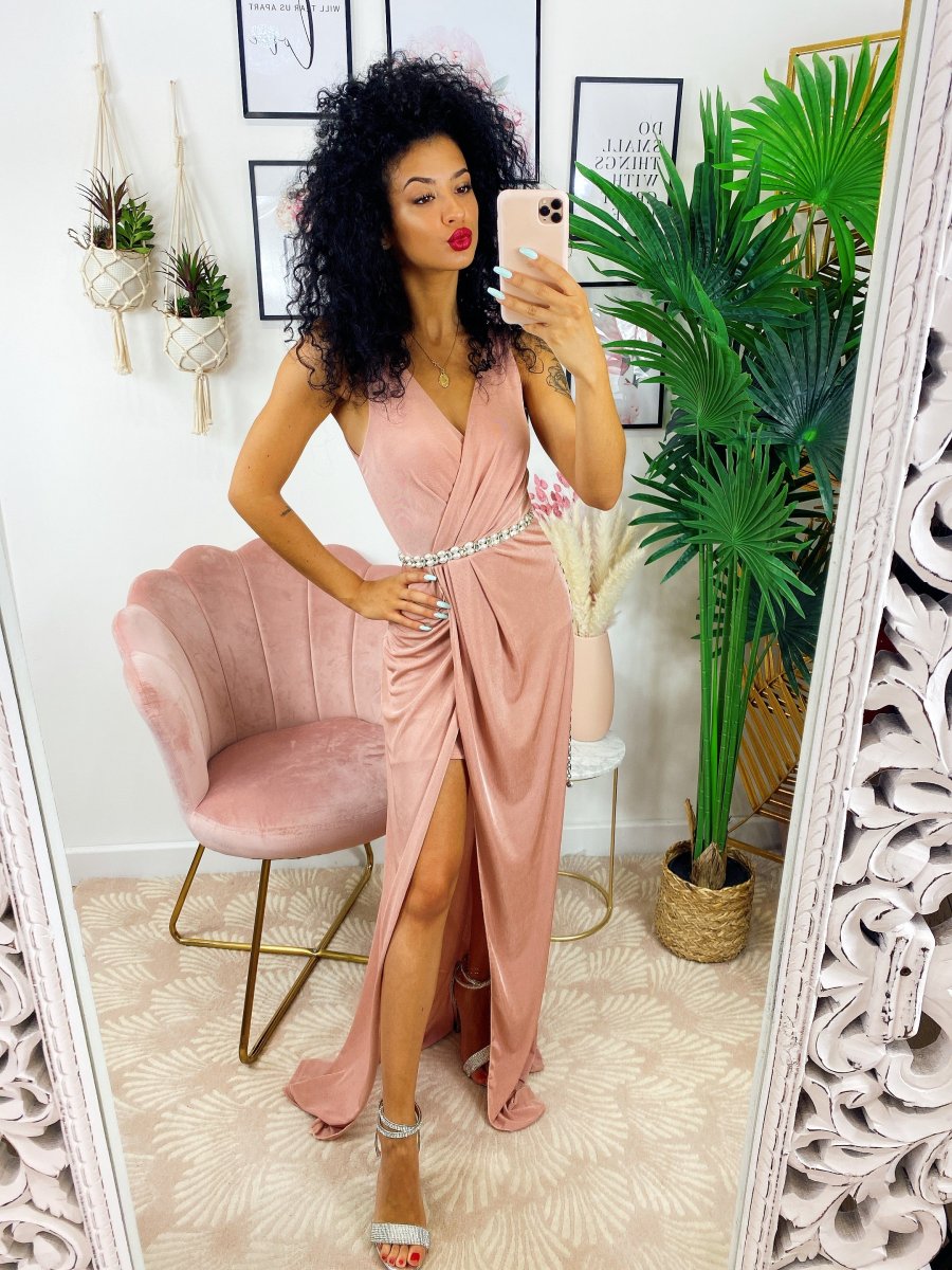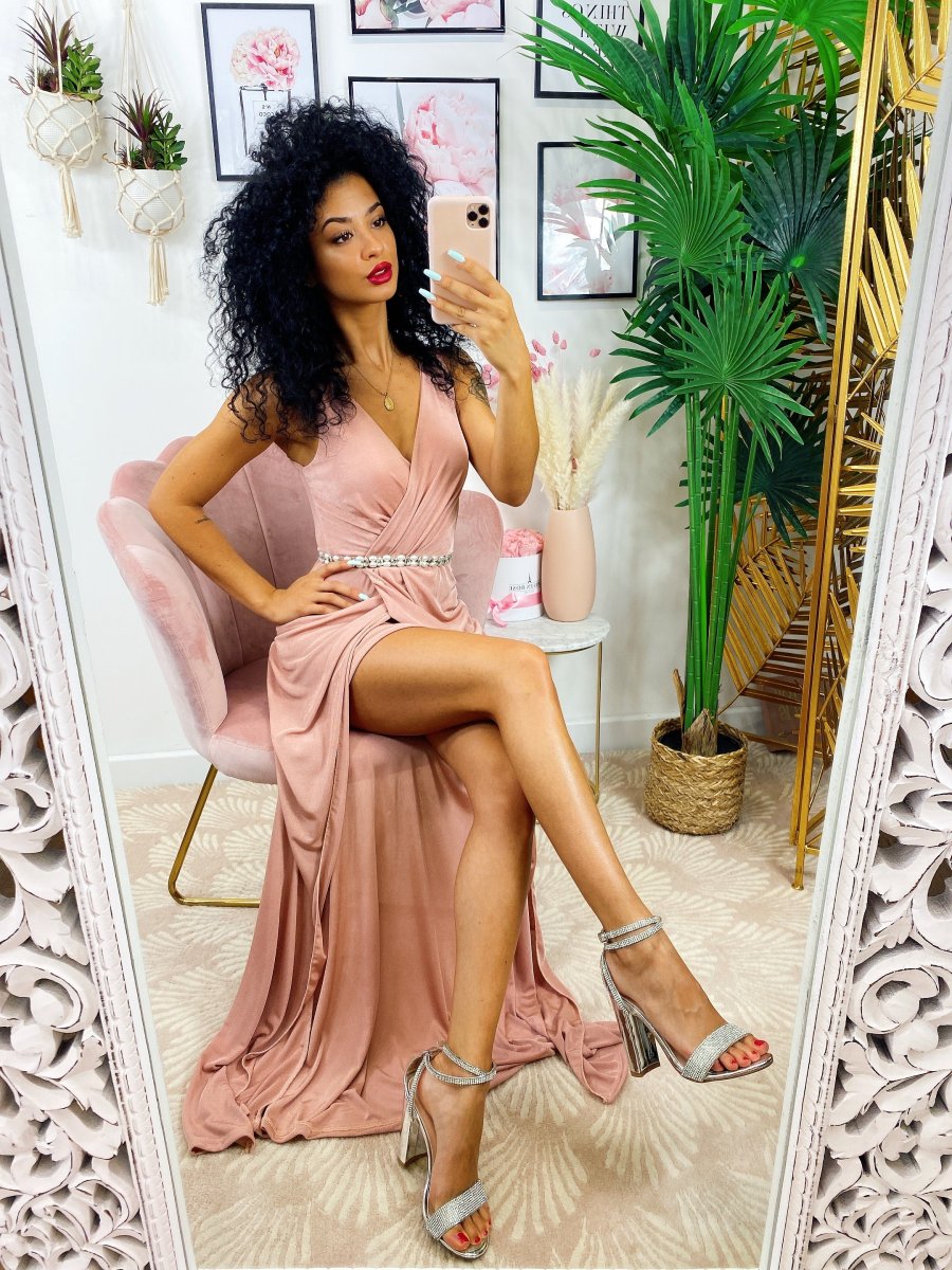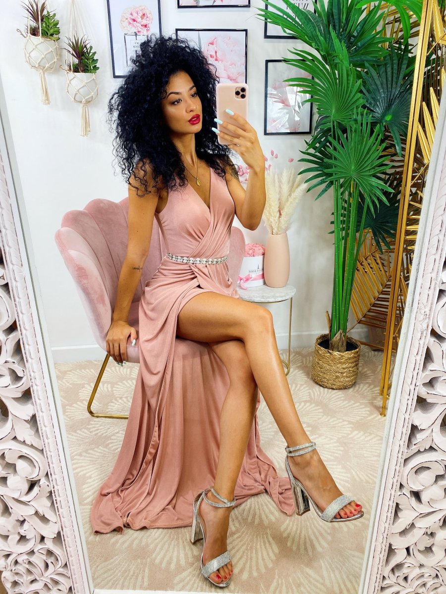 Abiro lungo aderente a tinta unita. Scollo a V e taglio in vita, spalline rafforzate e coppe.