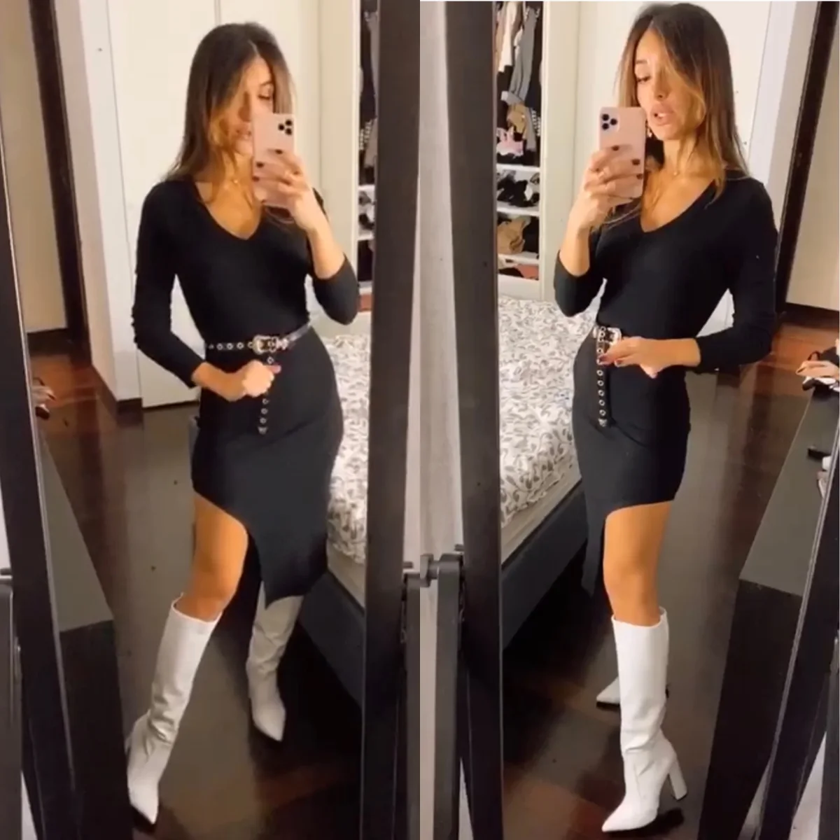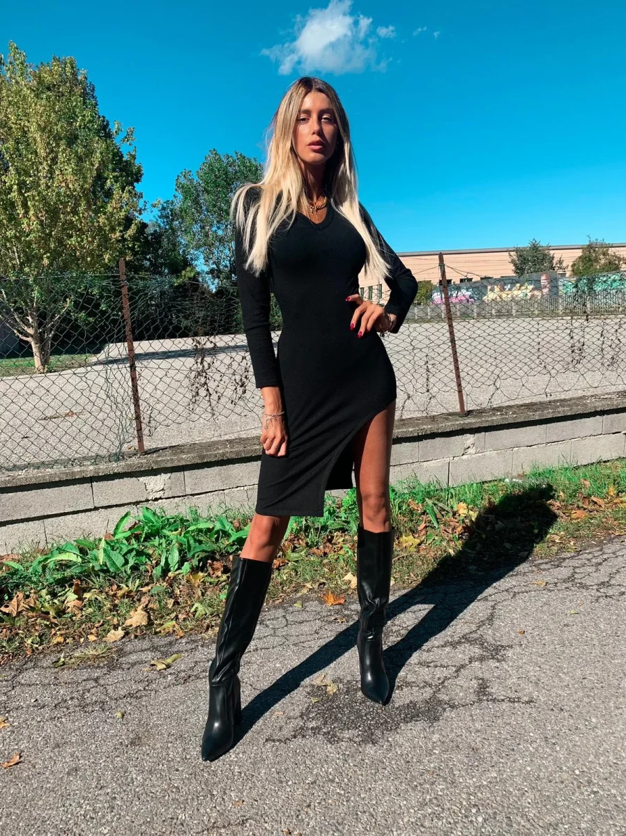 Tubino aderente con manica lunga. Tessuto a costine con scollo e maxi spacco . Abbinalo come vuoi