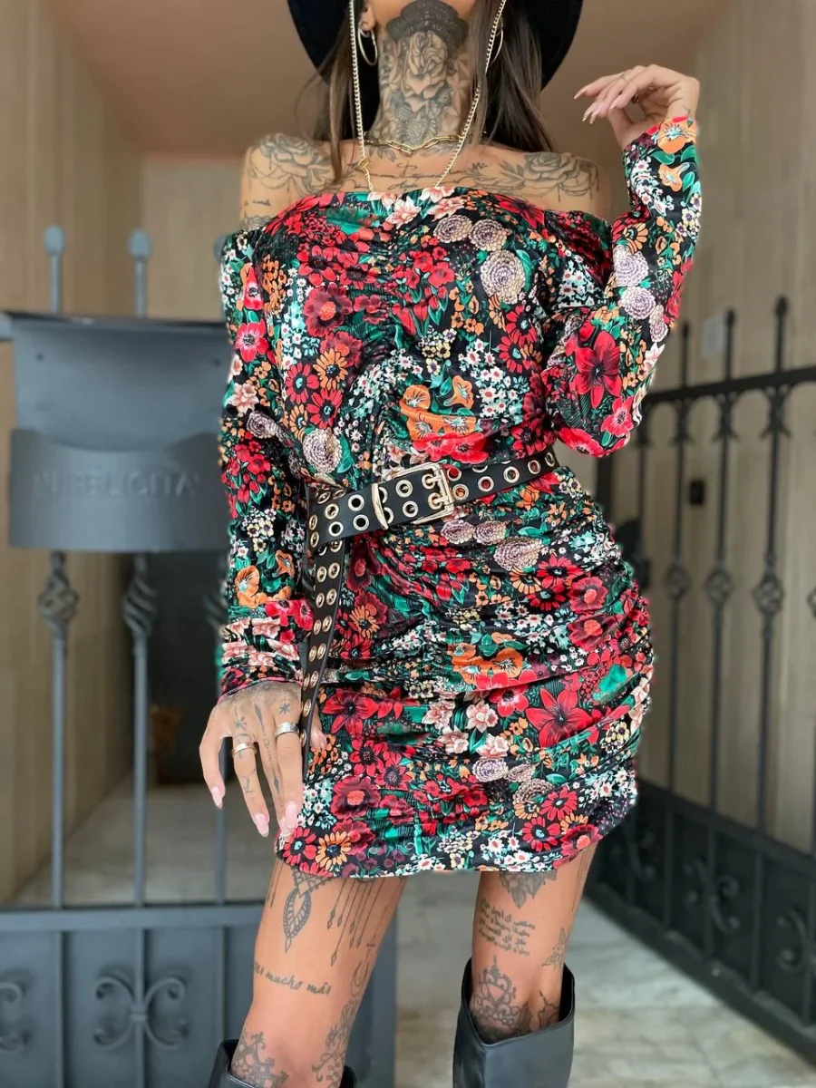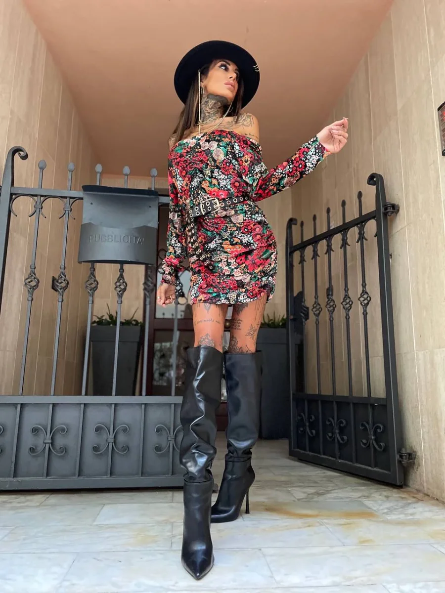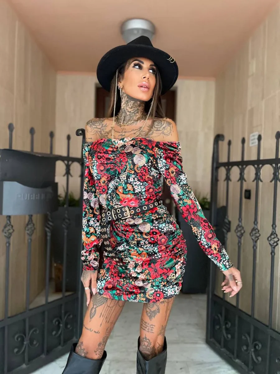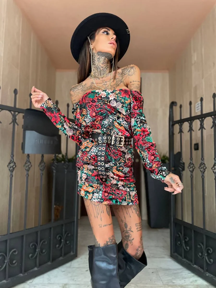 Abito in velluto aderente con trama a fiorellini, scollo regolabile a vostra scelta