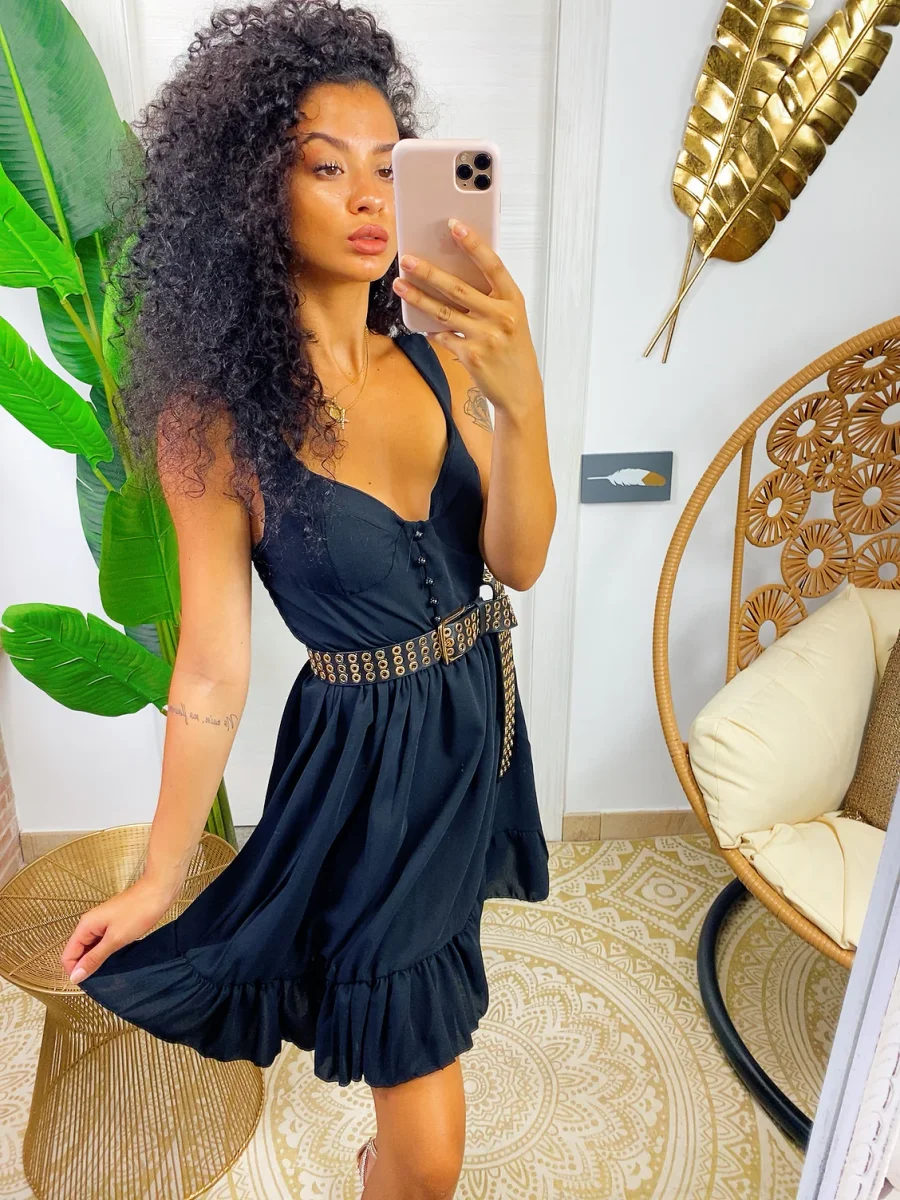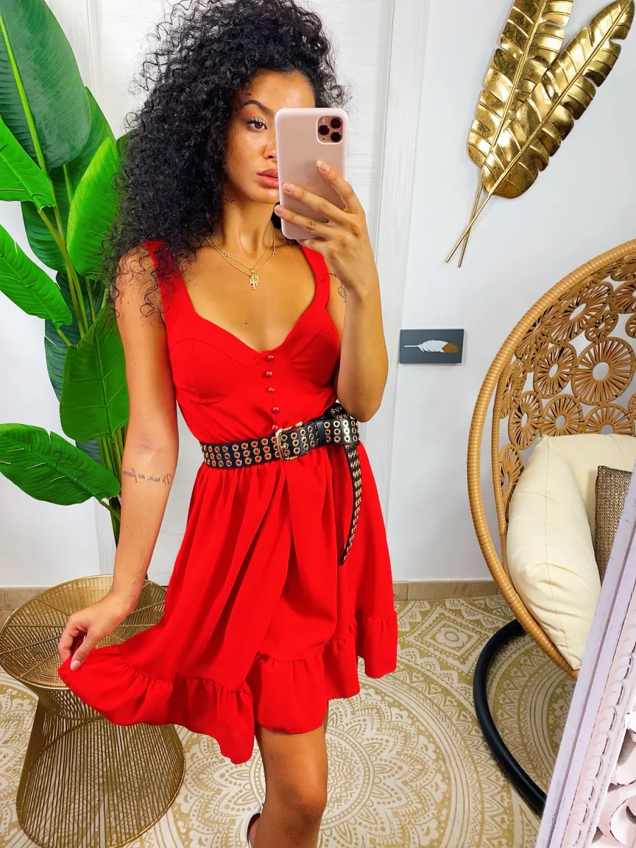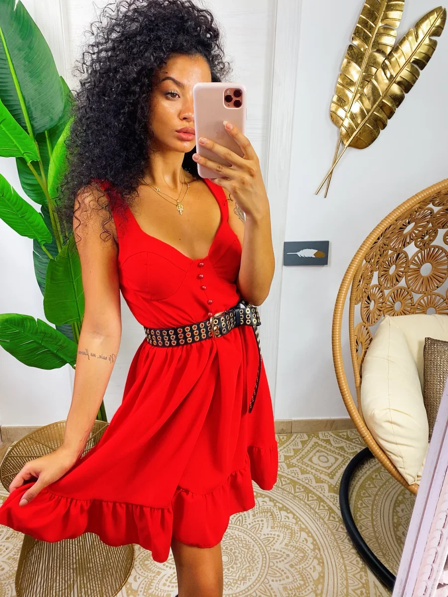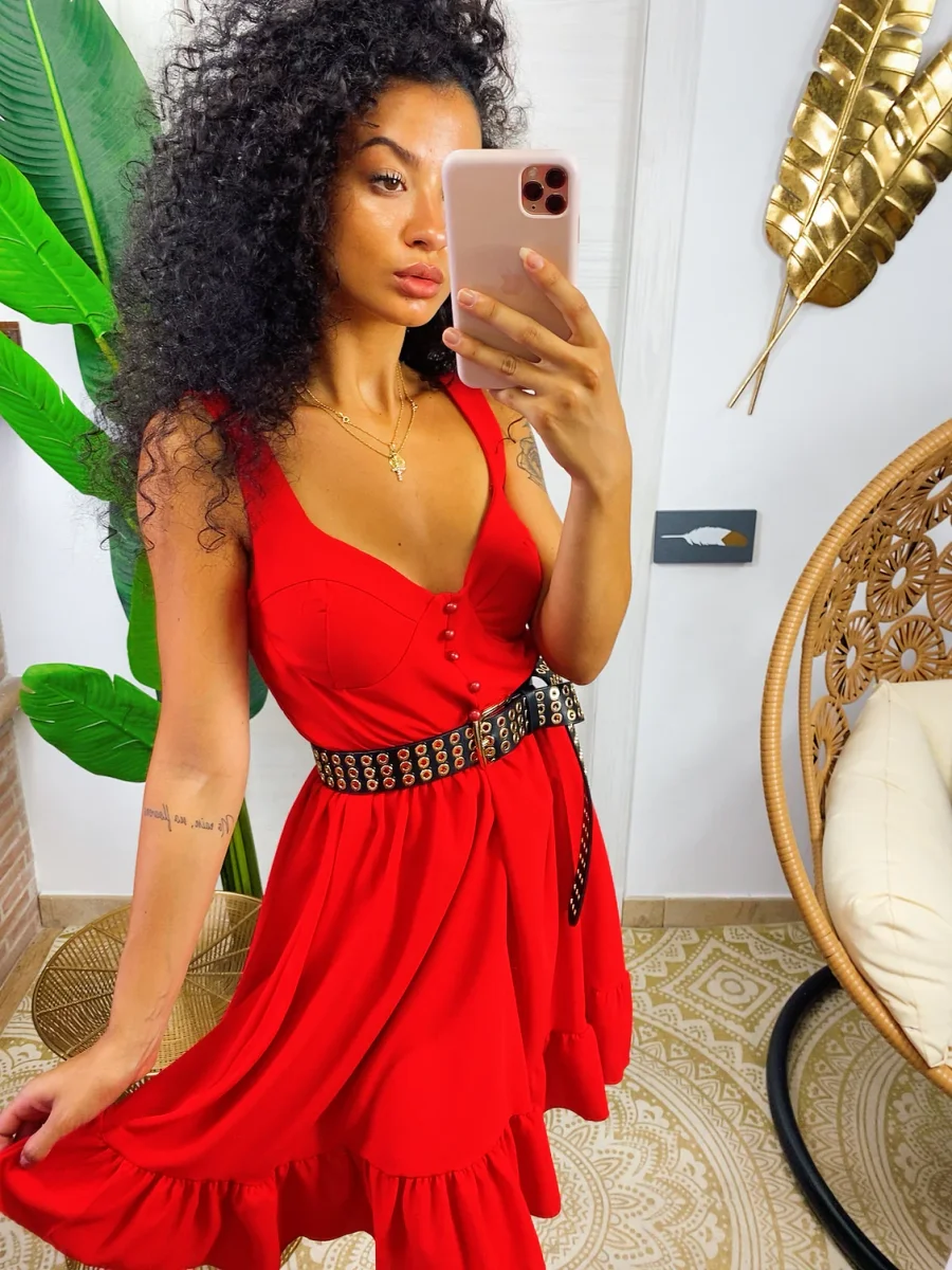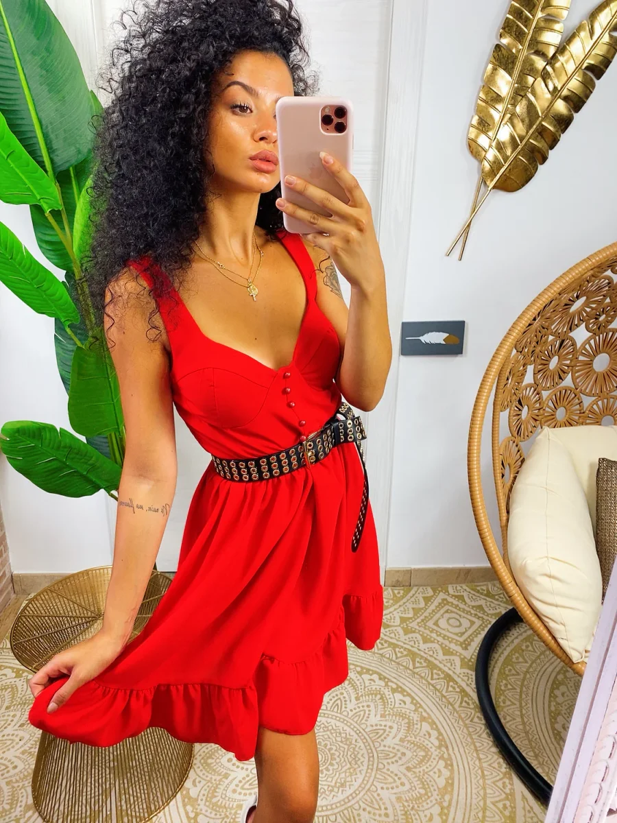 Abito a cuori con scollo a barchetta. Manichina e fusciacca in vita.