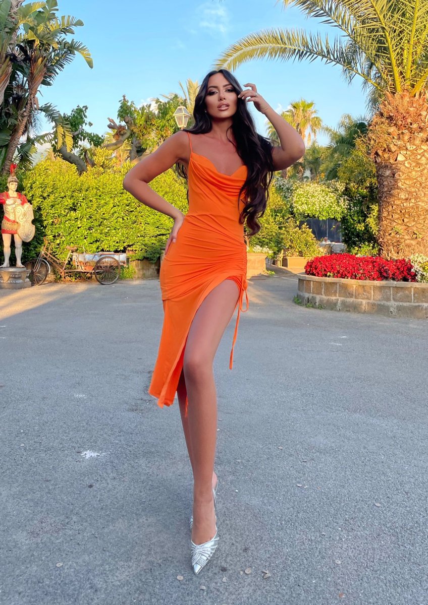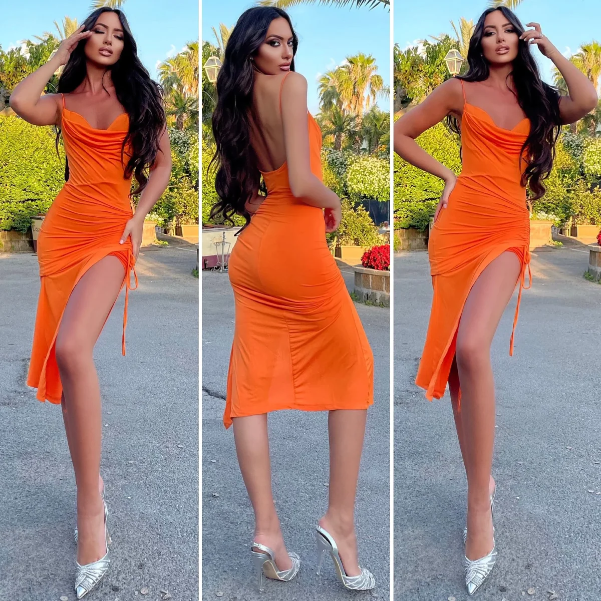 Abito in tessuto elasticizzato simil raso aderente con coppe e drappeggio laterale