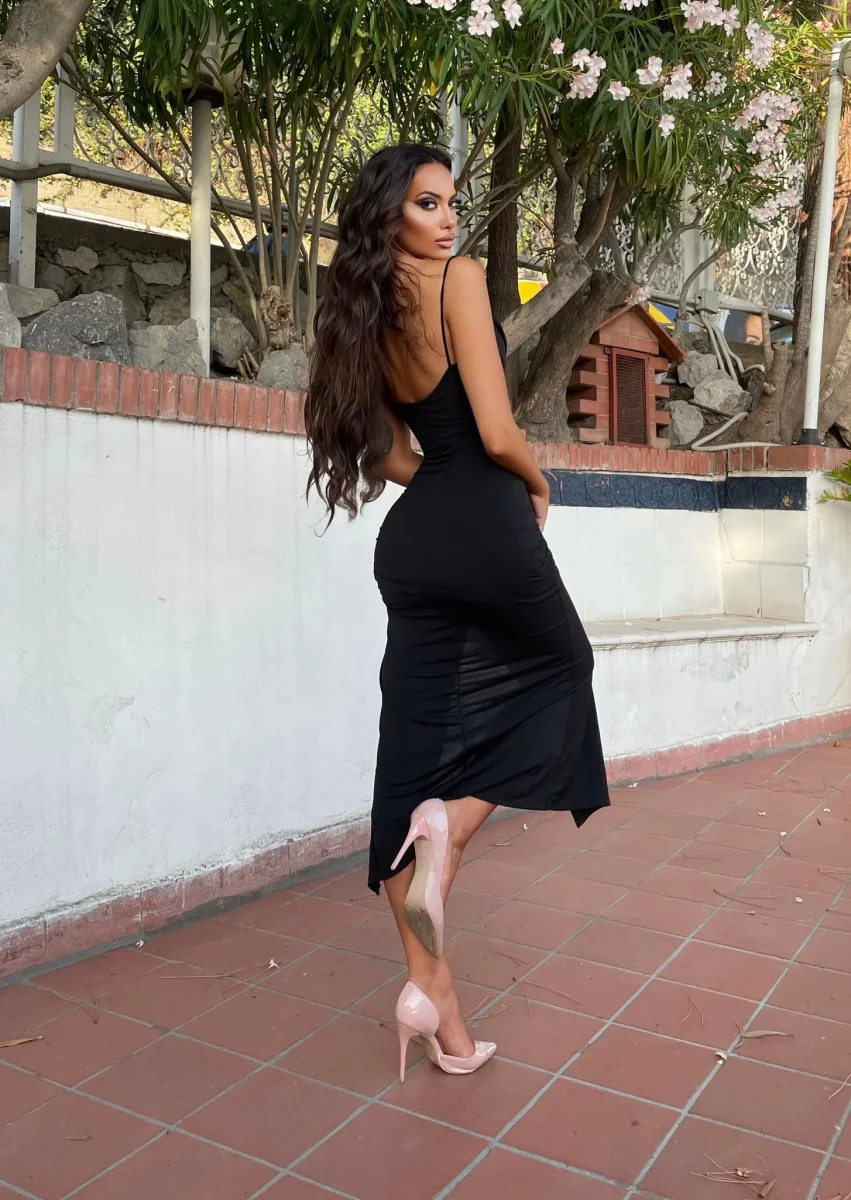 Abito in tessuto simil raso elasticizzato aderente con coppe e drappeggio laterale