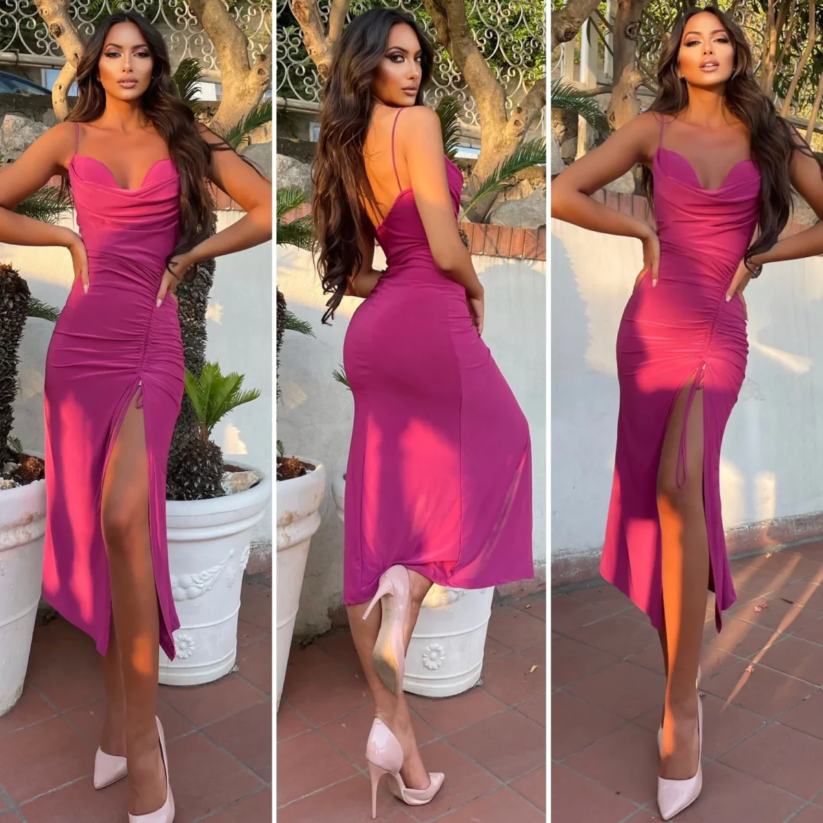 Abito in tessuto elasticizzato simil raso aderente con coppe e drappeggio laterale