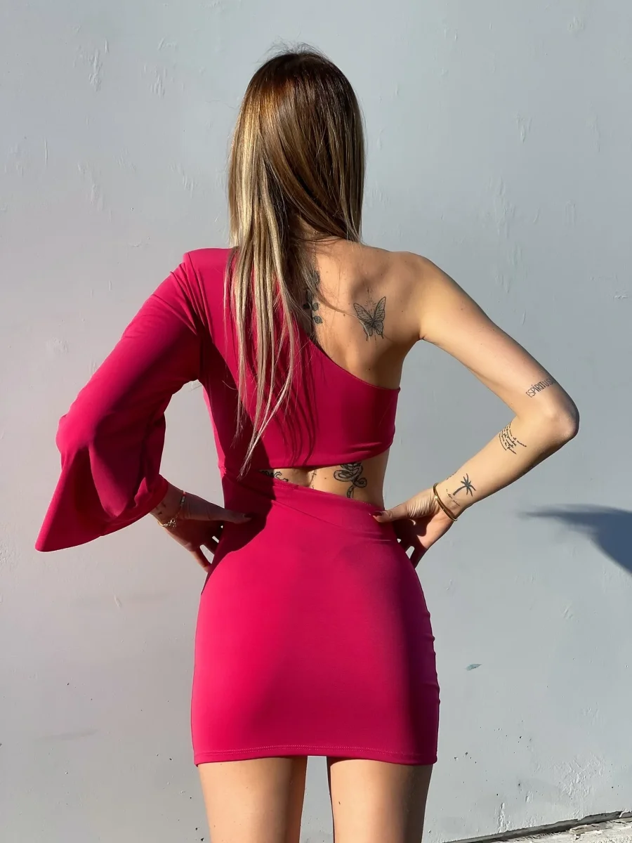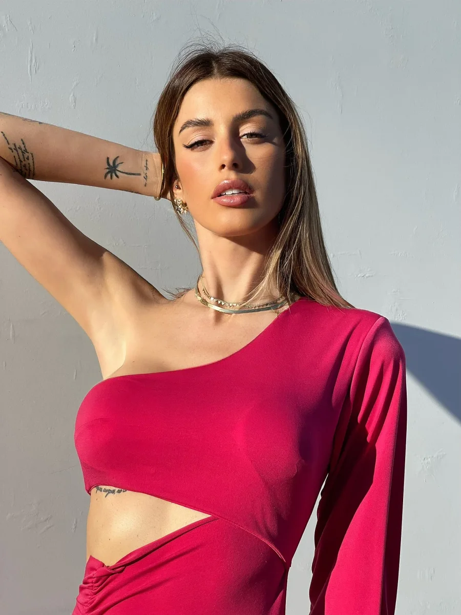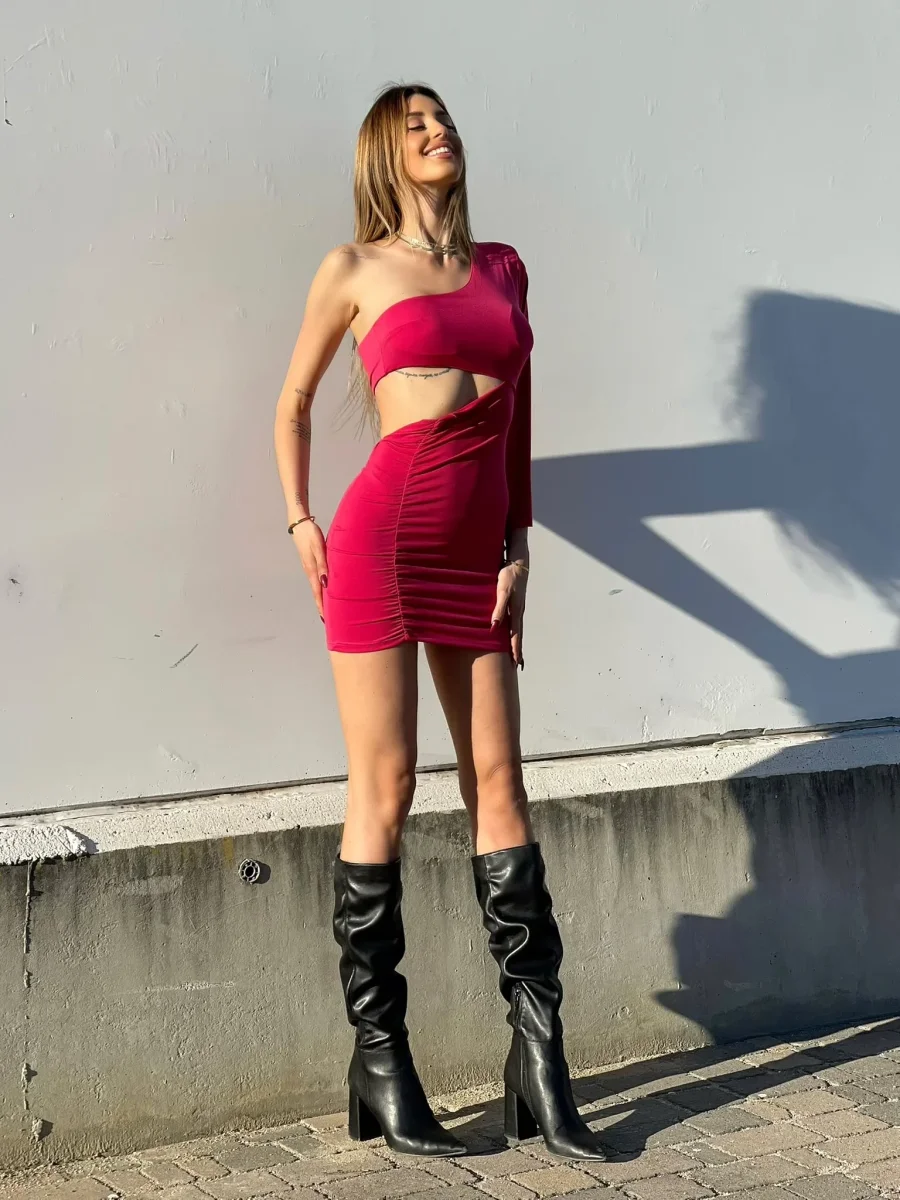 Abito aderente monospalla. Maxi obló sulla pancia.