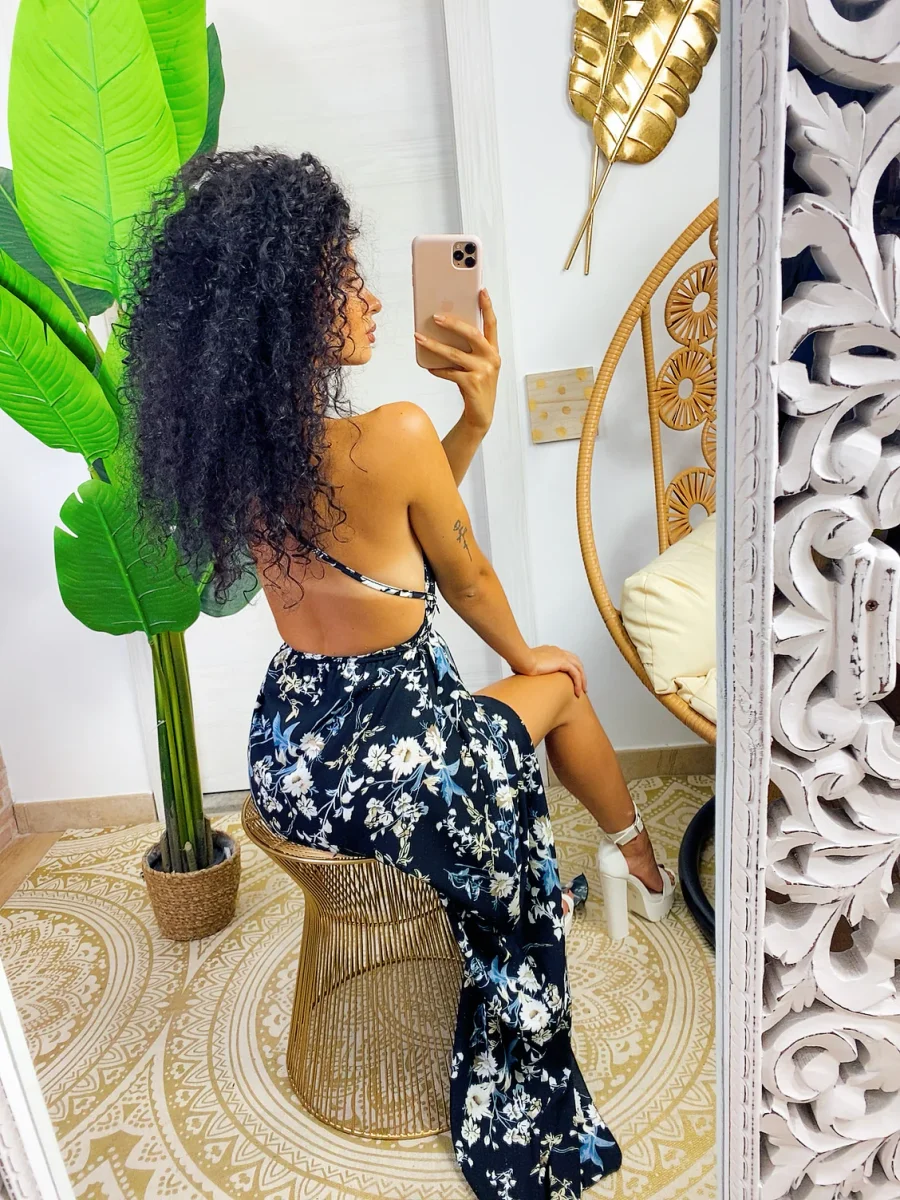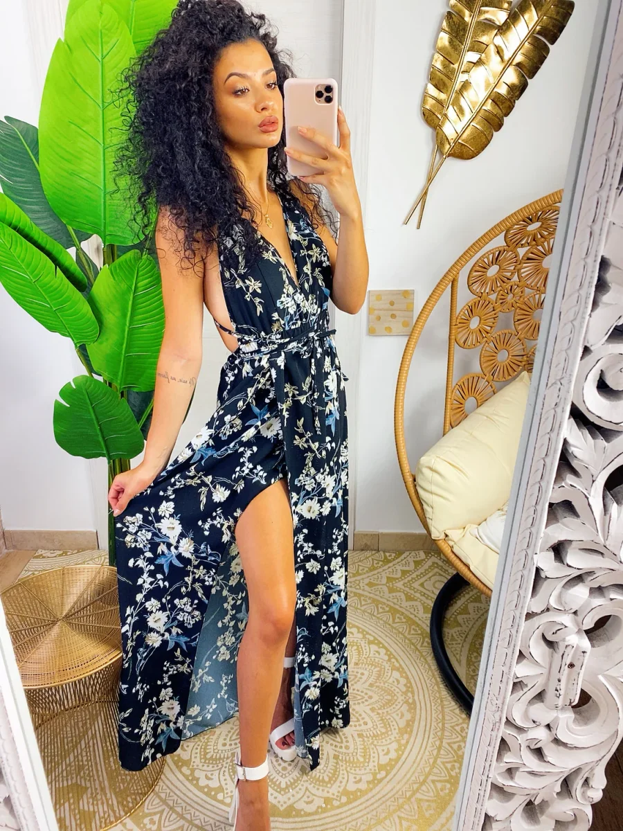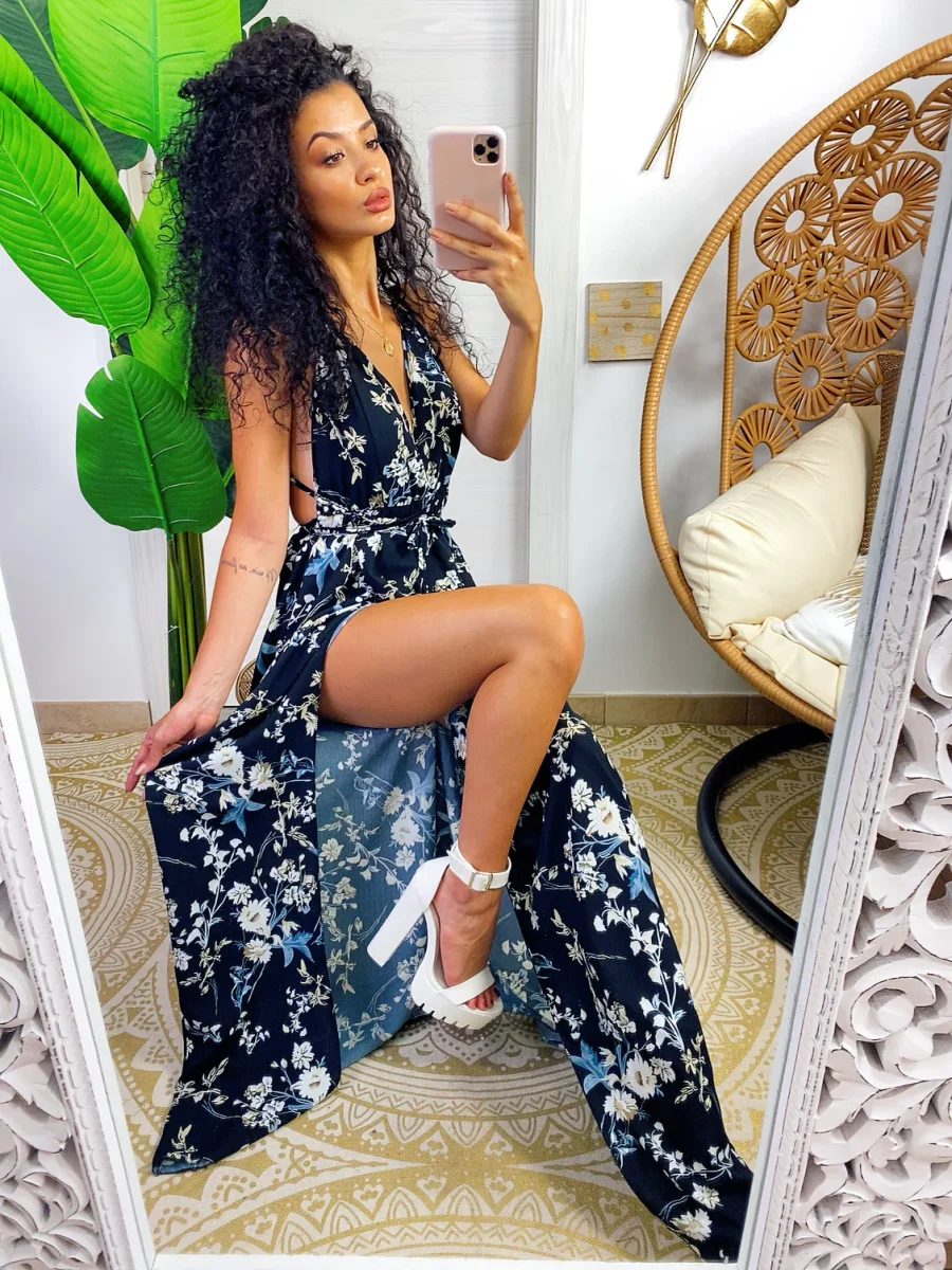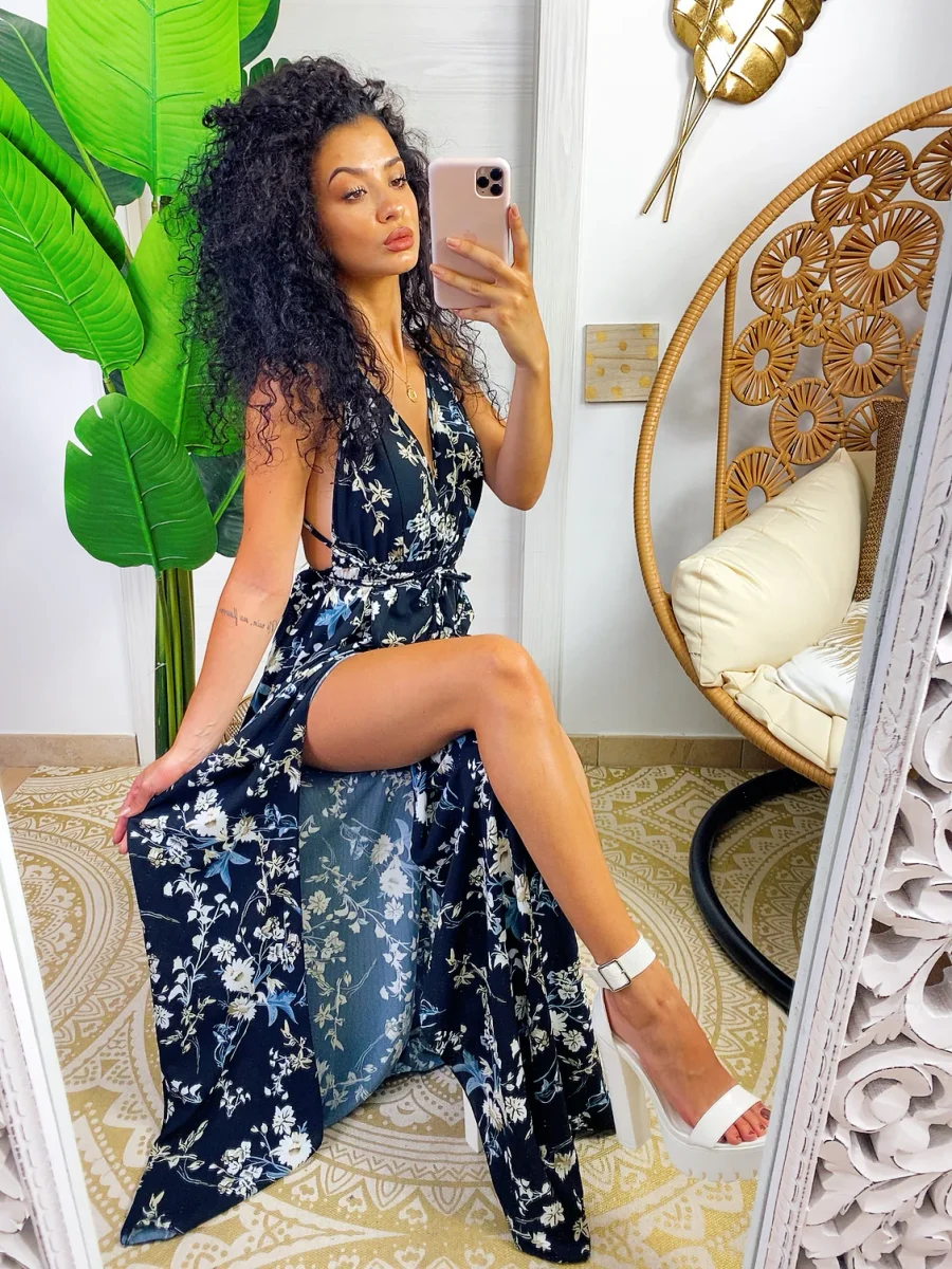 Abito lungo con stampa a fiori dotato di coppe. Bretelle incrociate. Taglia unica tessuto elasticizzato