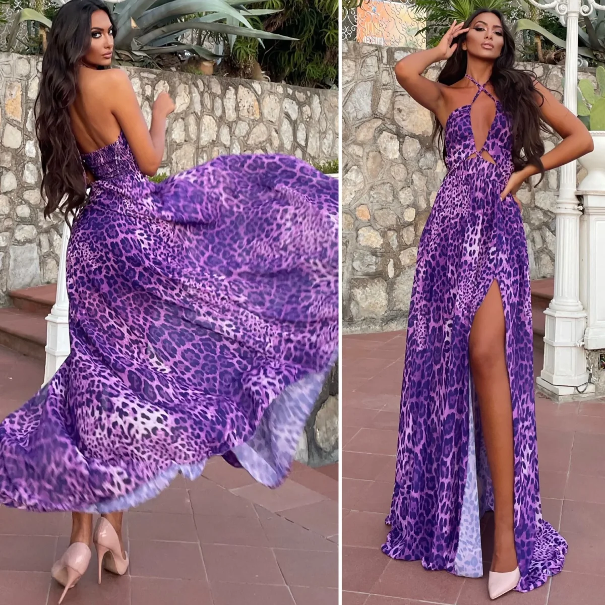 Abito lungo in tessuto animalier con incrocio sul seno senza coppe e maxi spacco. Tessuto foderato