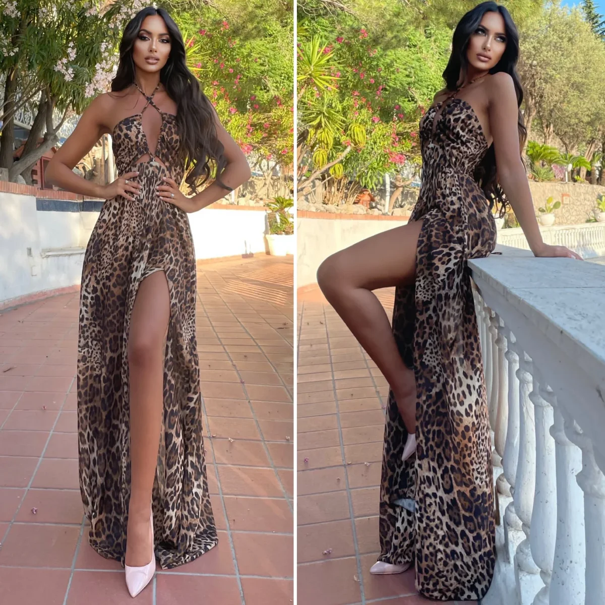 Abito lungo in tessuto animalier con incrocio sul seno senza coppe e maxi spacco. Tessuto foderato